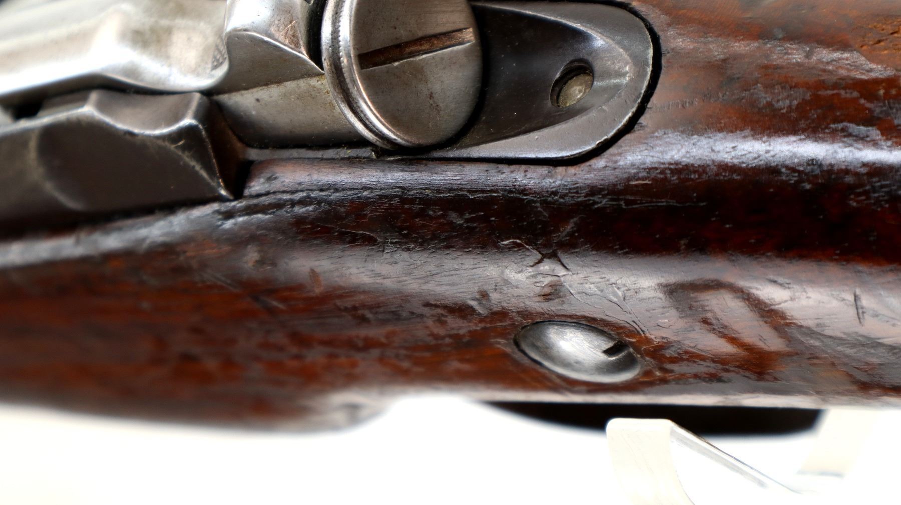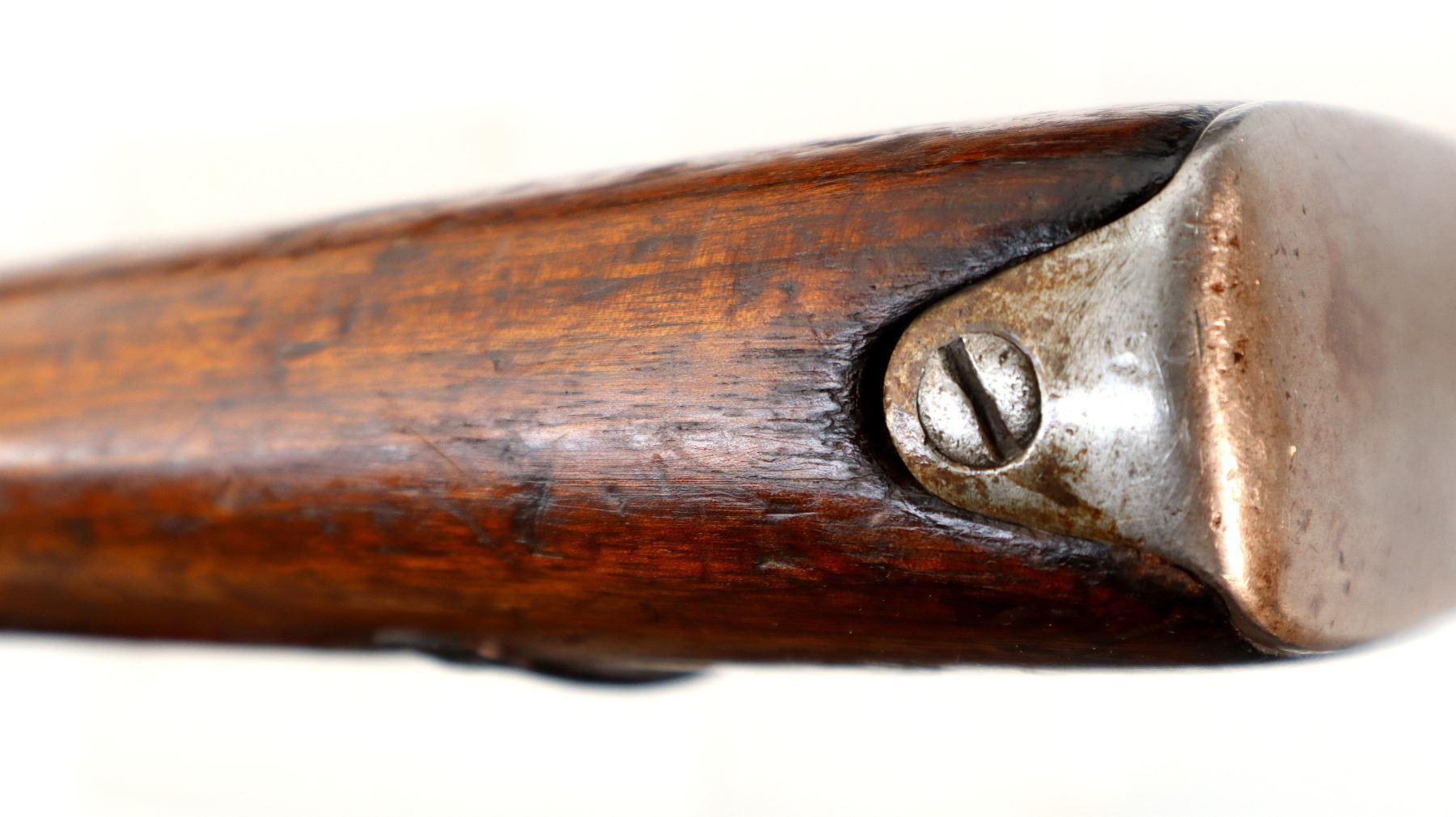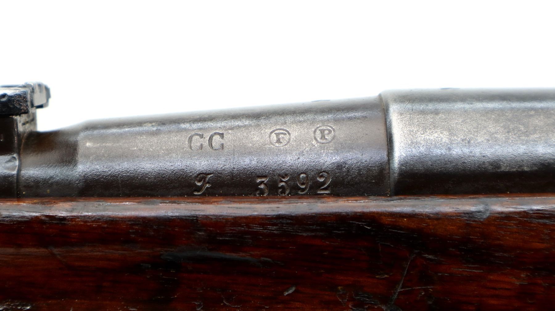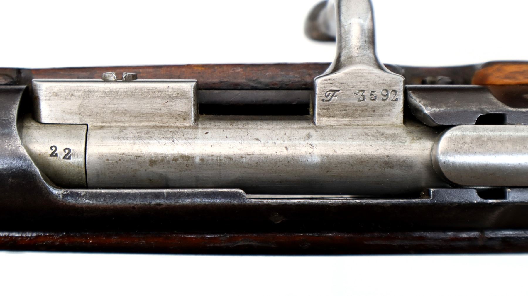 Main Description: Manufactured by St Etienne 1892, visible serial numbers match. Blade front sight with ramp, adjustable u notched rear sight, silver bolt with turned down handle and flat bottomed knob, uses three round stripper clip. One piece full military wood stock, finger grooved forearm, straight grip, smooth steel butt plate, sling swivels, stock has small arsenal repairs, stacking hook, bayonet lug.