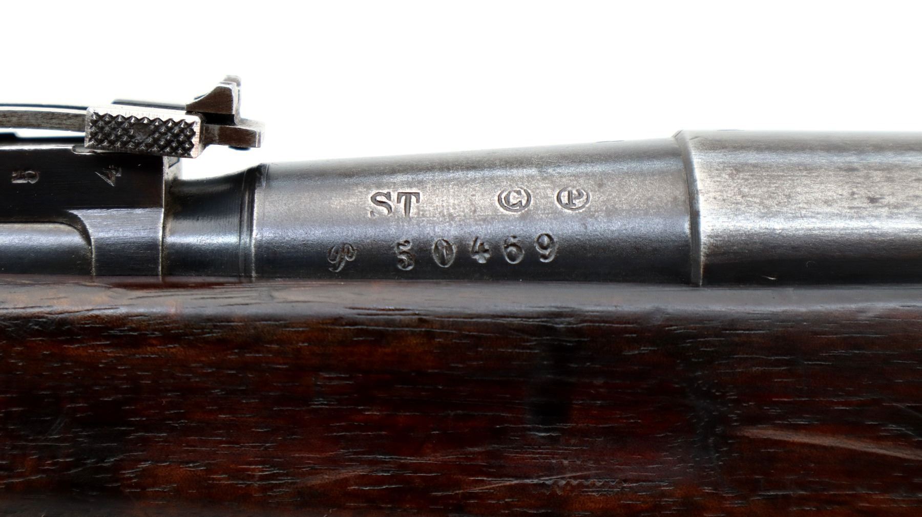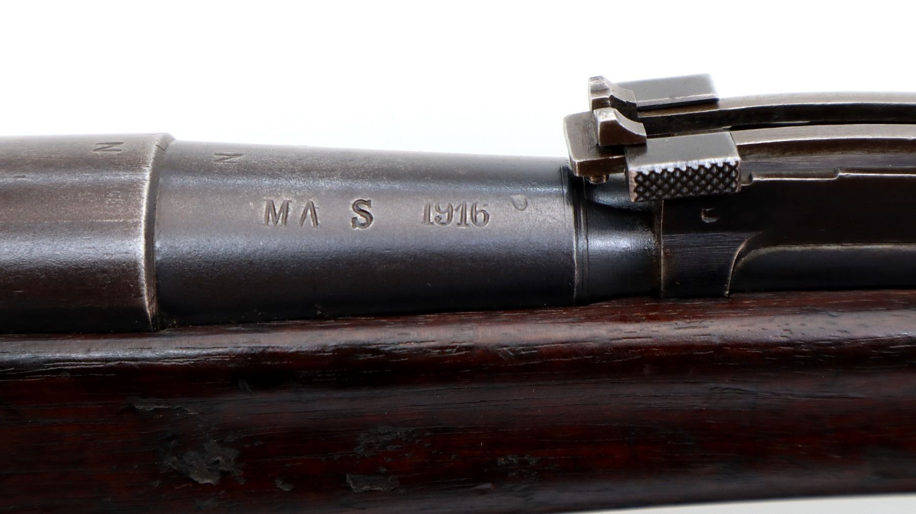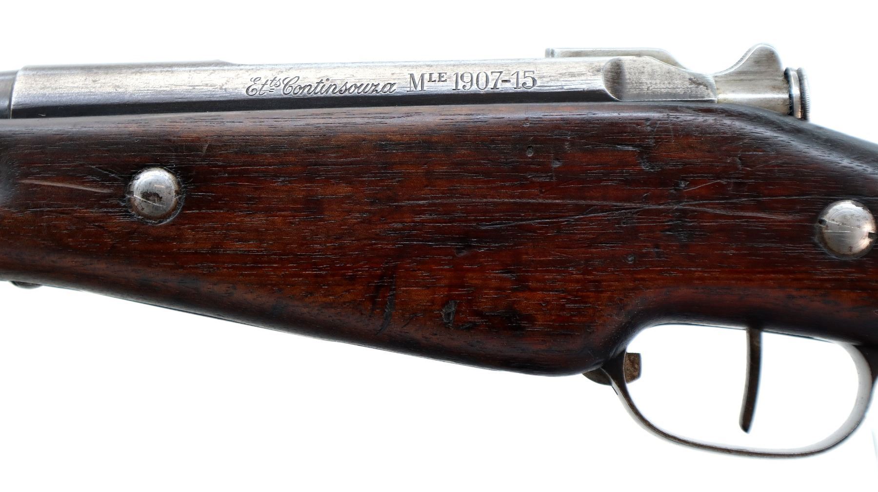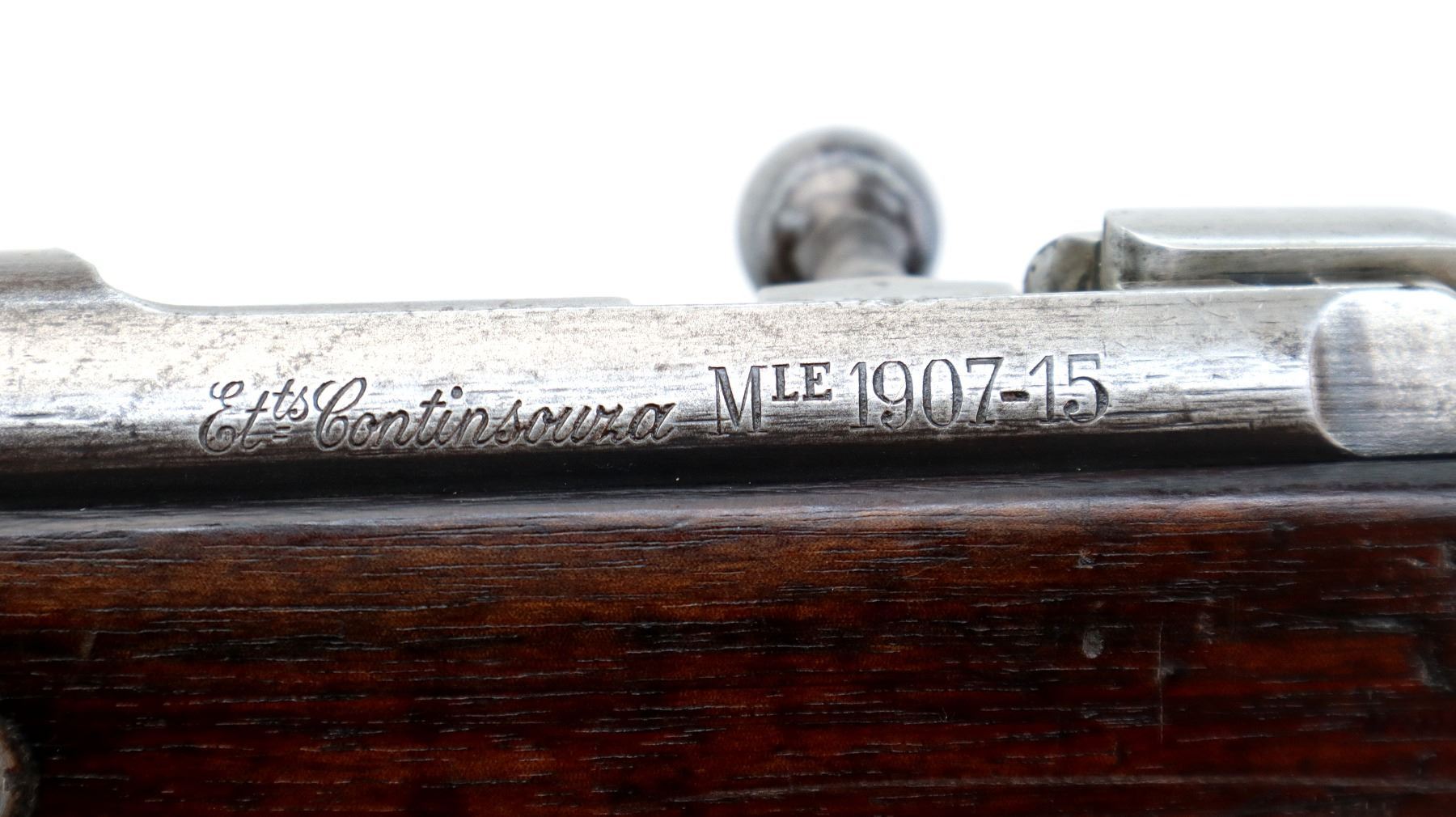 Main Description: Manufactured by St Continsouza 1916, visible numbers match. Block front sight with groove and ramp, adjustable u notched ladder rear sight which is slightly bent, blued finish, silver bolt with straight handle, uses three round stripper clip. One piece full military wood stock, finger grooved forearm, straight grip, smooth steel butt plate, roundel on right side of stock, sling swivels, stacking hook, bayonet lug.