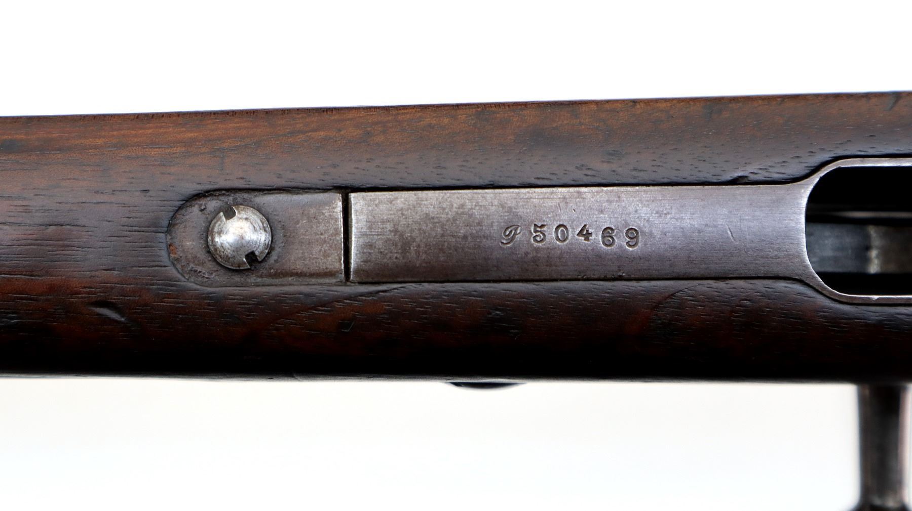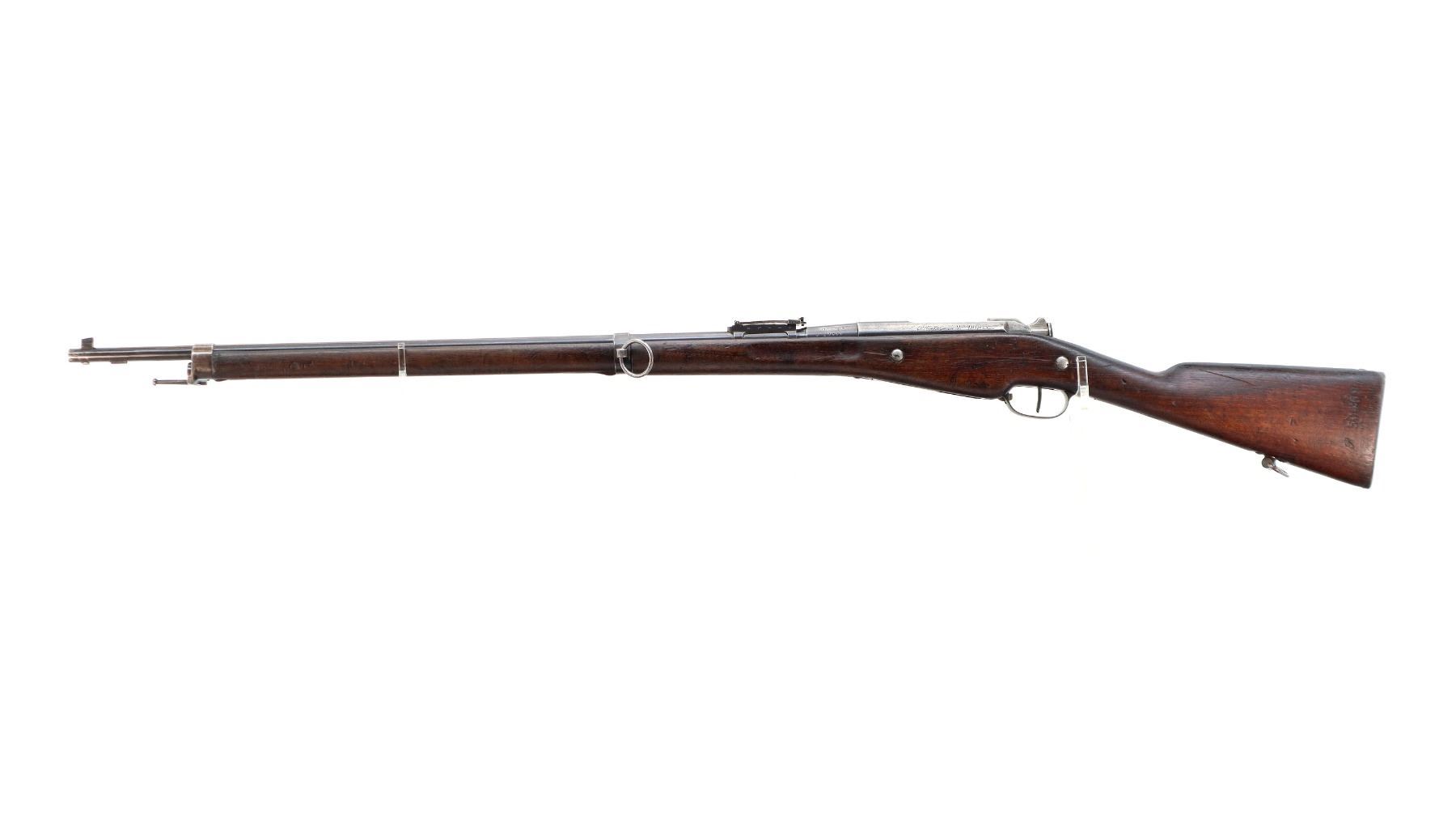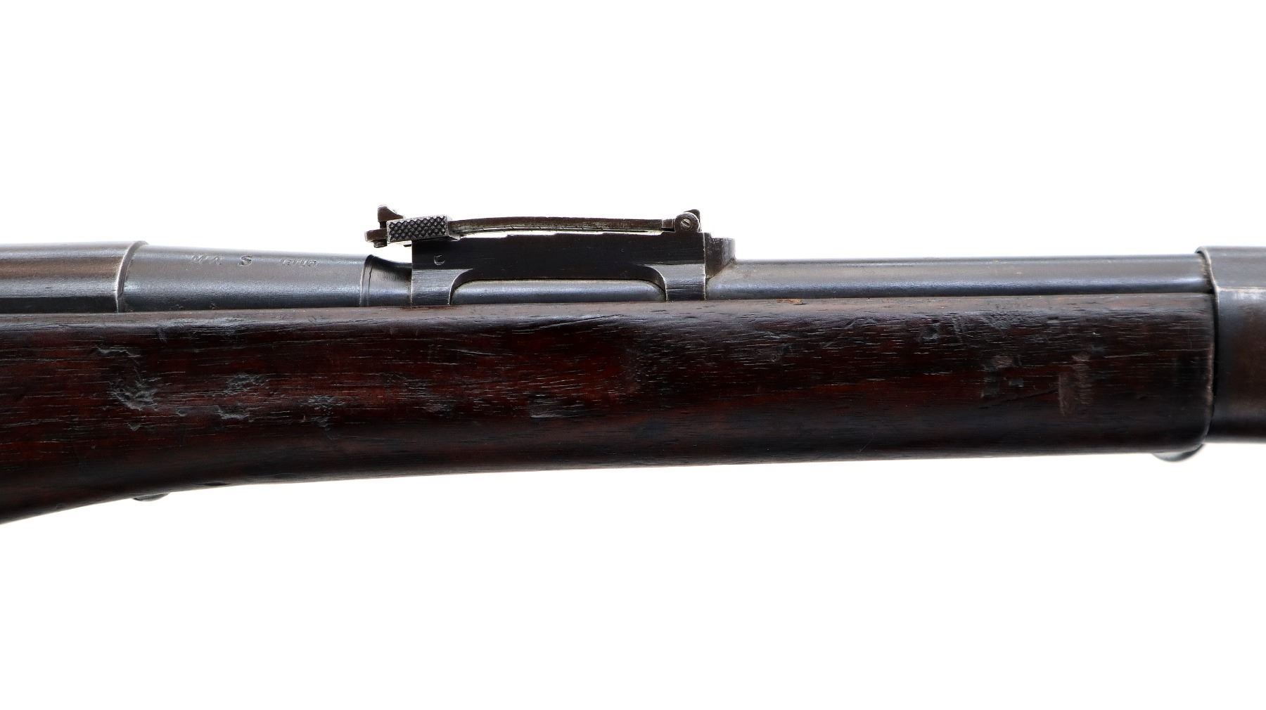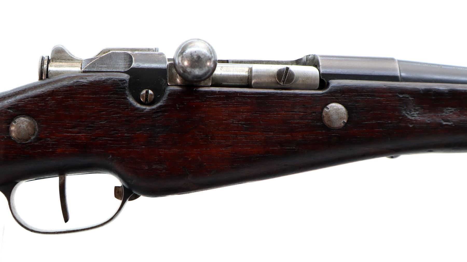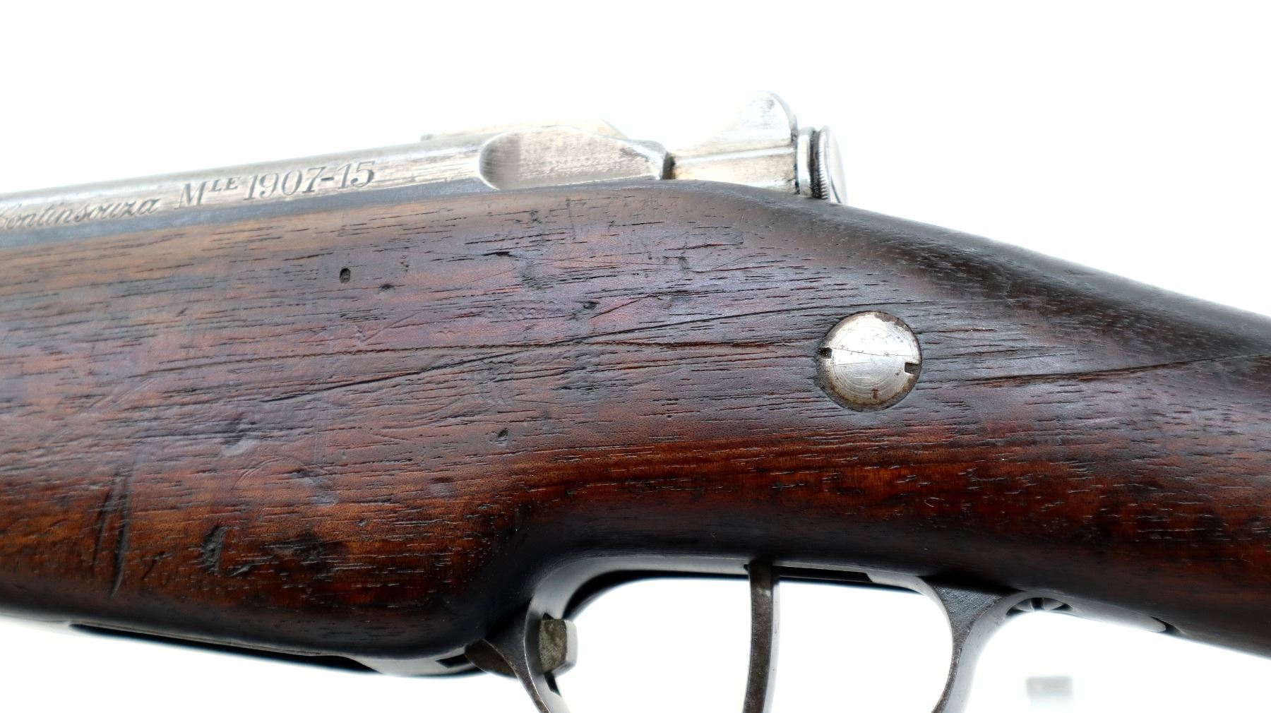 Main Description: Manufactured by St Continsouza 1916, visible numbers match. Block front sight with groove and ramp, adjustable u notched ladder rear sight which is slightly bent, blued finish, silver bolt with straight handle, uses three round stripper clip. One piece full military wood stock, finger grooved forearm, straight grip, smooth steel butt plate, roundel on right side of stock, sling swivels, stacking hook, bayonet lug.