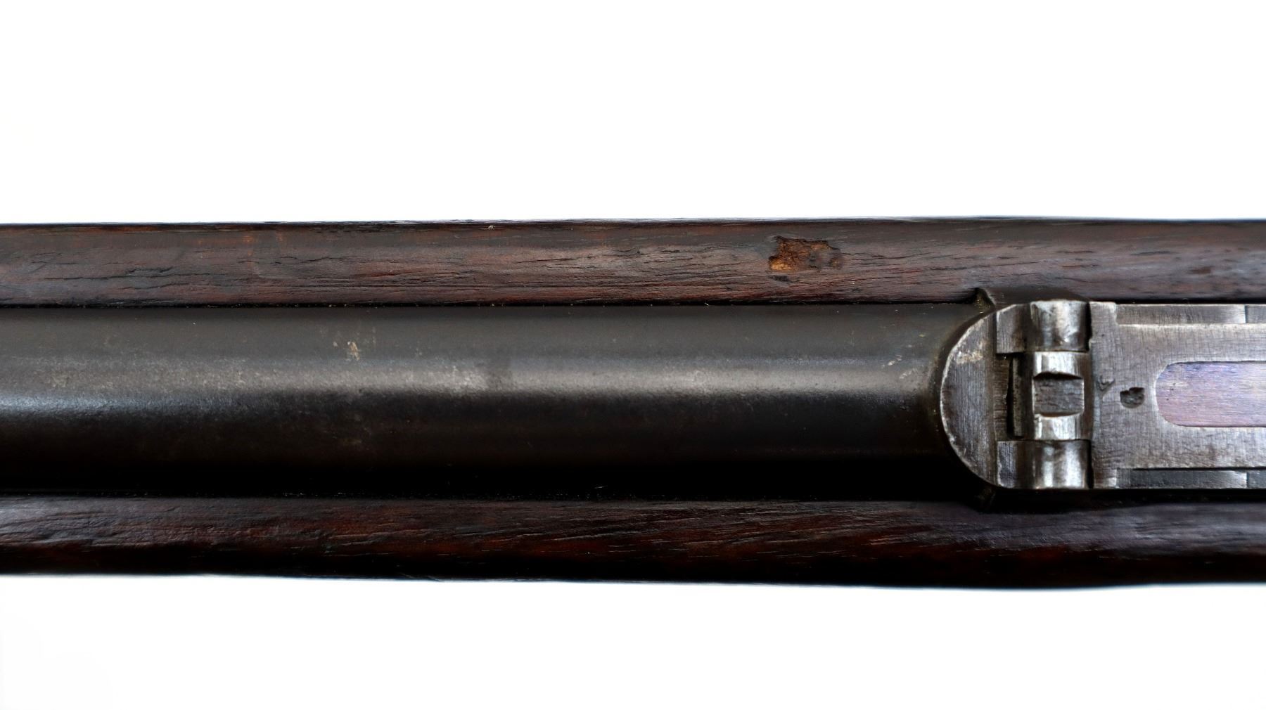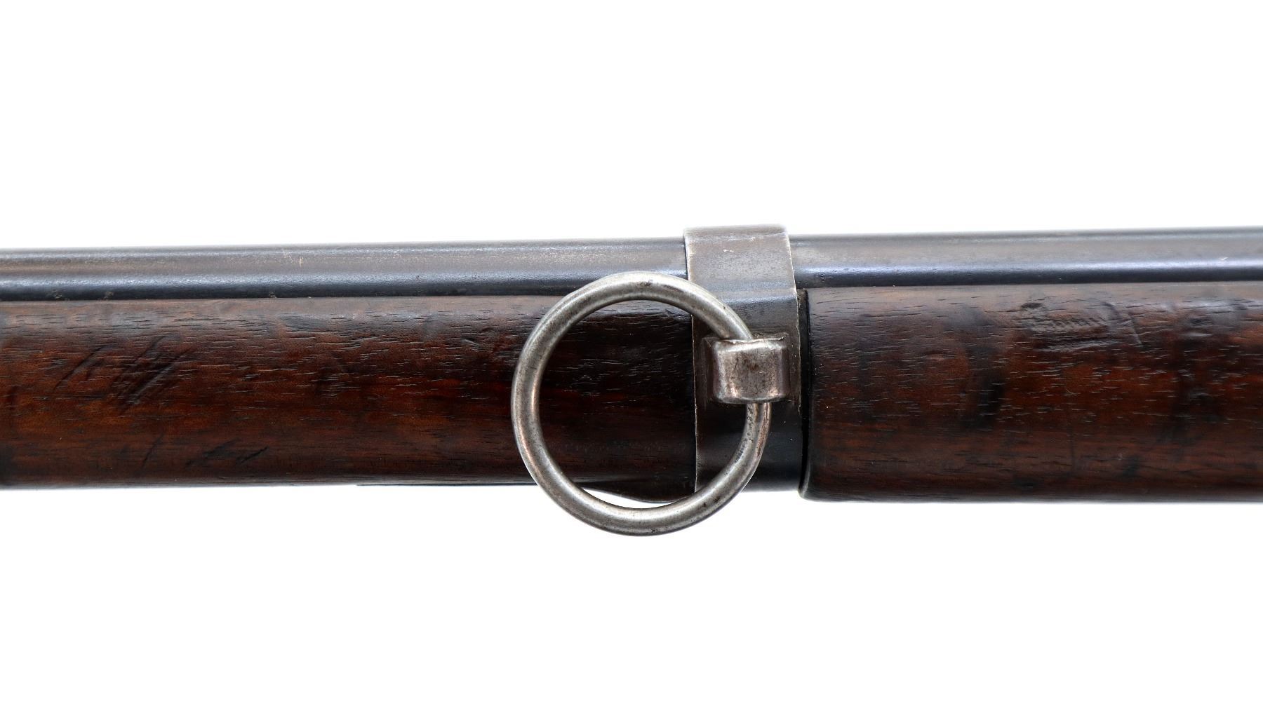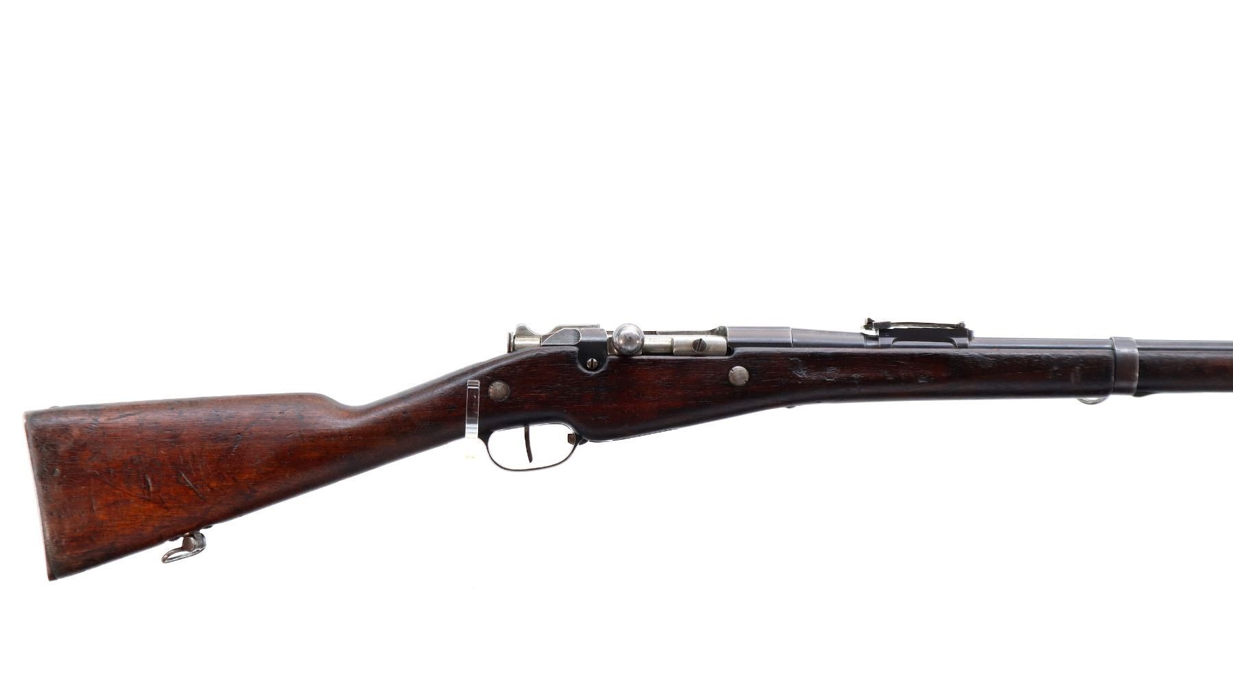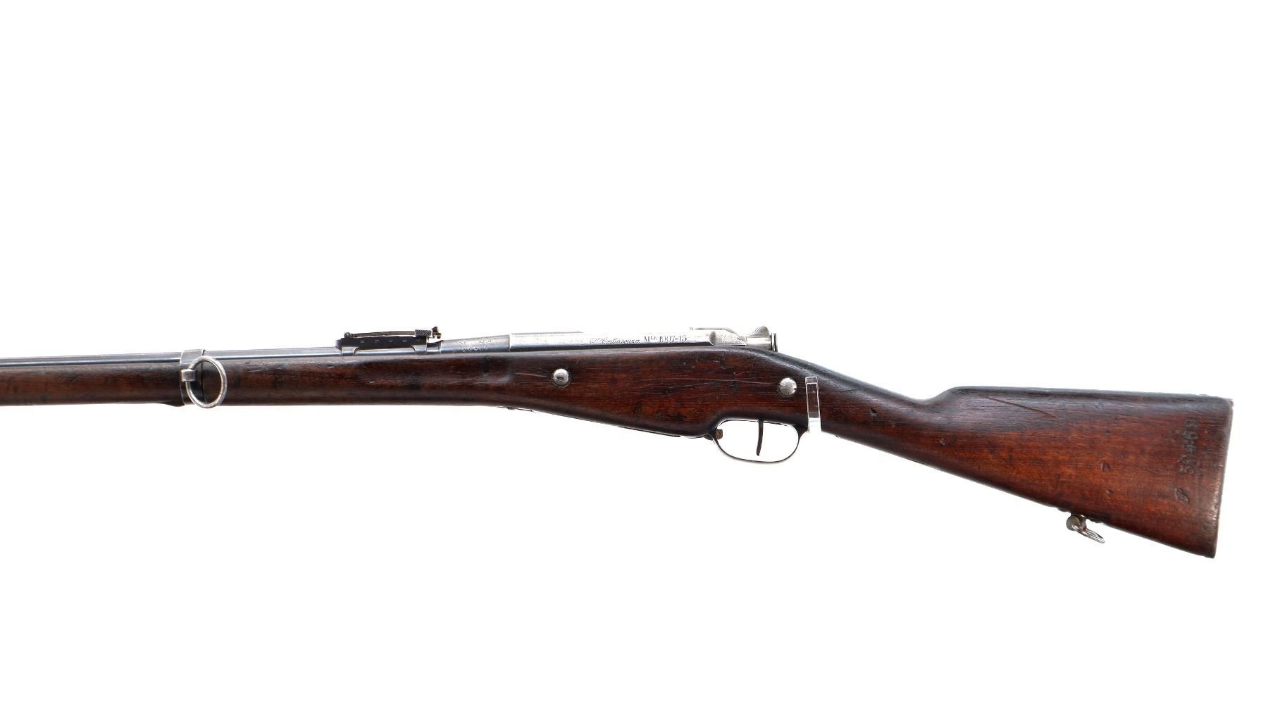Main Description: Manufactured by St Continsouza 1916, visible numbers match. Block front sight with groove and ramp, adjustable u notched ladder rear sight which is slightly bent, blued finish, silver bolt with straight handle, uses three round stripper clip. One piece full military wood stock, finger grooved forearm, straight grip, smooth steel butt plate, roundel on right side of stock, sling swivels, stacking hook, bayonet lug.