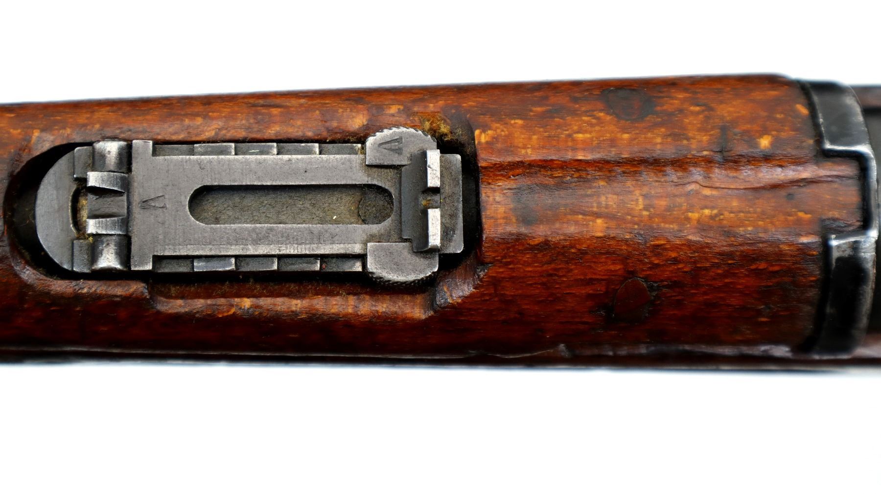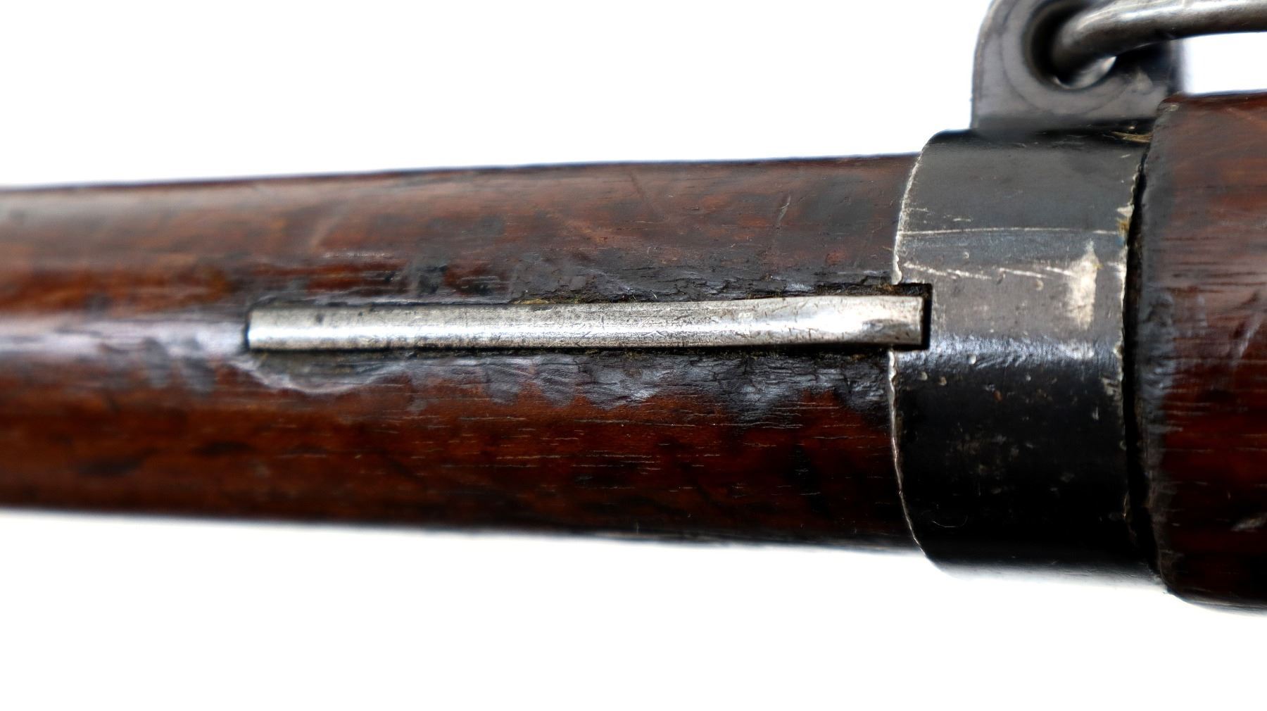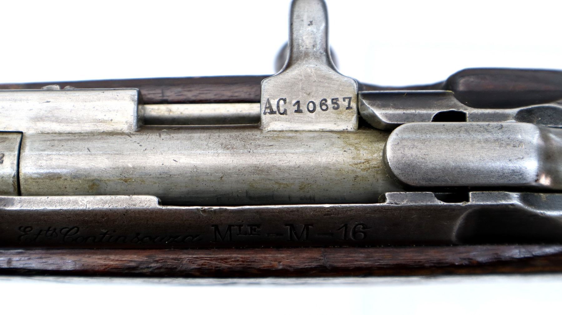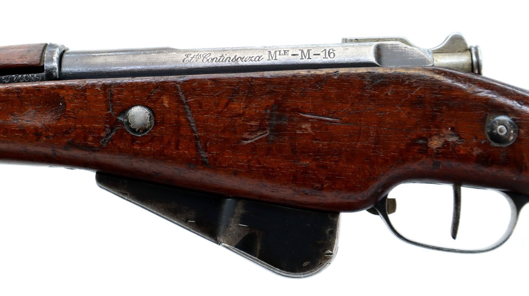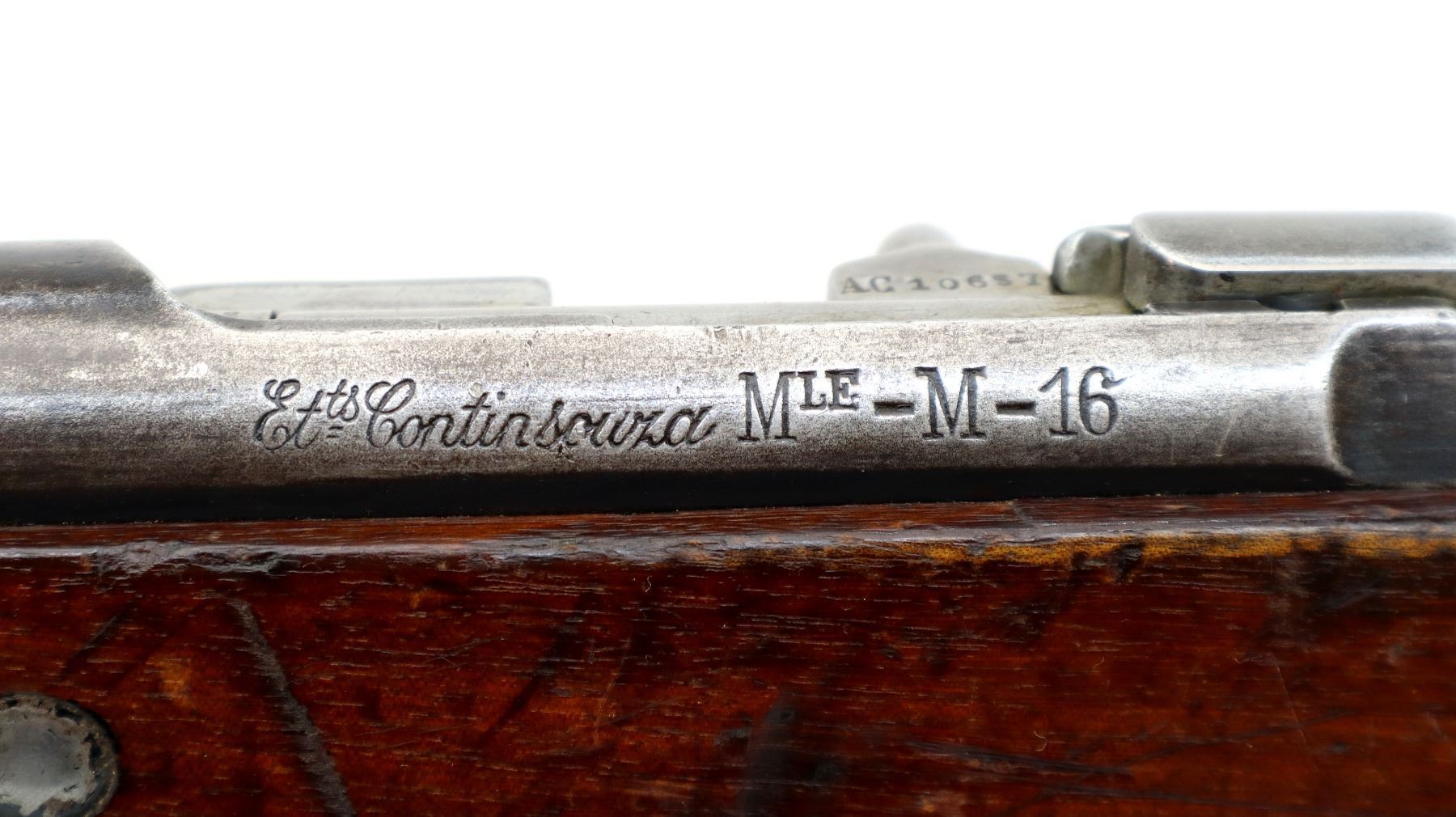 Main Description: Manufactured by St. Continsouza, bolt mismatched. Block front sight with groove and ramp, adjustable u notched rear sight, blued finish, turned down bolt handle with flat bottomed knob, extended five round stripper clip. Two piece full military wood stocks, finger grooved forearm, straight grip, smooth steel butt plate, sling swivels, stacking hook, bayonet lug.