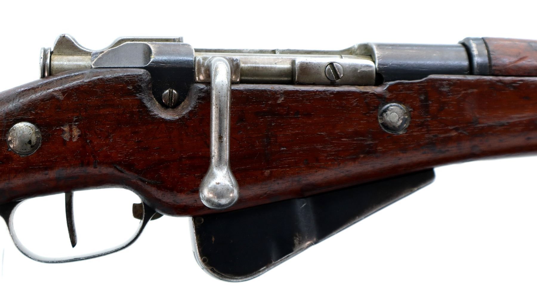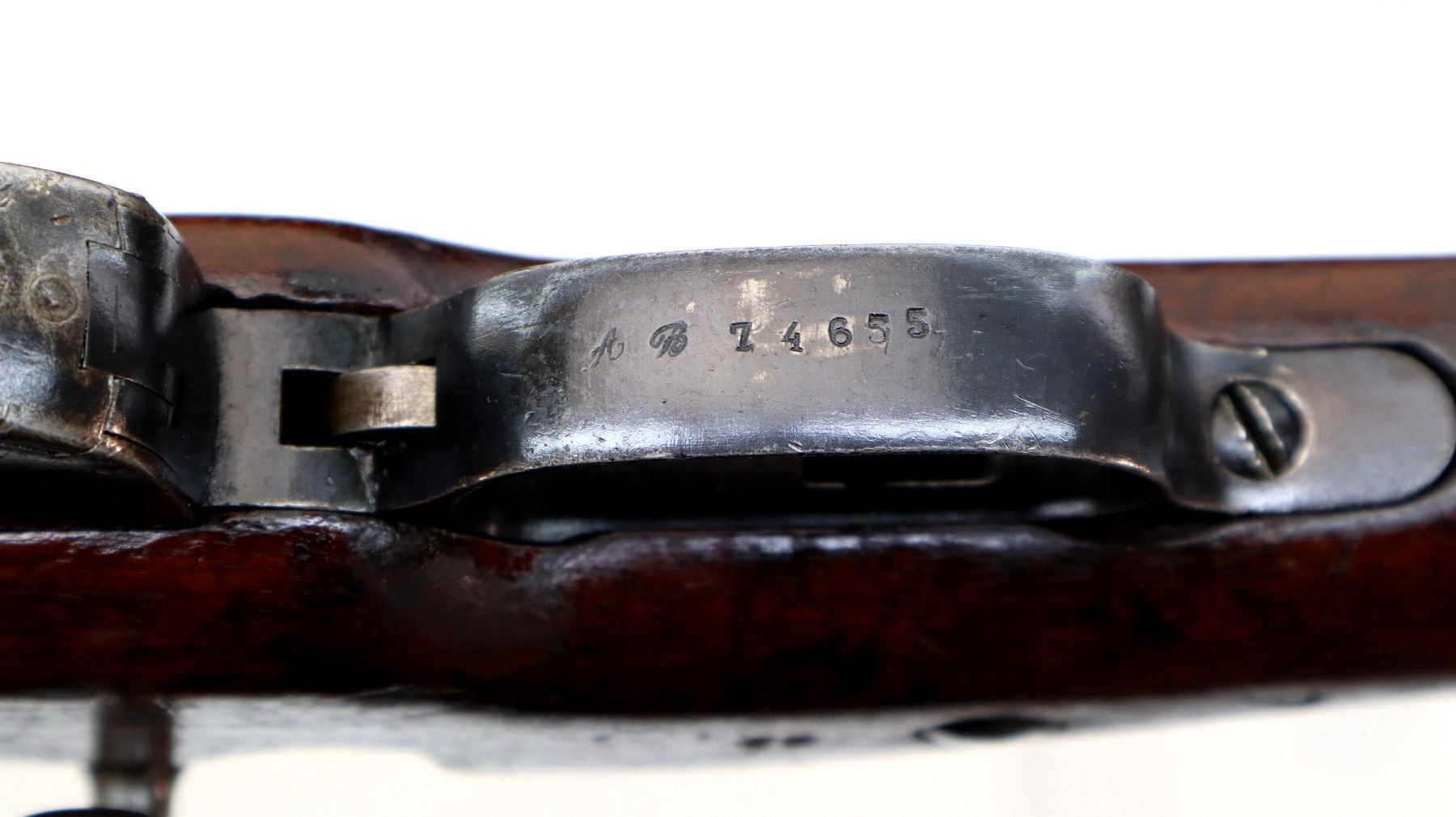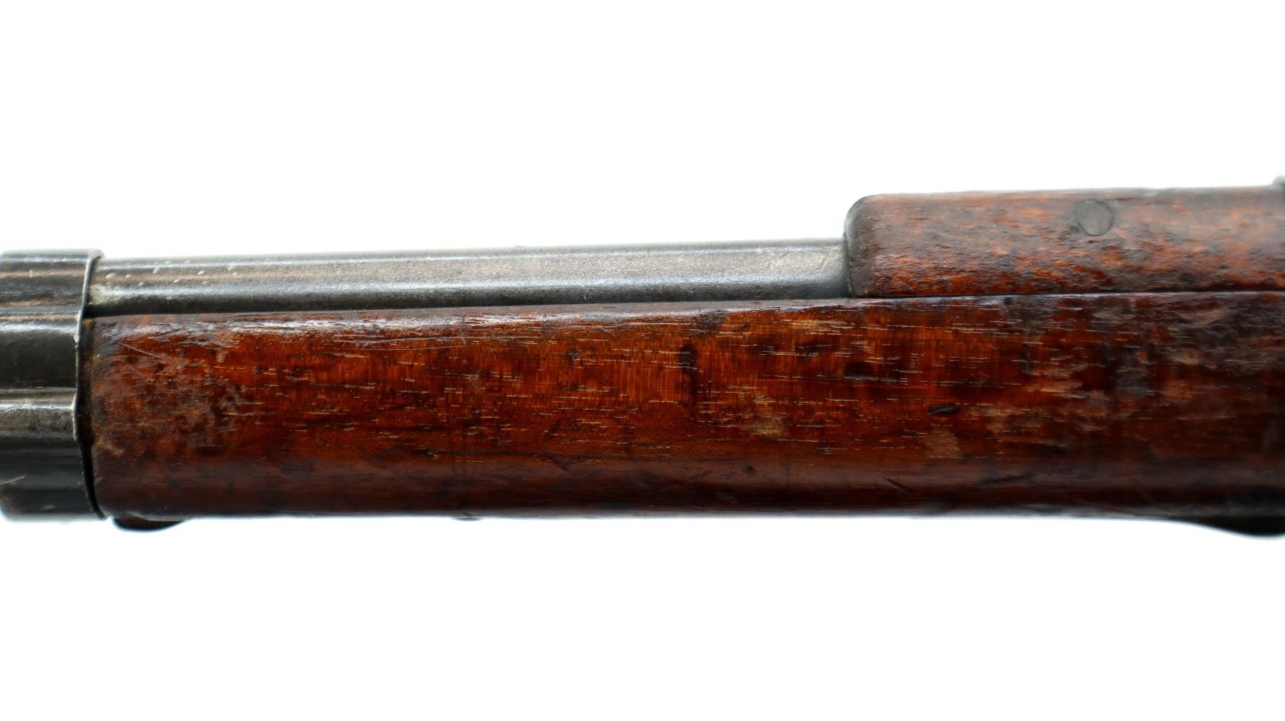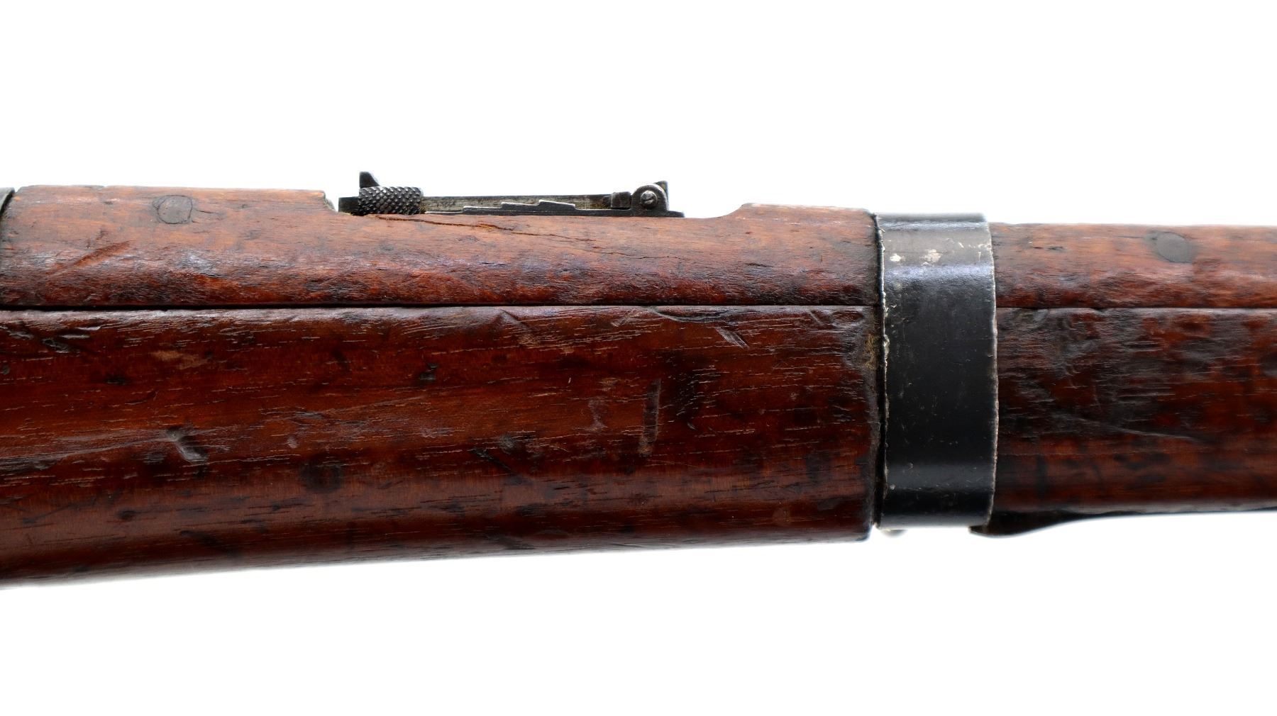 Main Description: Manufactured by St. Continsouza, bolt mismatched. Block front sight with groove and ramp, adjustable u notched rear sight, blued finish, turned down bolt handle with flat bottomed knob, extended five round stripper clip. Two piece full military wood stocks, finger grooved forearm, straight grip, smooth steel butt plate, sling swivels, stacking hook, bayonet lug.