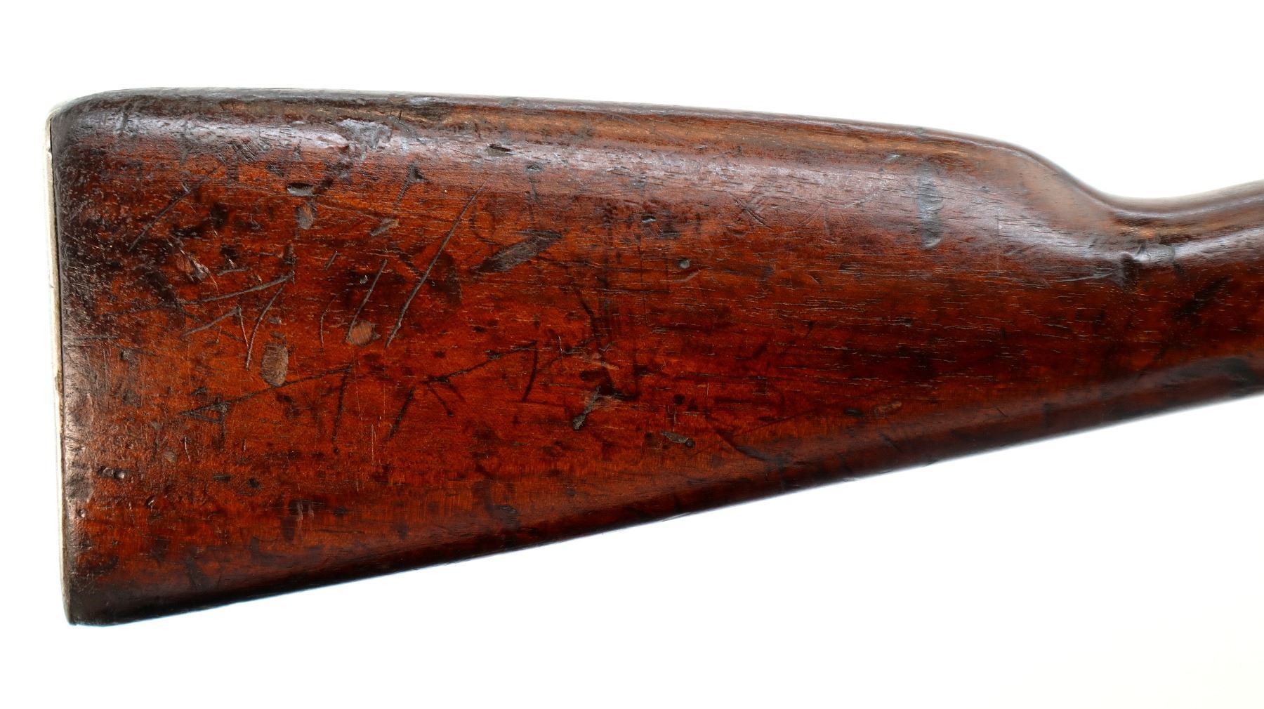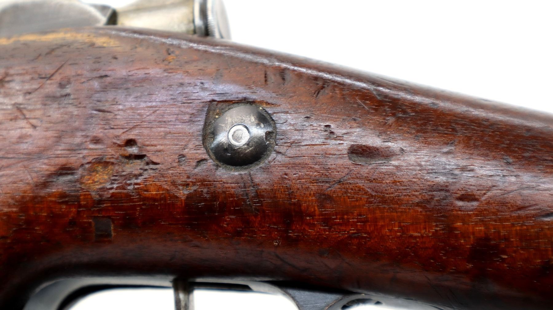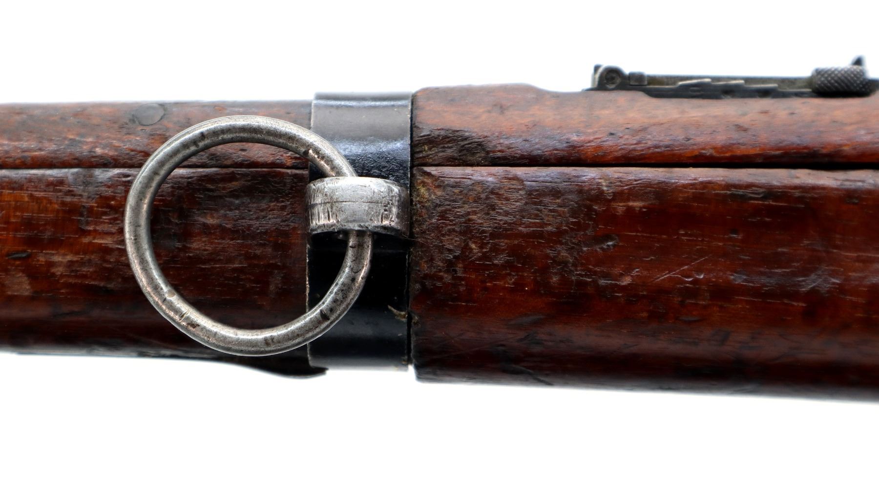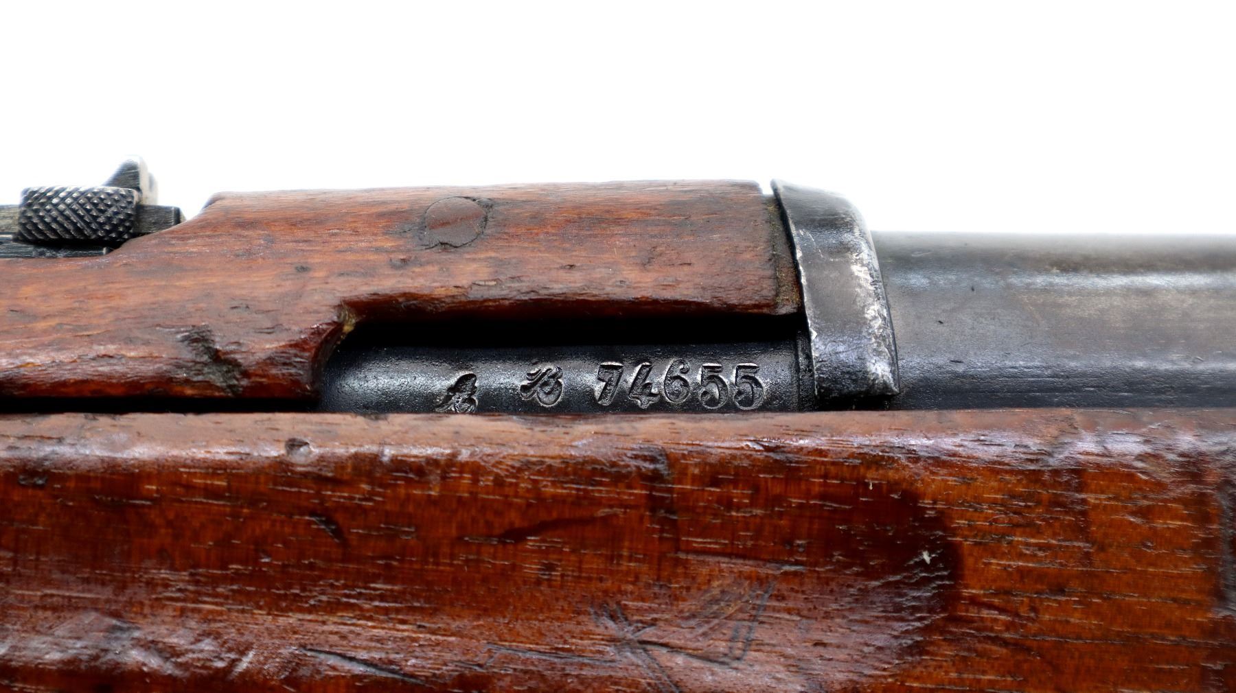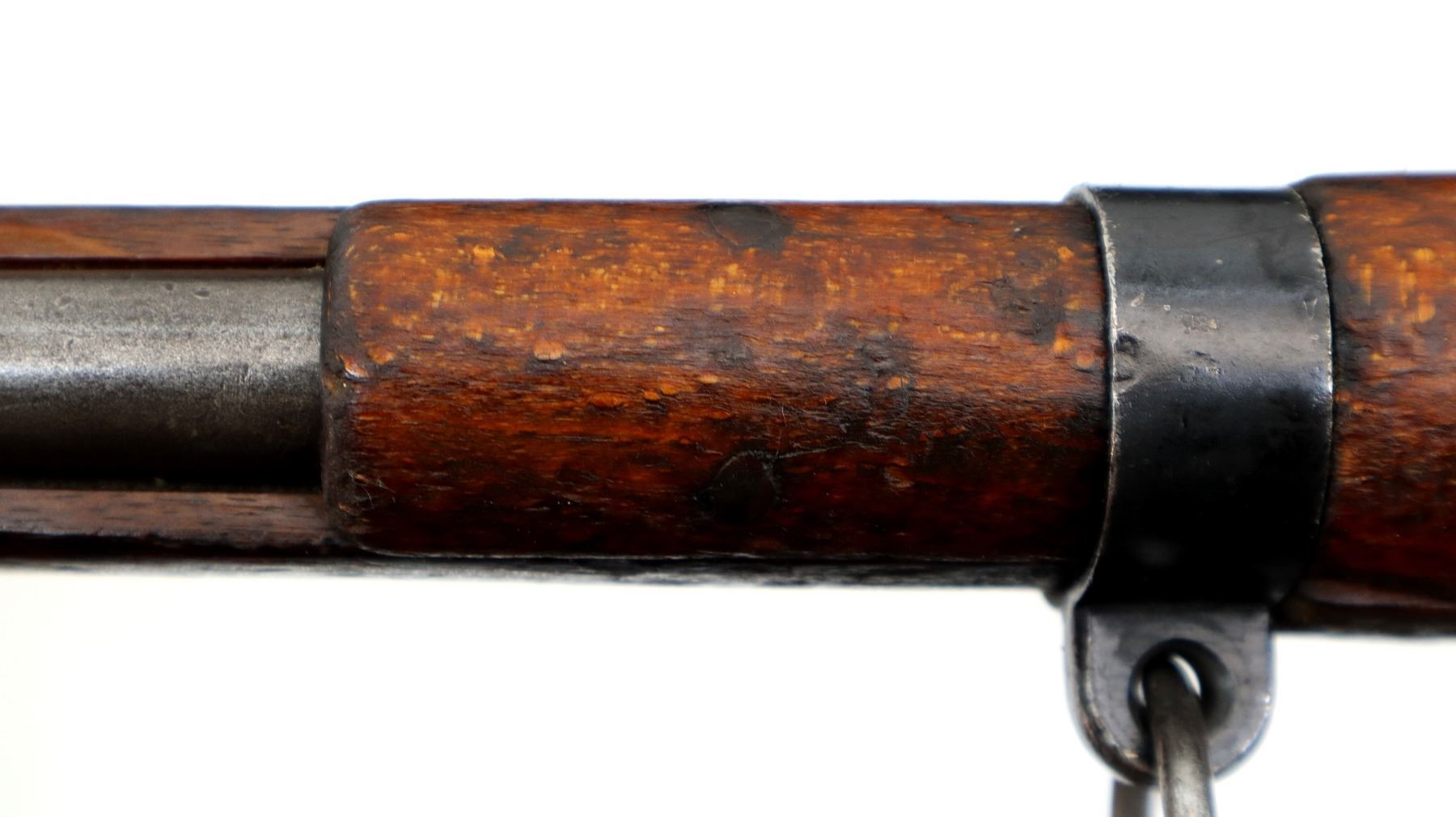 Main Description: Manufactured by St. Continsouza, bolt mismatched. Block front sight with groove and ramp, adjustable u notched rear sight, blued finish, turned down bolt handle with flat bottomed knob, extended five round stripper clip. Two piece full military wood stocks, finger grooved forearm, straight grip, smooth steel butt plate, sling swivels, stacking hook, bayonet lug.