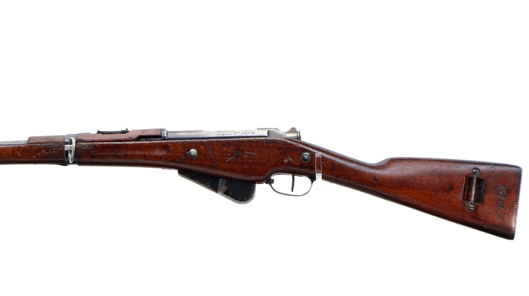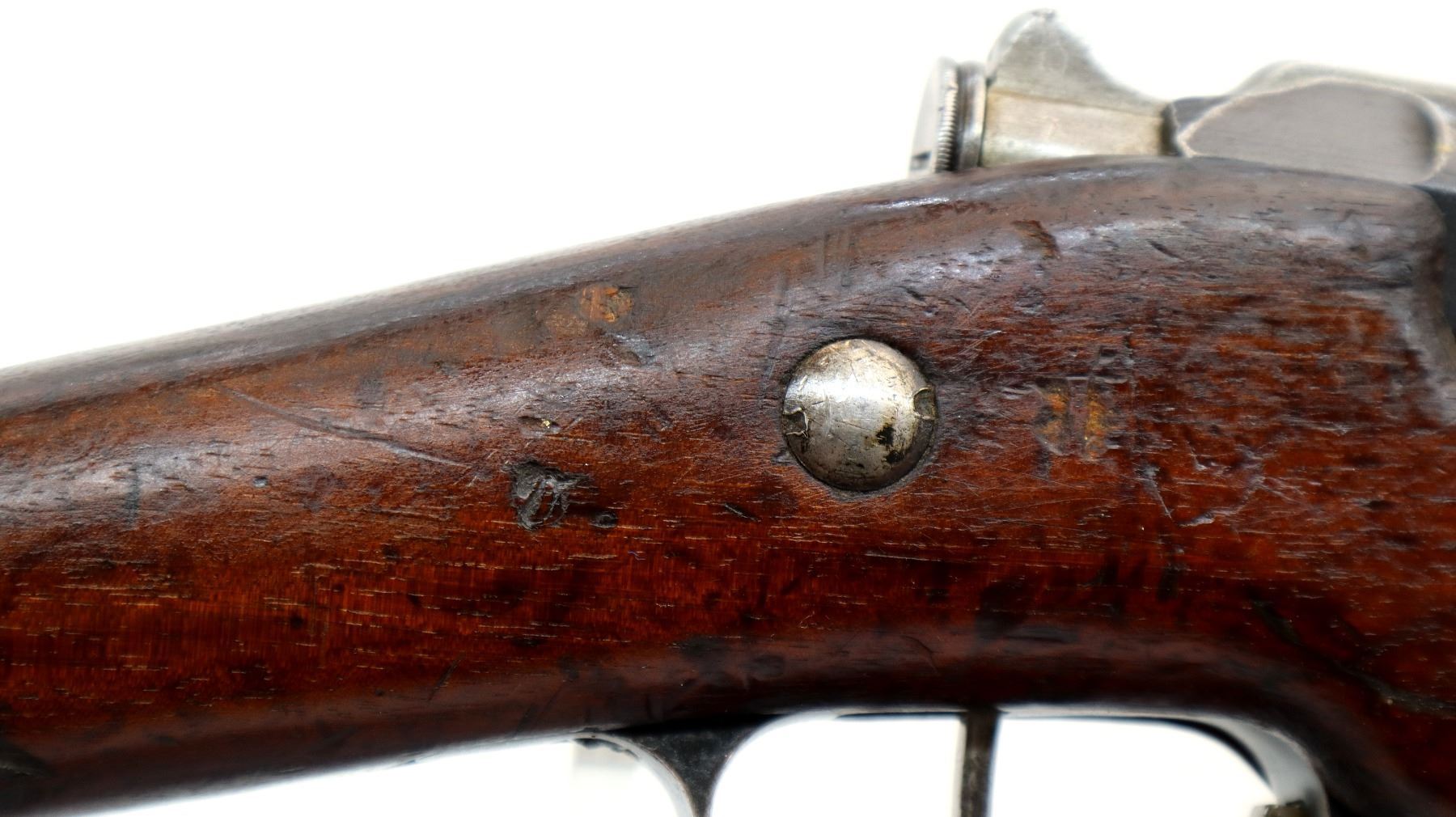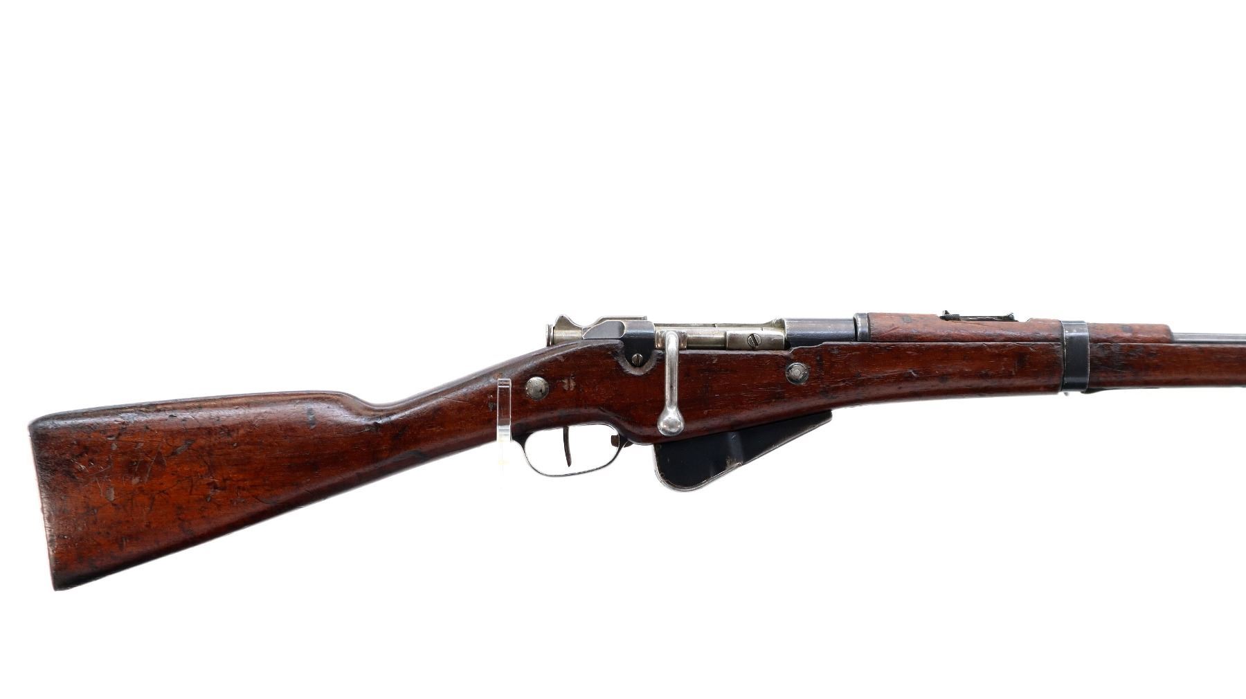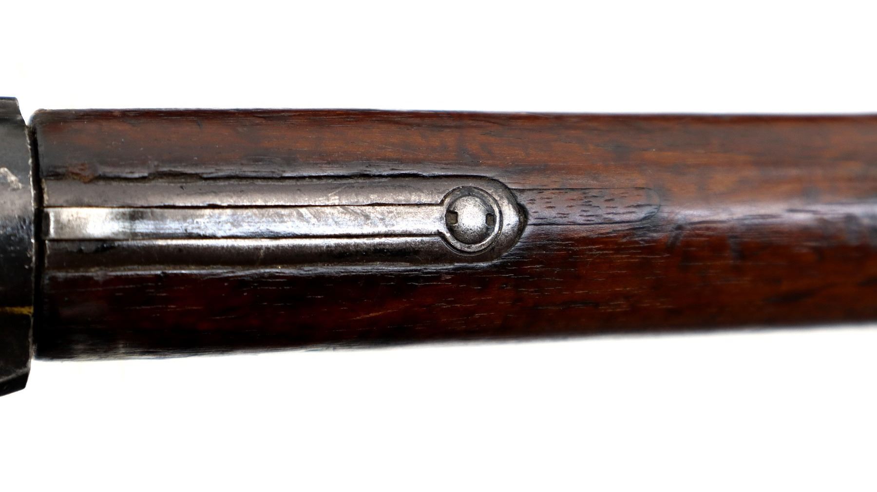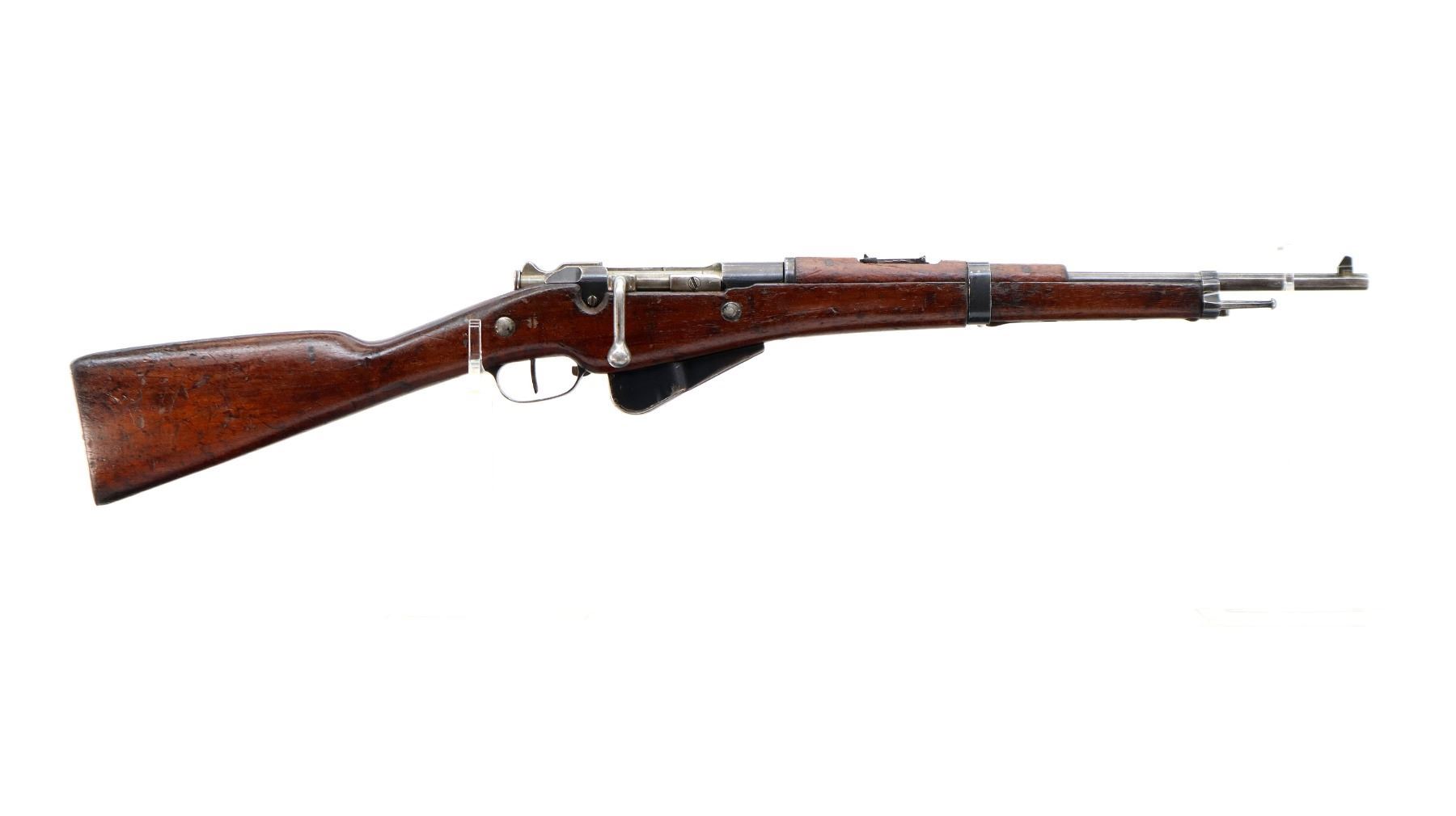 Main Description: Manufactured by St. Continsouza, bolt mismatched. Block front sight with groove and ramp, adjustable u notched rear sight, blued finish, turned down bolt handle with flat bottomed knob, extended five round stripper clip. Two piece full military wood stocks, finger grooved forearm, straight grip, smooth steel butt plate, sling swivels, stacking hook, bayonet lug.