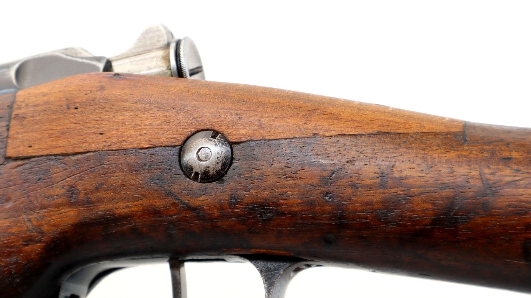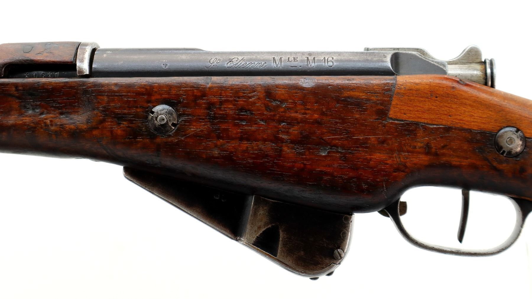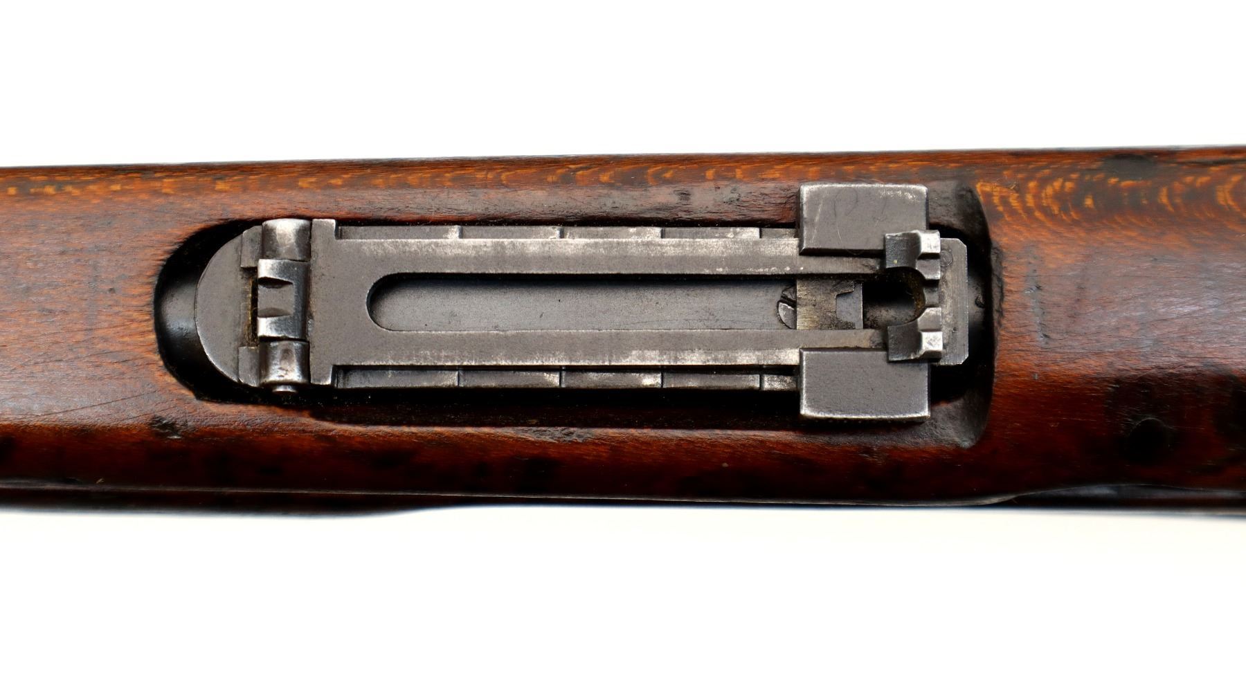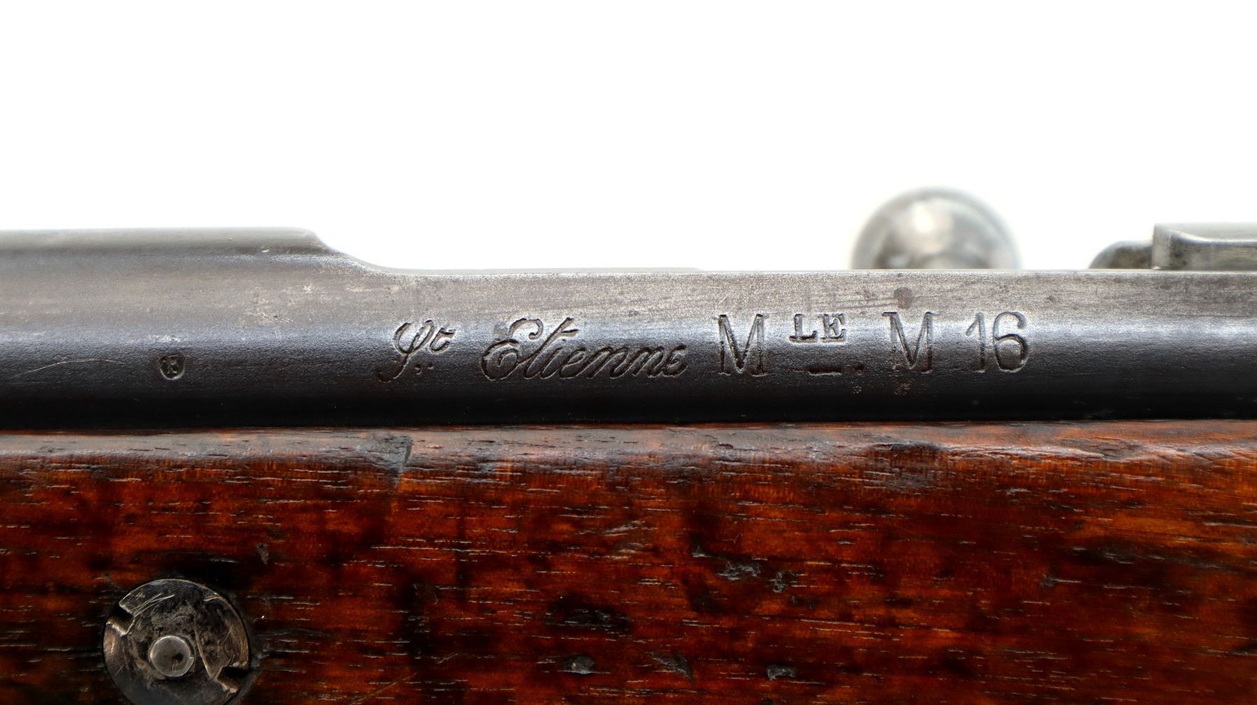 Main Description: Manufactured by St Etienne, bolt mismatched. Block front sight with groove and ramp, adjustable u notched rear sight, blued finish, five round stripper clip, silver bolt with straight handle. Two piece full military wood stock, finger grooved forearm, straight grip, smooth steel butt plate, stock has various arsenal repairs, sling swivels, stacking hook, bayonet lug.