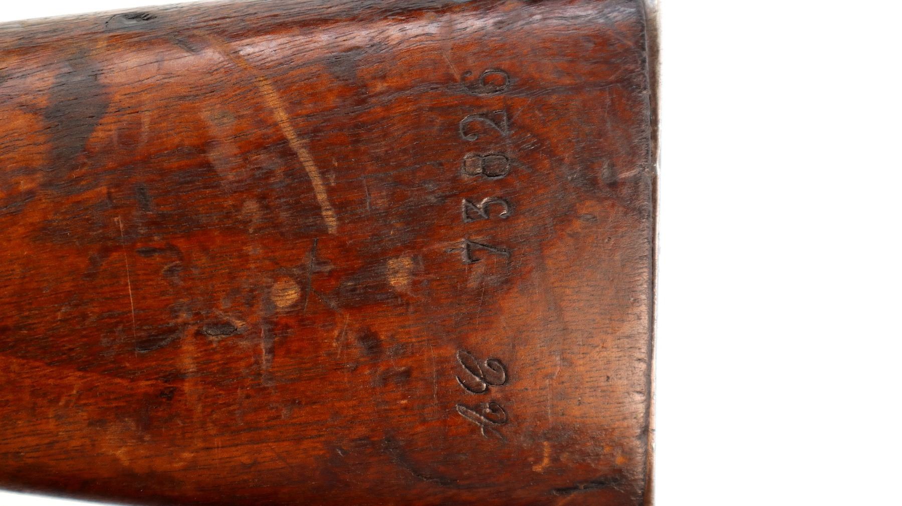 Main Description: Manufactured by St Etienne, stock matches bolt does not. Blade front sight, adjustable u notched rear sight, blued finish, hex receiver, silver bolt with straight handle and large knob. Two piece full military wood stocks, straight grip, smooth steel butt plate, sling swivels, bayonet lug. No cleaning rod or Nose Cap