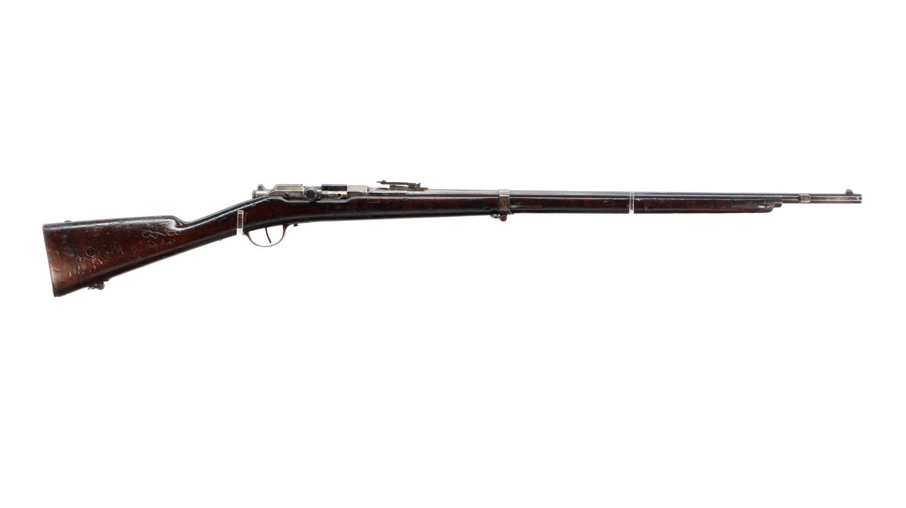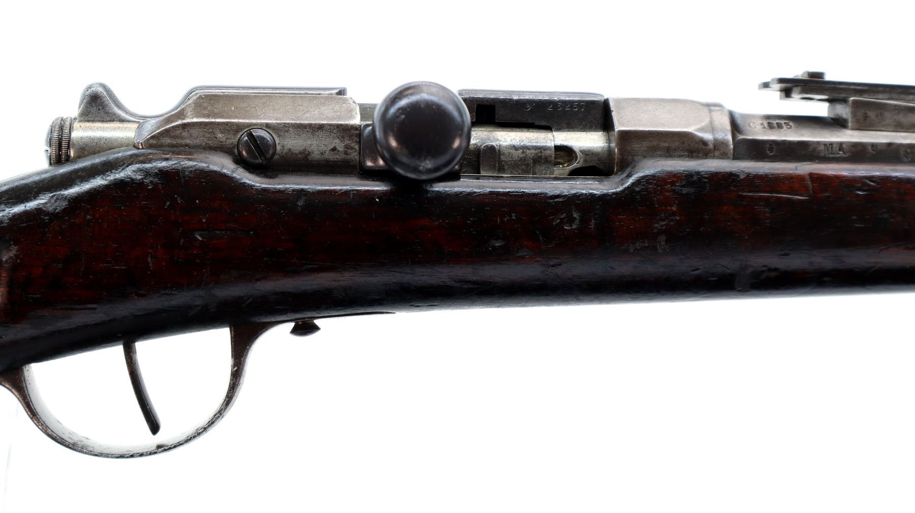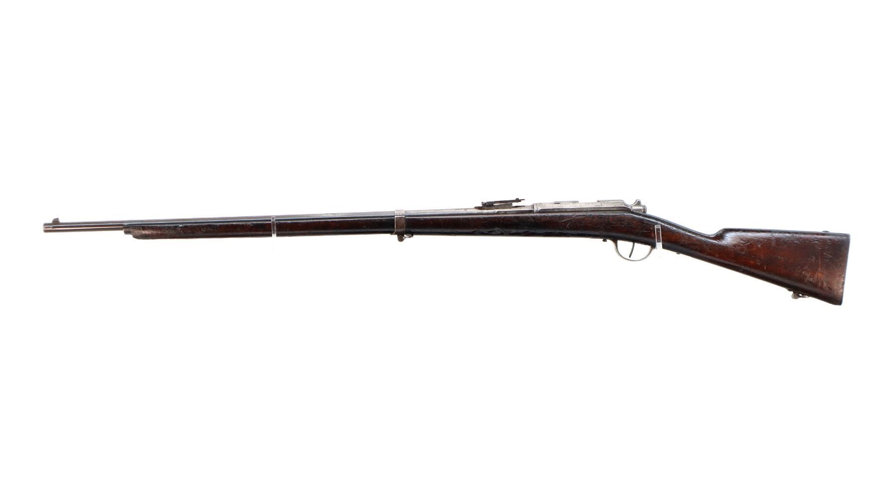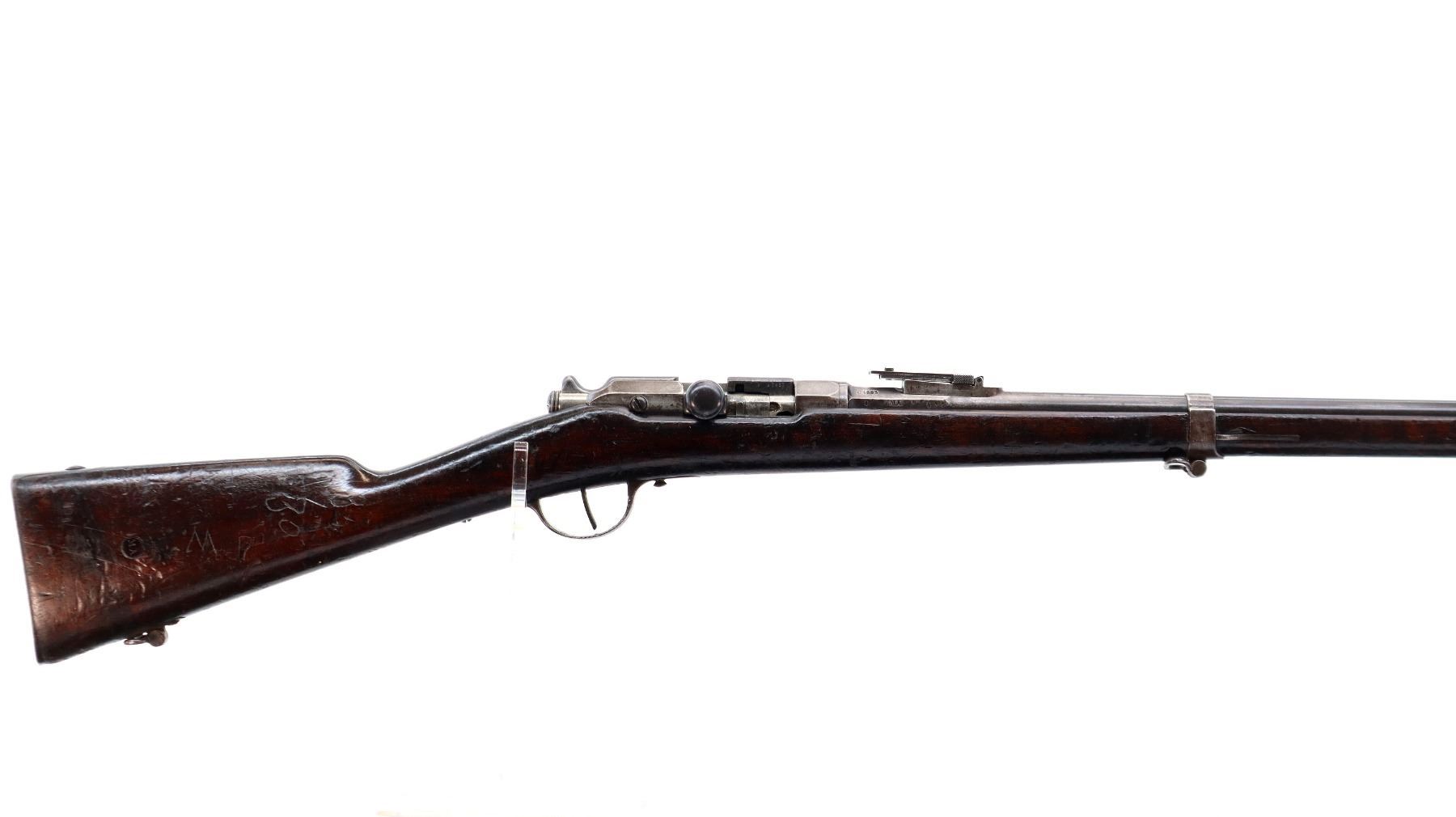 Main Description: Manufactured by Chatellerault 1883, serial numbers mismatched. Blade front sight with ramp, adjustable u notched ladder rear sight, tapered round barrel, hex receiver, straight bolt handle with large knob, extractor is present. One piece full military wood stock, missing nose cap, straight grip cracked behind receiver, smooth steel butt plate, sling swivels, bayonet lug, missing ramrod.