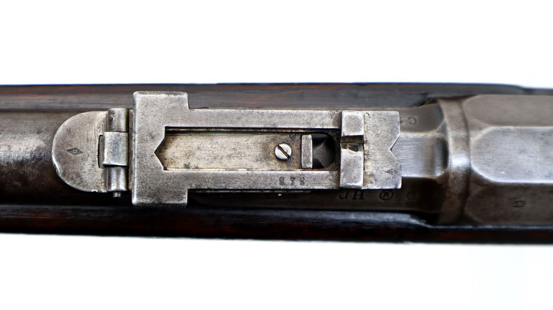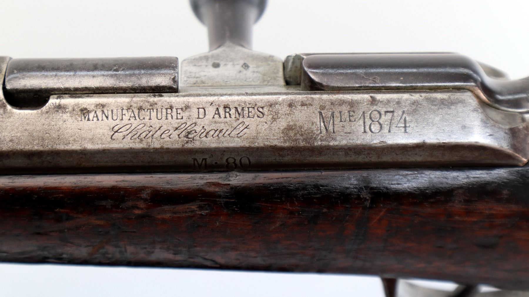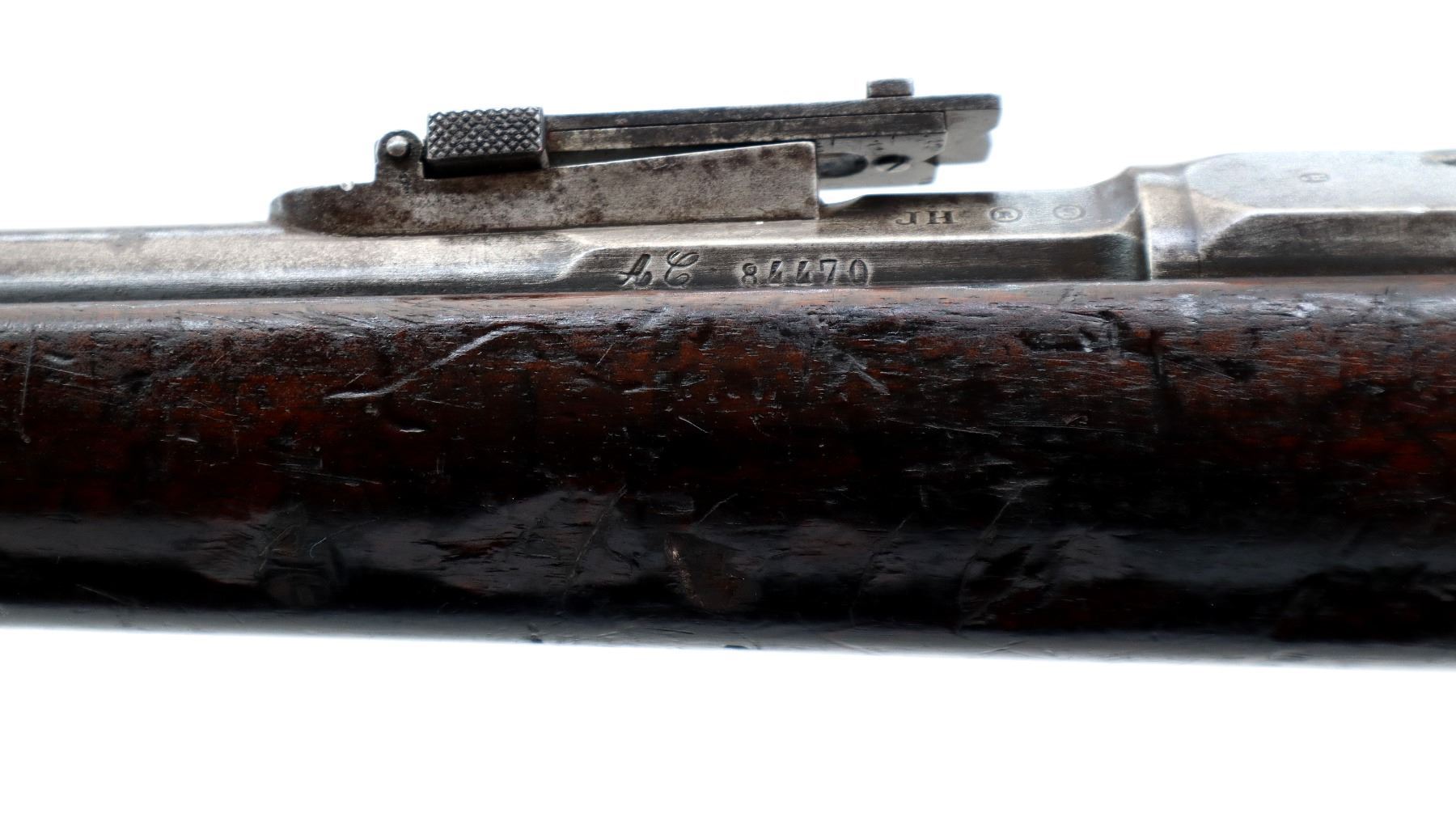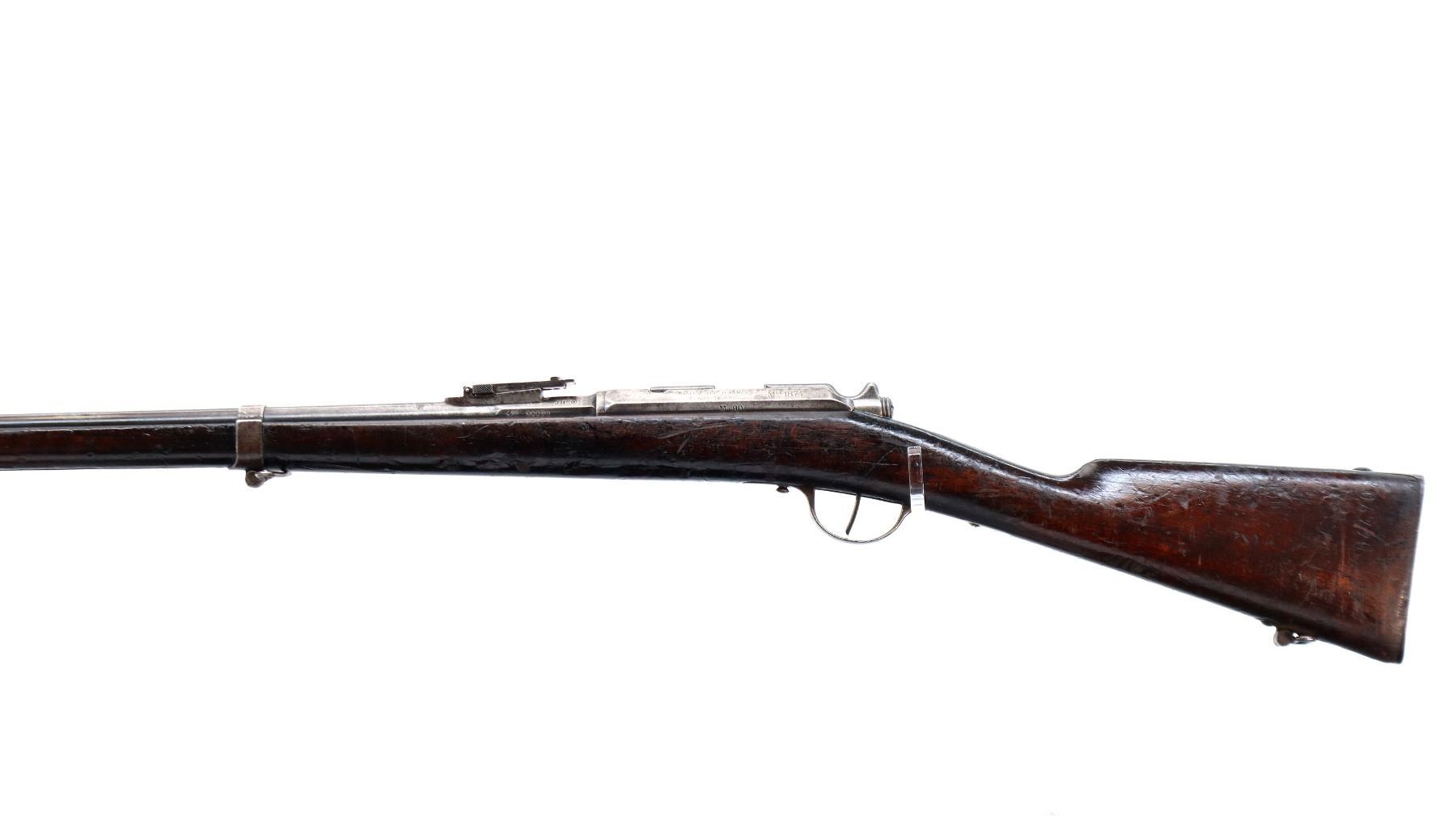 Main Description: Manufactured by Chatellerault 1883, serial numbers mismatched. Blade front sight with ramp, adjustable u notched ladder rear sight, tapered round barrel, hex receiver, straight bolt handle with large knob, extractor is present. One piece full military wood stock, missing nose cap, straight grip cracked behind receiver, smooth steel butt plate, sling swivels, bayonet lug, missing ramrod.