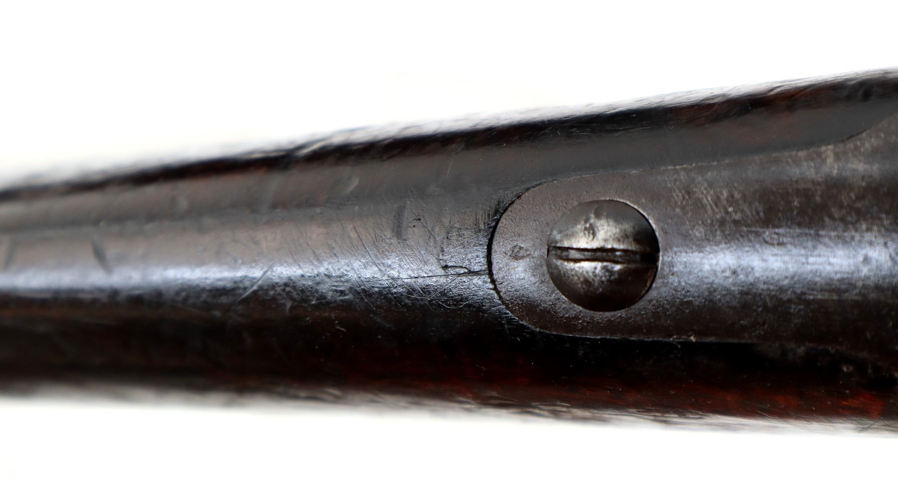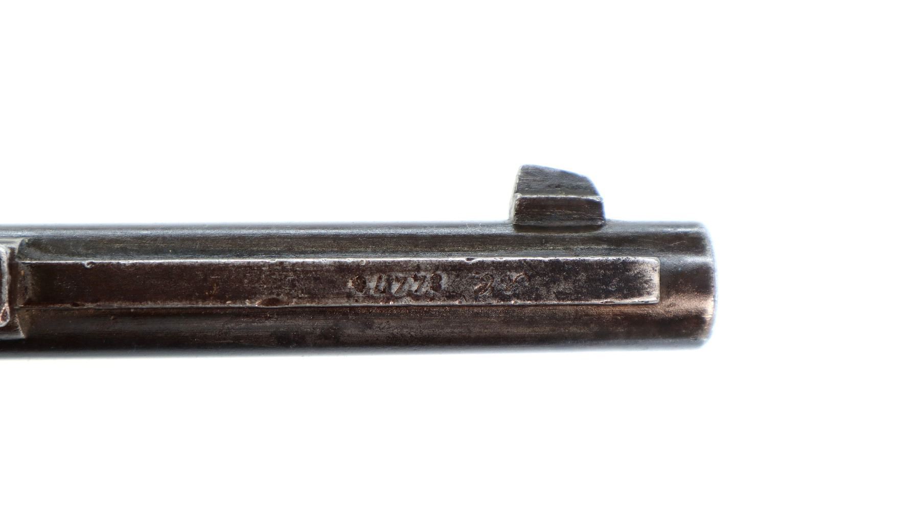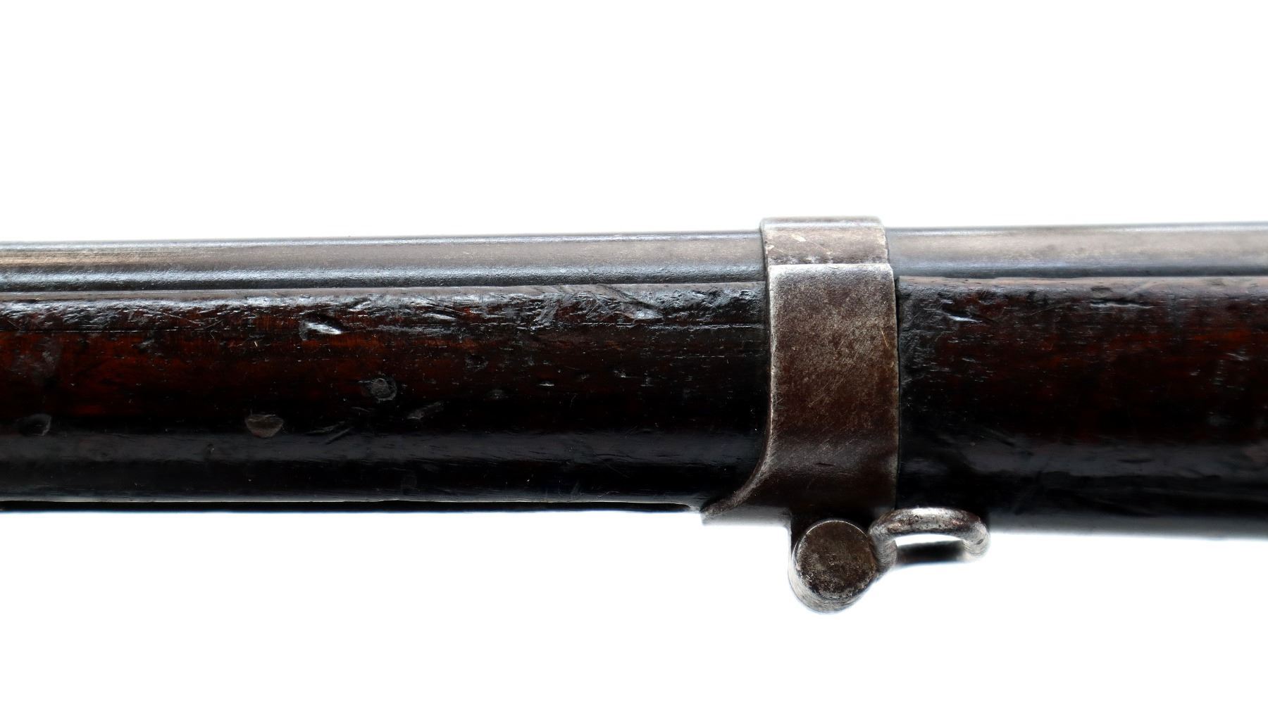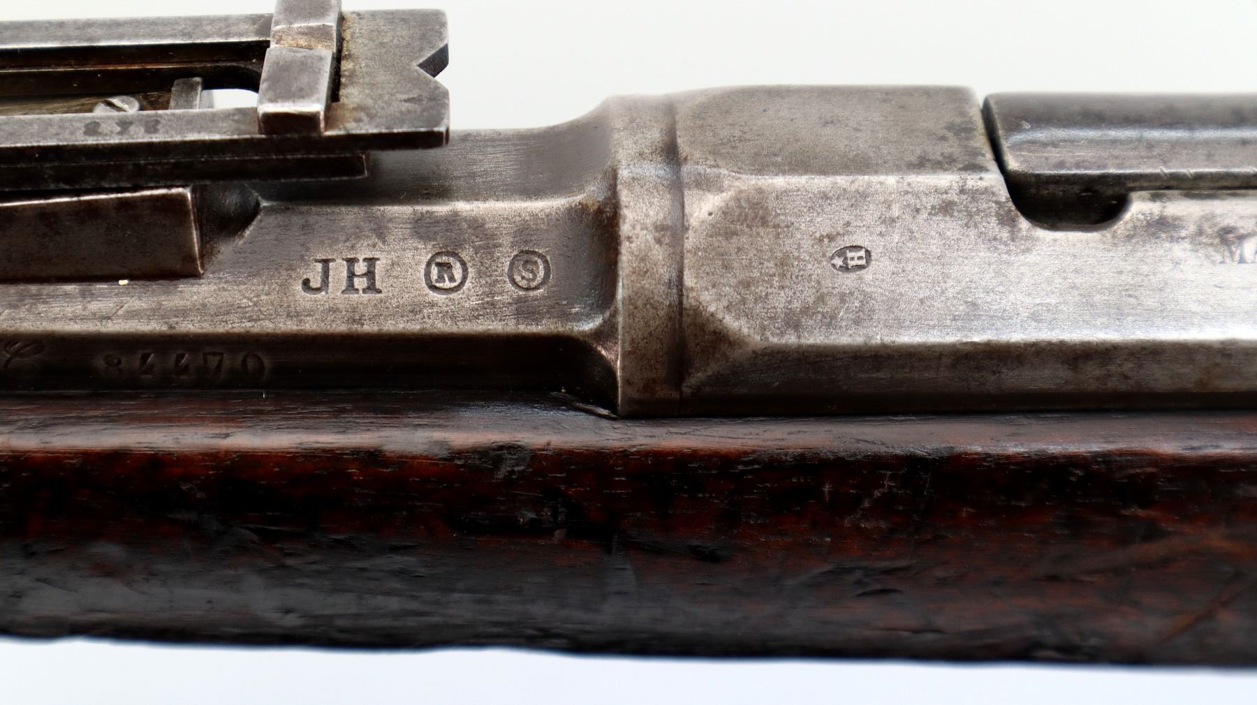 Main Description: Manufactured by Chatellerault 1883, serial numbers mismatched. Blade front sight with ramp, adjustable u notched ladder rear sight, tapered round barrel, hex receiver, straight bolt handle with large knob, extractor is present. One piece full military wood stock, missing nose cap, straight grip cracked behind receiver, smooth steel butt plate, sling swivels, bayonet lug, missing ramrod.