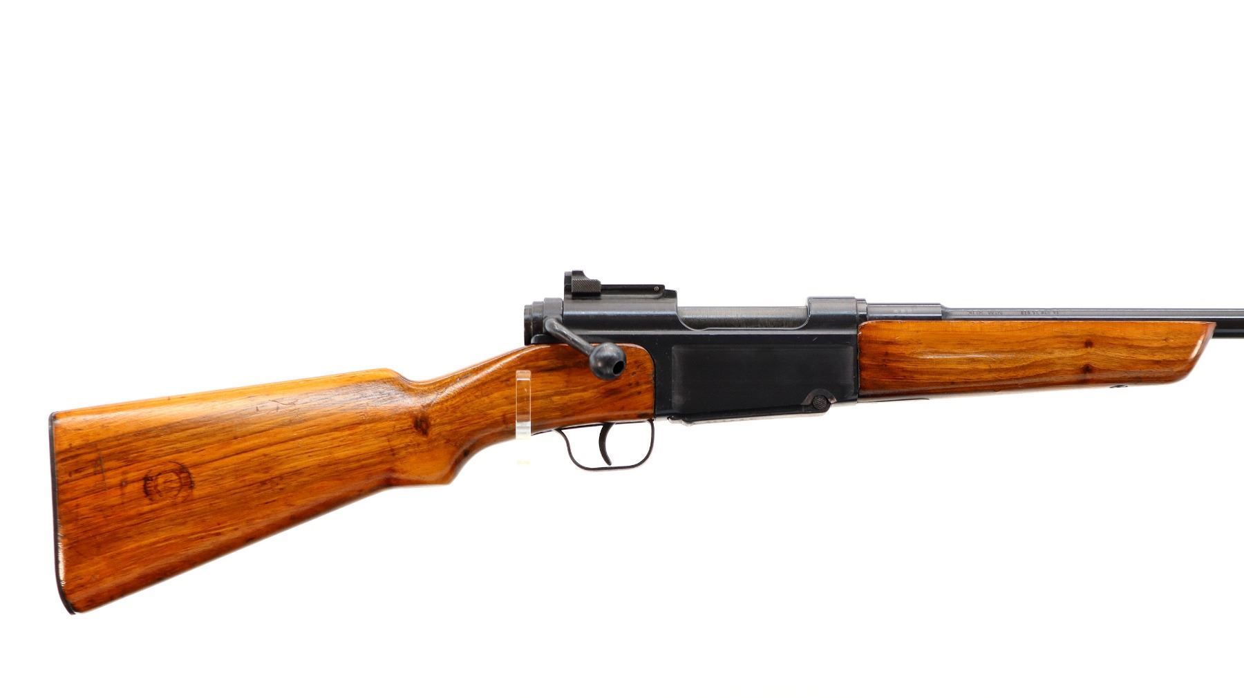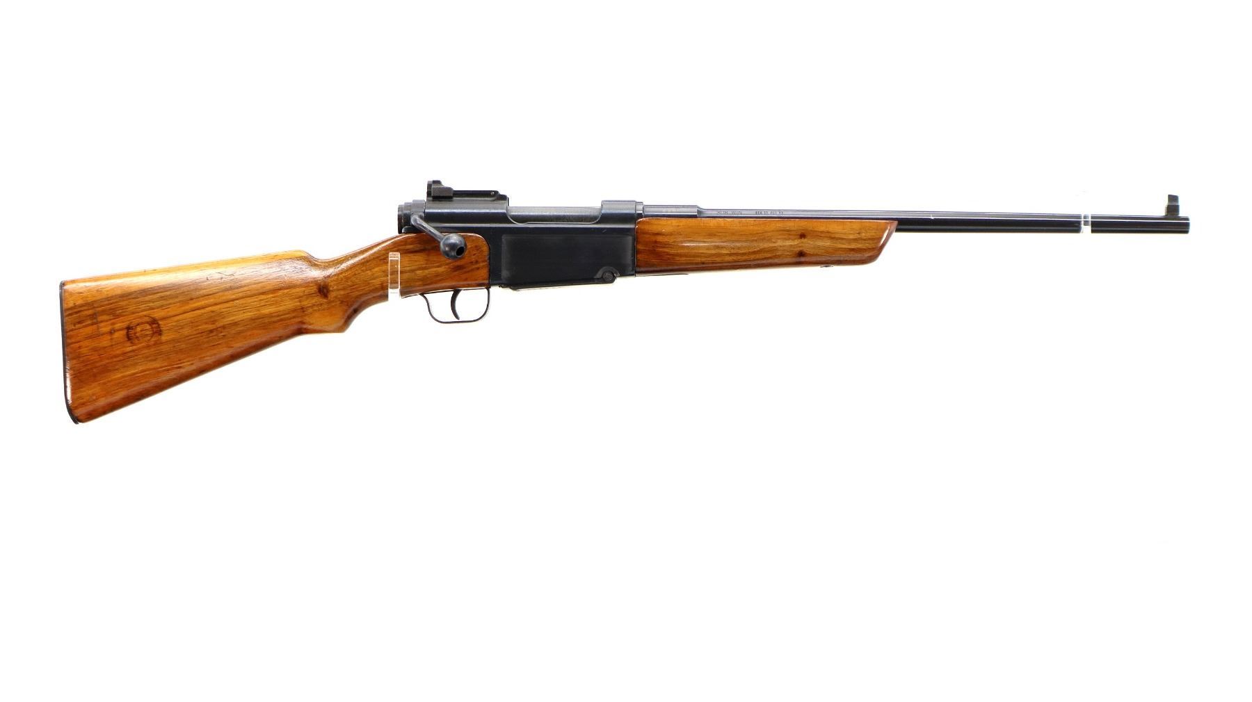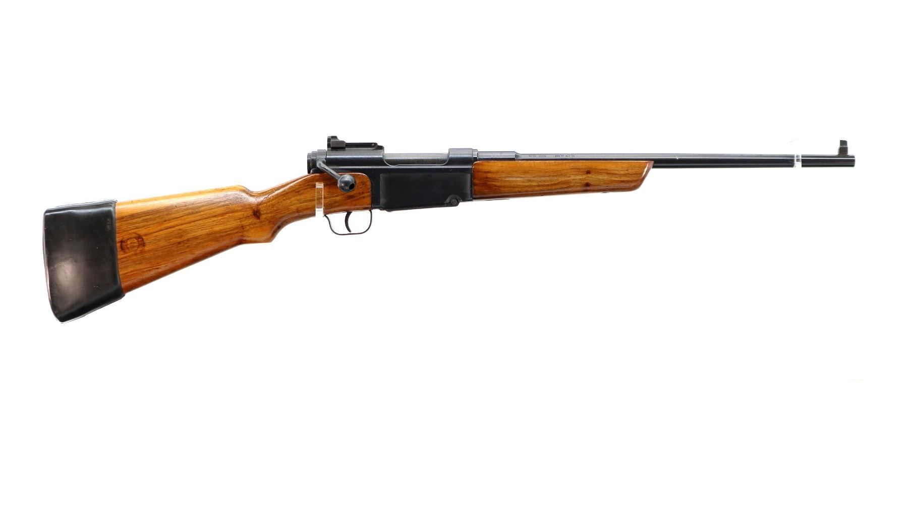 Main Description: Blade front sight with ramp, adjustable rear peep sight, blued finish, receiver has sliding safety on left side. Two piece sporterized wood stocks, finger grooved forearm, pistol grip, smooth steel butt plate, slip on recoil pad, rear sling swivel only.