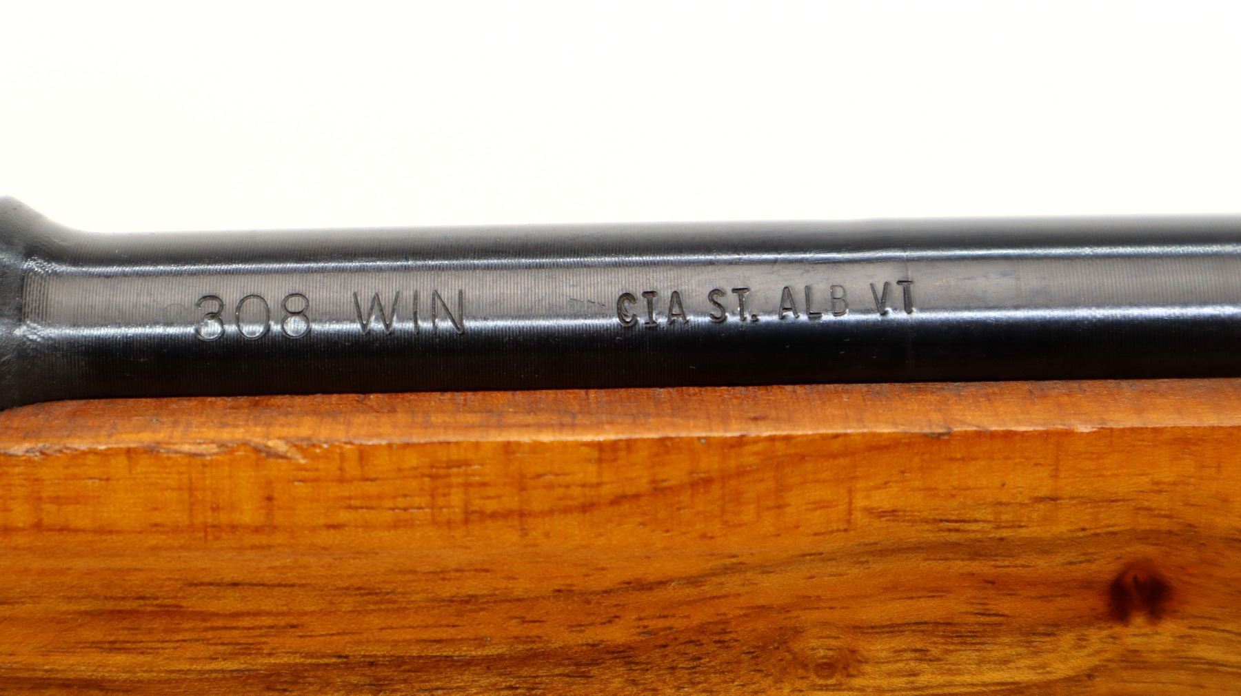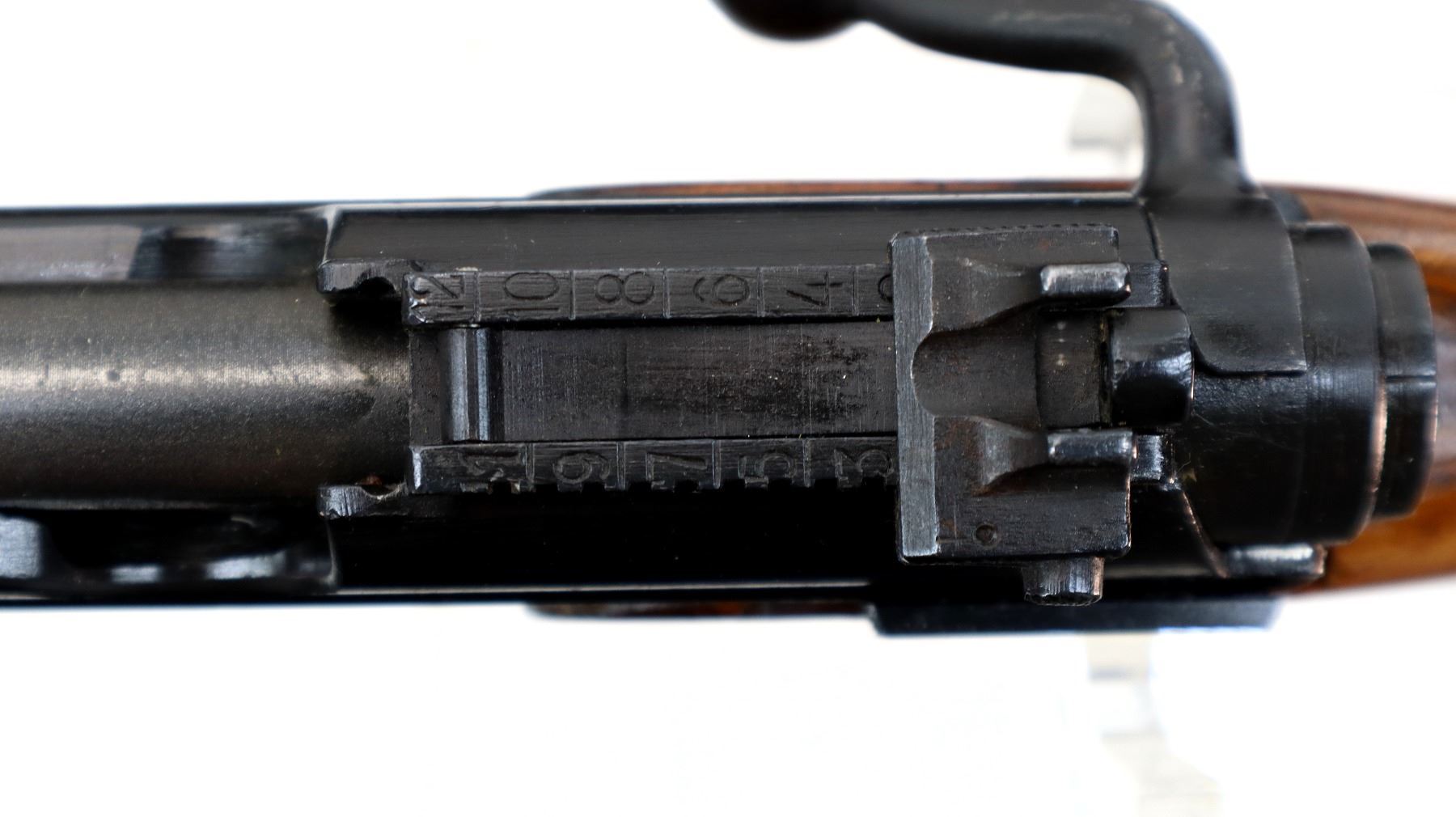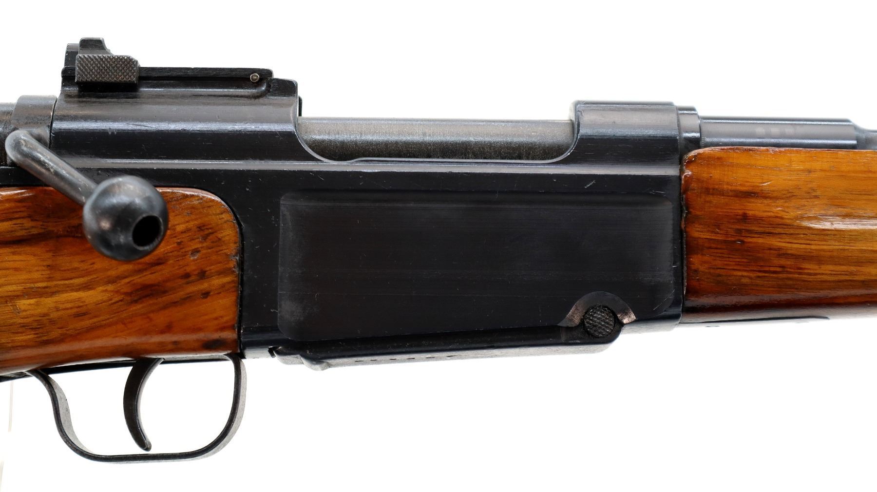 Main Description: Blade front sight with ramp, adjustable rear peep sight, blued finish, receiver has sliding safety on left side. Two piece sporterized wood stocks, finger grooved forearm, pistol grip, smooth steel butt plate, slip on recoil pad, rear sling swivel only.
