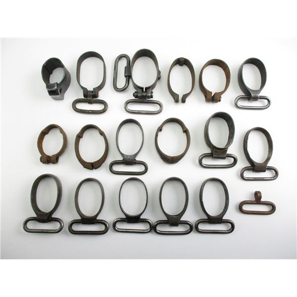 ASSORTED MILITARY BARREL BANDS . INCLUDES MAUSER, & VARIOUS TYPE OF BRITISH BARREL BANDS MARKED WITH CROWNS & NUMBERS, ALSO INCLUDES SWIVELS.