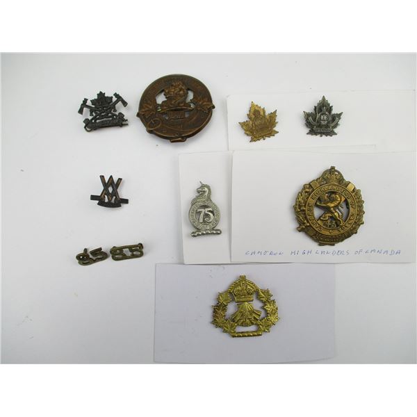 WWI CANADIAN MILITARY BADGE LOT. APPROX. 10 BADGES INCLUDING; 51ST SOO RIFLES, 106TH BATT. NOVA SCOTIA RIFLES, 85TH BATT. NOVA SCOTIA HIGHLANDERS, 43R