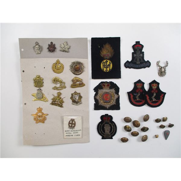 ASSORTED CANADIAN MILITARY BADGE, ETC. LOT. WWII / POST-WAR CAP BADGES, COLLAR DOGS, BUTTONS, SHOULDER TITLES, ATTACHING PINS, ETC., APPROX. 62 INCLUD