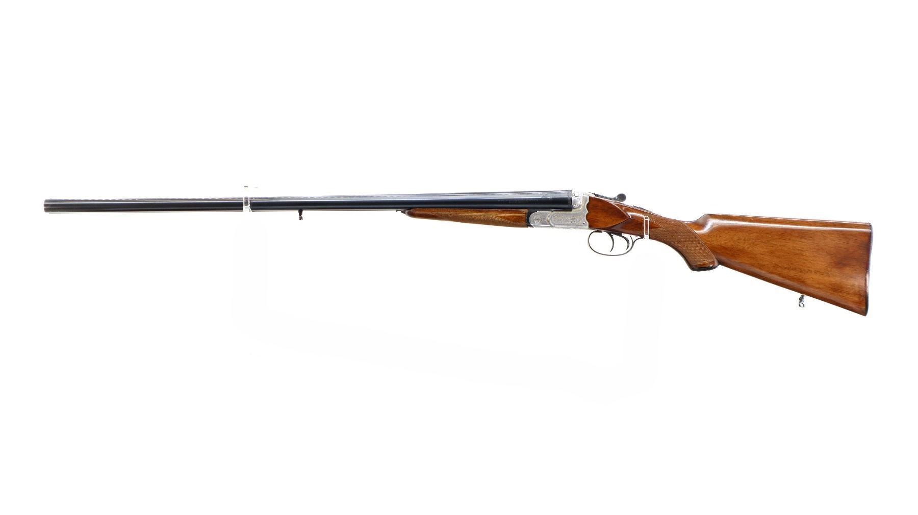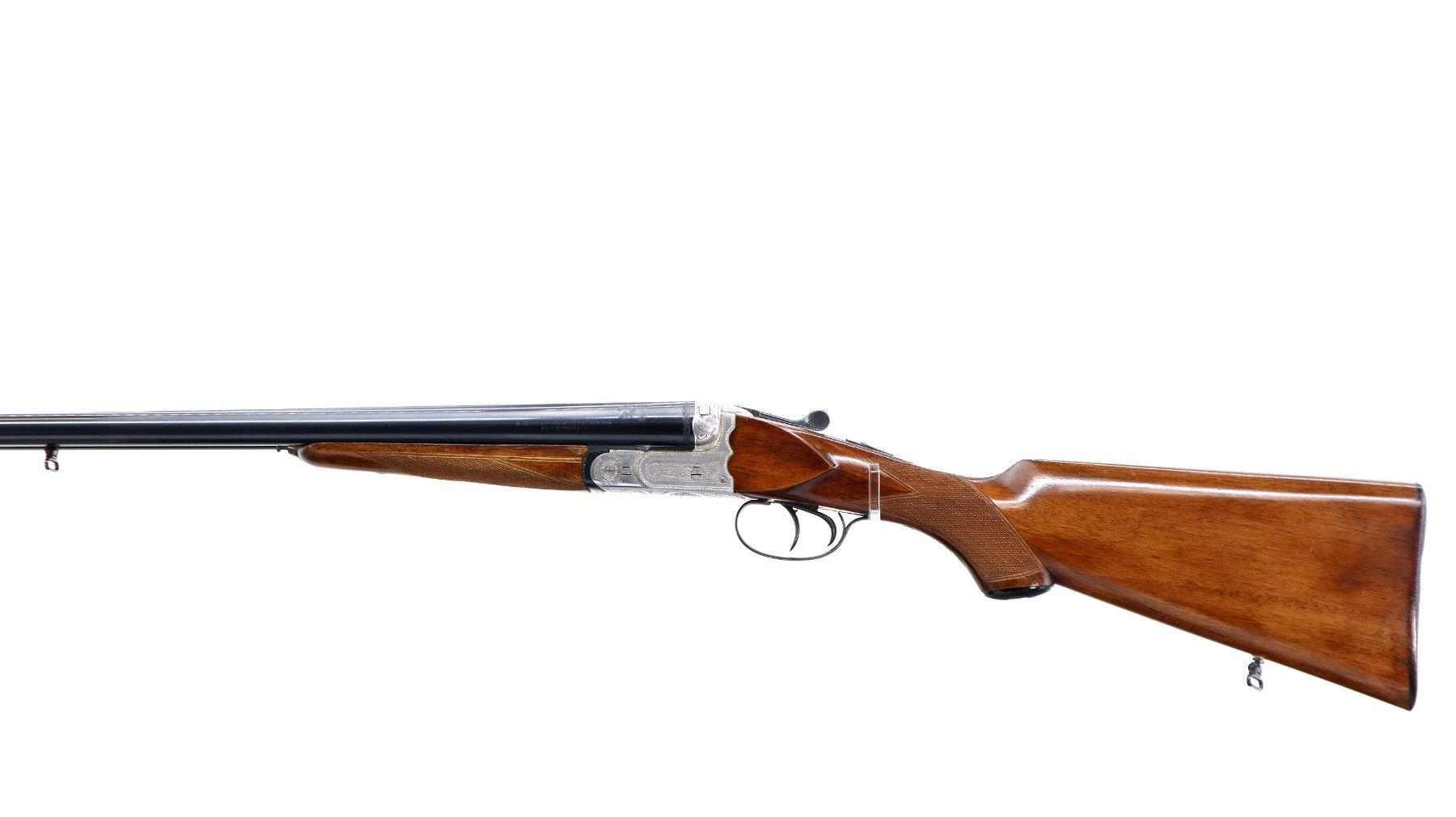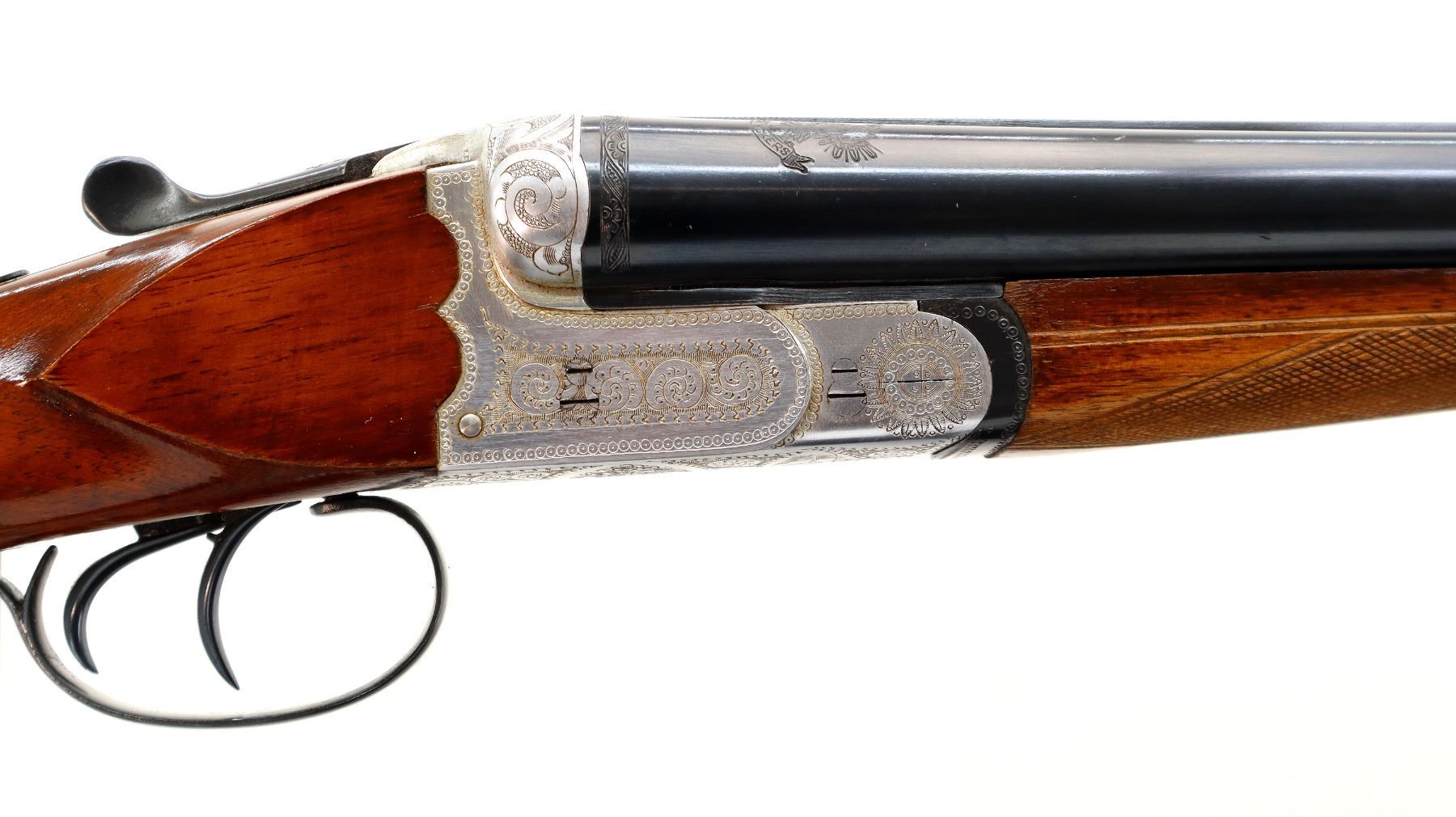 Main Description: Brass bead, blued barrels with raised rib, engraved silver receiver, manual safety, extractor, double triggers. Two piece wood stocks, checkered forearm cracked at tip, checkered pistol grip, small chip behind tang, checkered black polymer butt plate, grip cap, sling swivels.