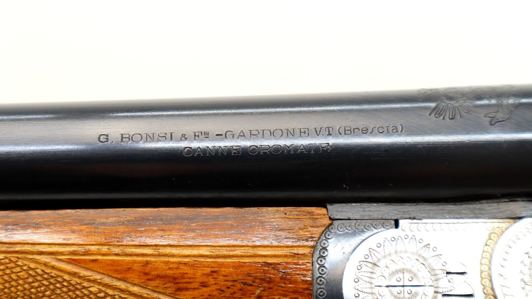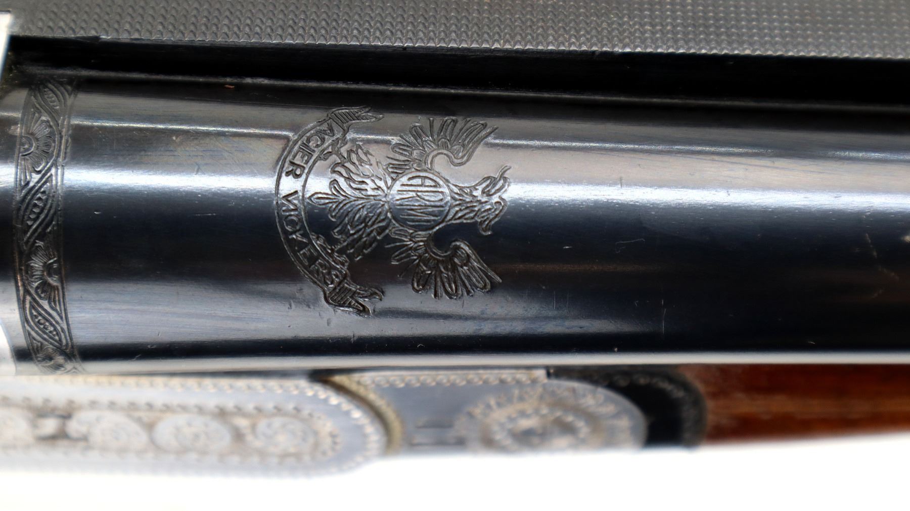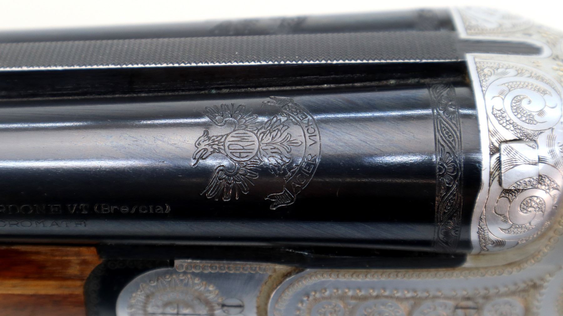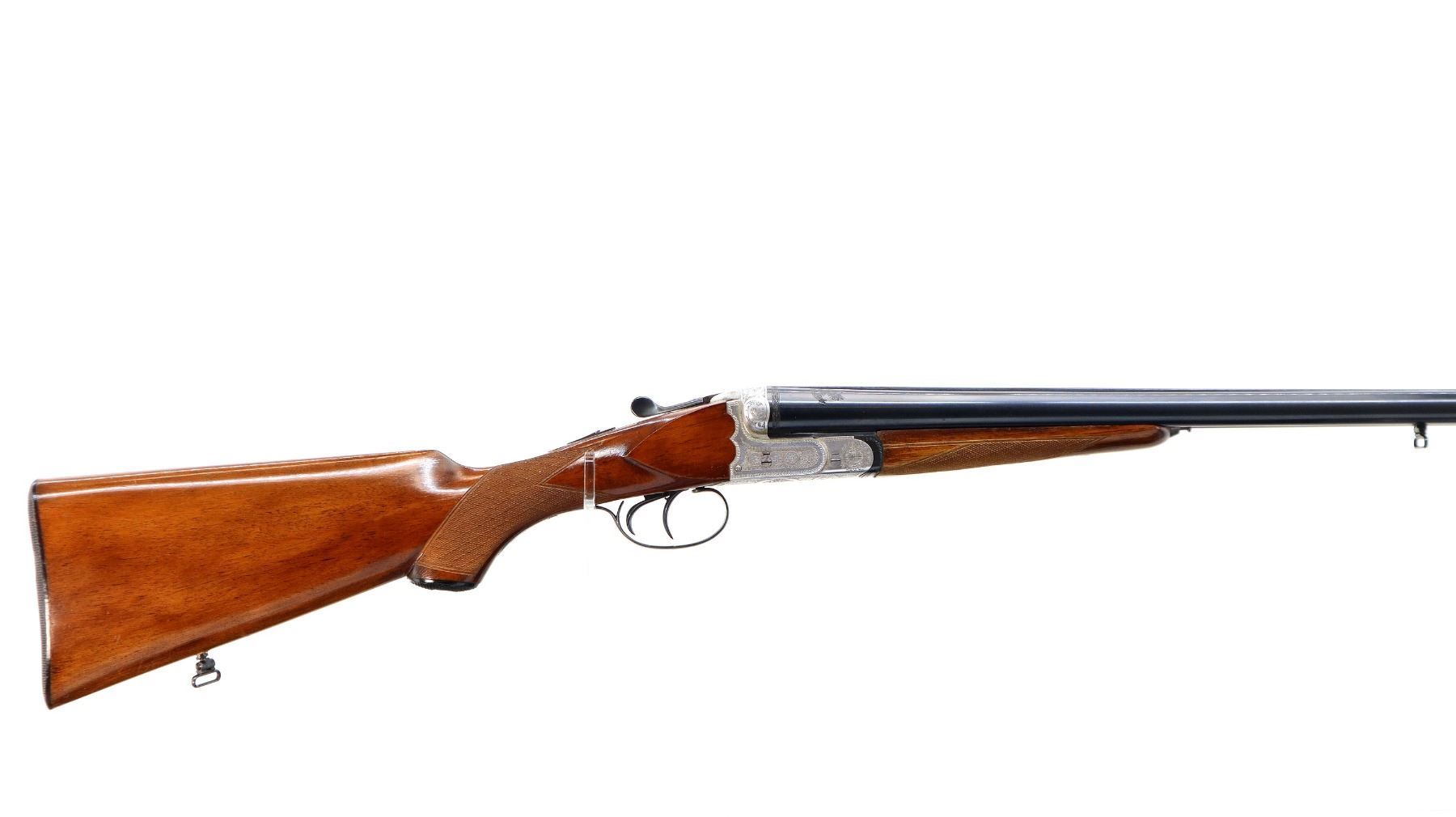 Main Description: Brass bead, blued barrels with raised rib, engraved silver receiver, manual safety, extractor, double triggers. Two piece wood stocks, checkered forearm cracked at tip, checkered pistol grip, small chip behind tang, checkered black polymer butt plate, grip cap, sling swivels.