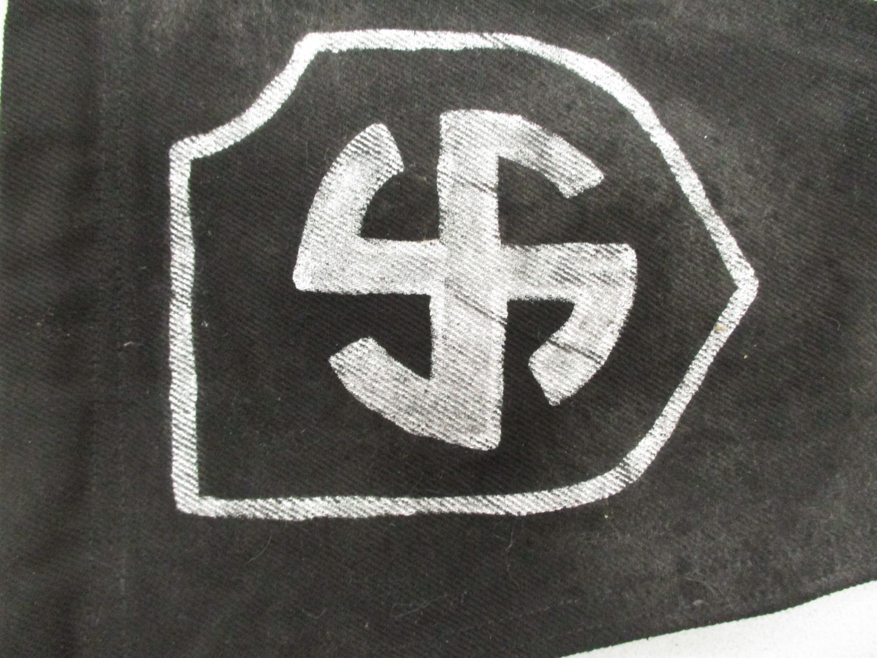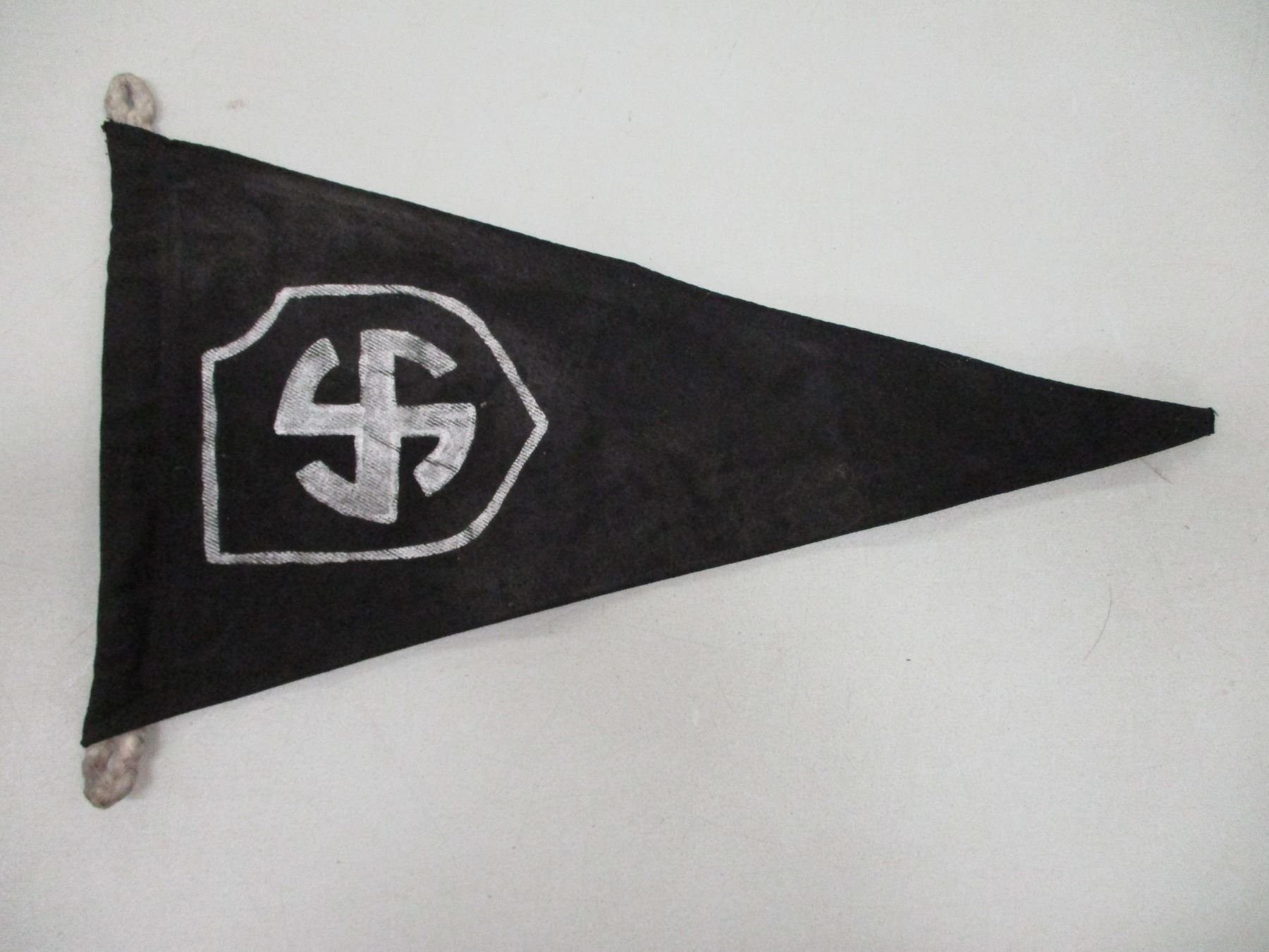 GERMAN 5TH PANZER PENNANT , BLACK CANVAS, WITH WHITE LOOPS. SHIELD WITH BAIKAN TYPE CROSS (SILVER PAINT). UNMARKED. NOTE: SINGLE THREAD GLOWS UNDER BLACKLIGHT ON LOOPS. UNSURE OF AGE OR MANUFACTURER.