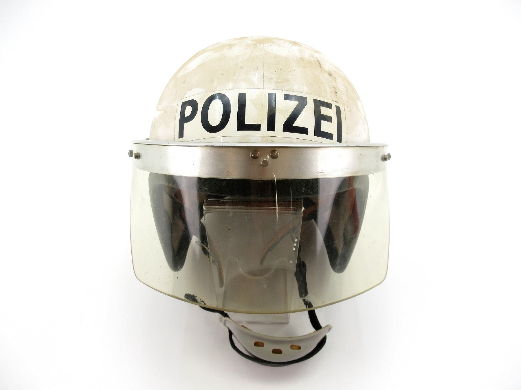 (1) WHITE PLASTIC HELMET WITH PLASTIC & LEATHER HEAD LINER / BAND, LEATHER CHIN STRAP, PLASTIC CHIN GUARD, PLASTIC FACE SHIELD, HELMET MARKED: "POLIZEI", LEATHER MARKED: "54-56" & HAND-WRITTEN MARKED: "L. BEUTER", SHOWS WEAR. SEE PHOTOS.