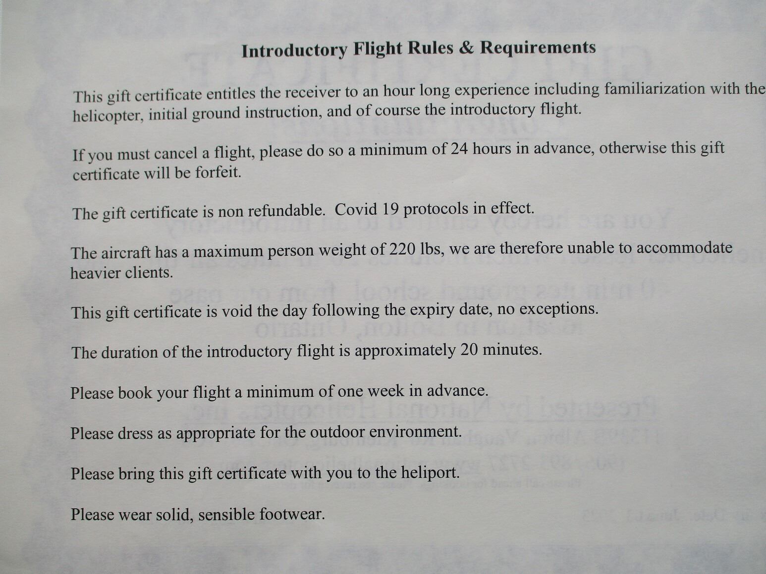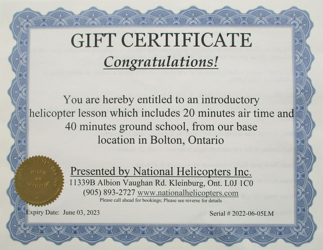 GIFT CERTIFICATE FOR LESSON AND HELICOPTER RIDE, THIS INTDRODUCTORY HELICOPTER FLYING LESSON INCLUDES 20MINUTES OF AIR TIME AND 40 MINUTES OF GROUND SCHOOL IN BOULTON ONT , RETAIL VALUE $300, GENEROUSLY DONATED BY NATIONAL HELICOPTERS INC.
