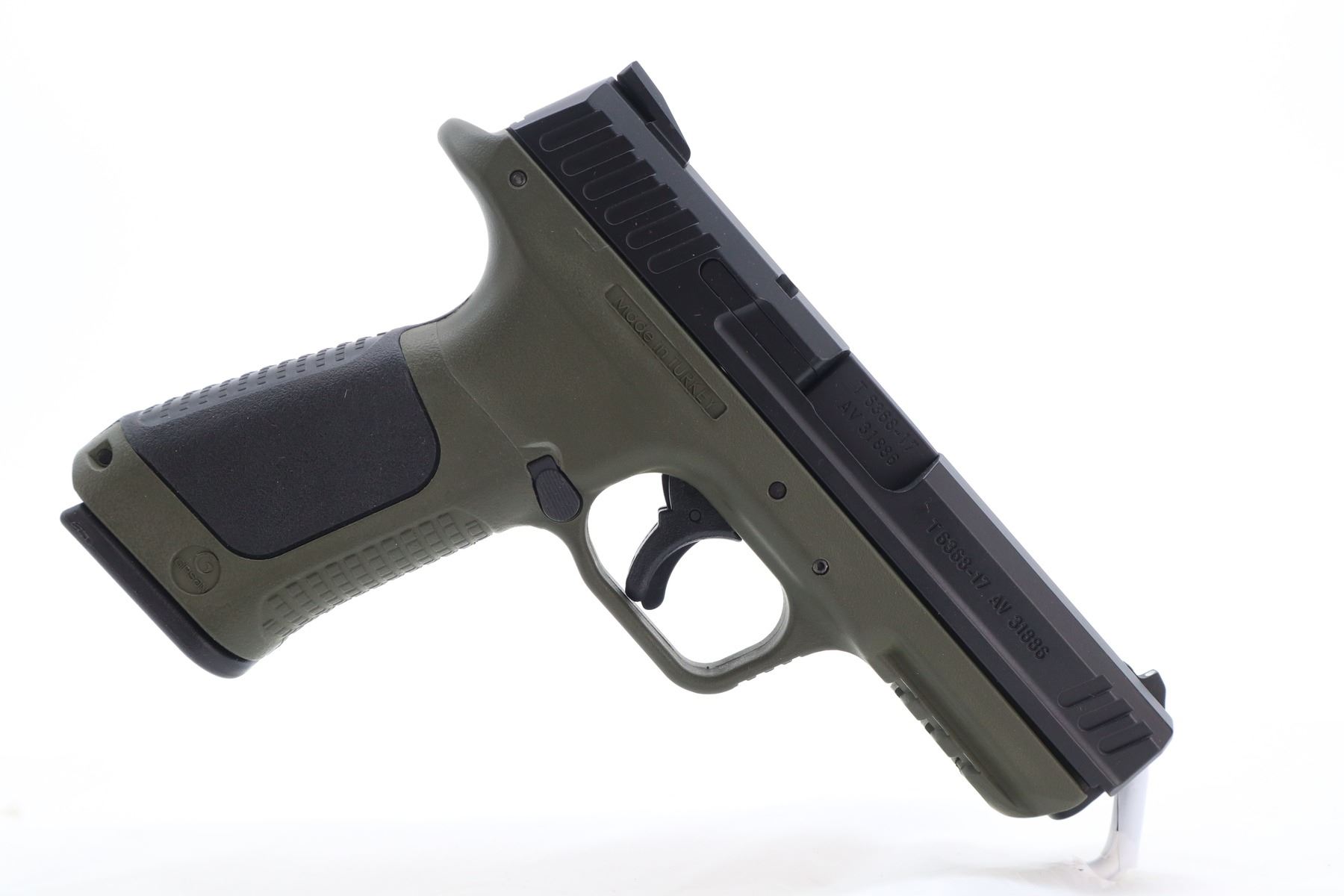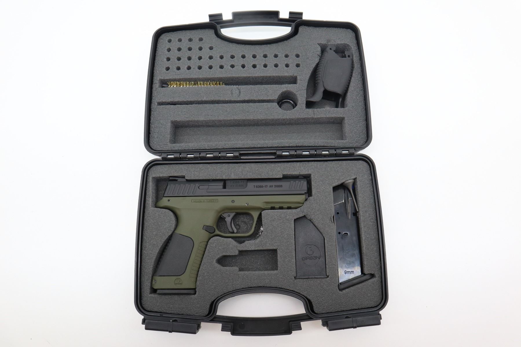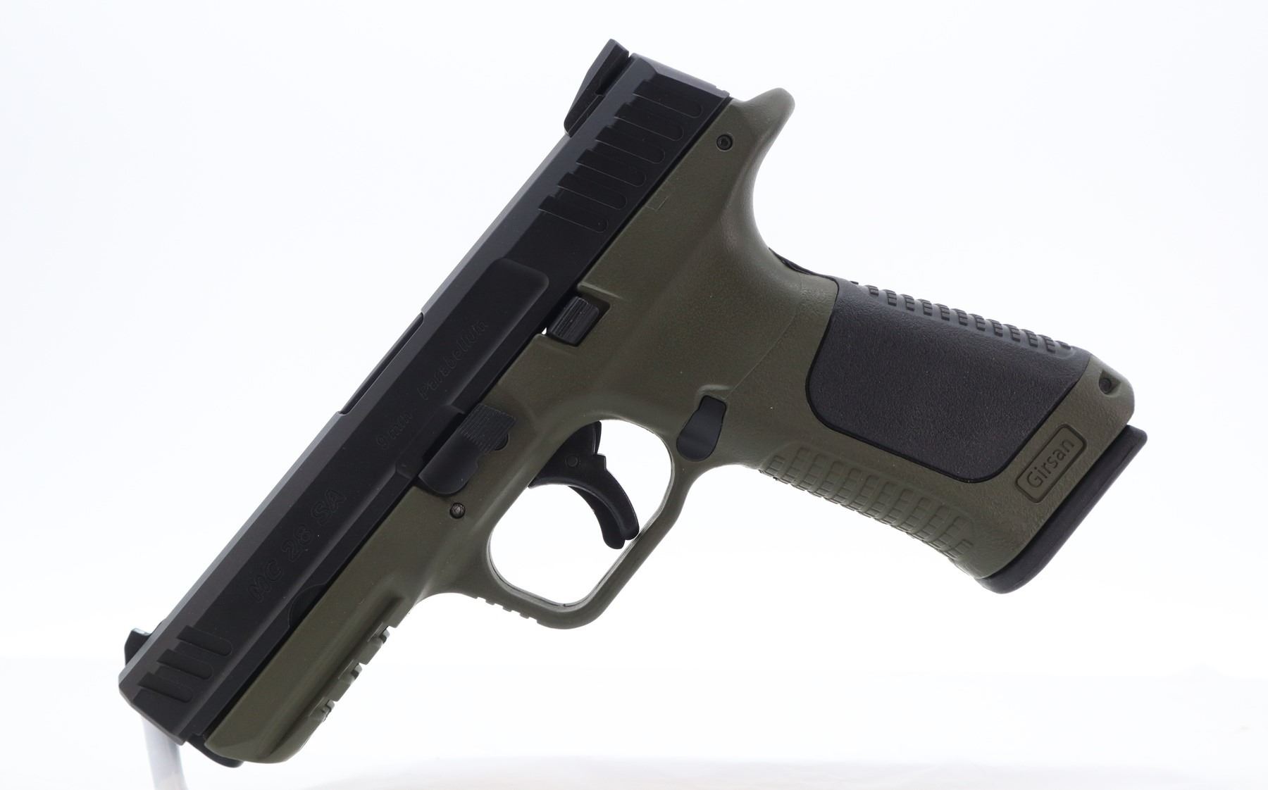 8+/10 , GIRSAN , MODEL: MC28 SA , CALIBER: 9MM LUGER , COMES WITH CASE, 2 MAGAZINES, LOADING TOOL, 2 SETS OF BACKSTRAPS, CLEANING ROD. , BORE IS VERY GOOD. 3 DOT SIGHT SYSTEM. GREEN POLYMER FRAME WITH SERRATED FRONT AND REAR GRIP STRAPS. SHOWS VERY LITTLE HANDLING MARKS. , ACTION: SEMI AUTOMATIC , BARREL LENGTH: 108MM , CONDITION: 8+/10 , SERIAL # T636817AV31886 , CLASS: CANADIAN RESTRICTED CLASS