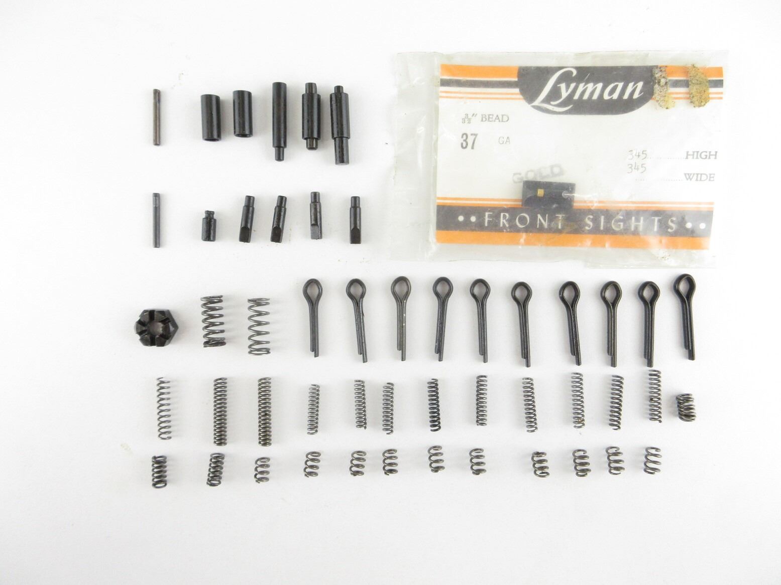 GUNSMITH / HOBBYIST ASSORTED GUN PARTS LOT. LOT INCLUDES; APPROX. (51) PIECES, WITH VARIOUS SPRINGS, PINS, ETC., INCLUDES (1) LYMAN FRONT BEAD SIGHT, 3/32" BEAD, GOLD COLOUR, APPEARS NOS. SEE PHOTOS.