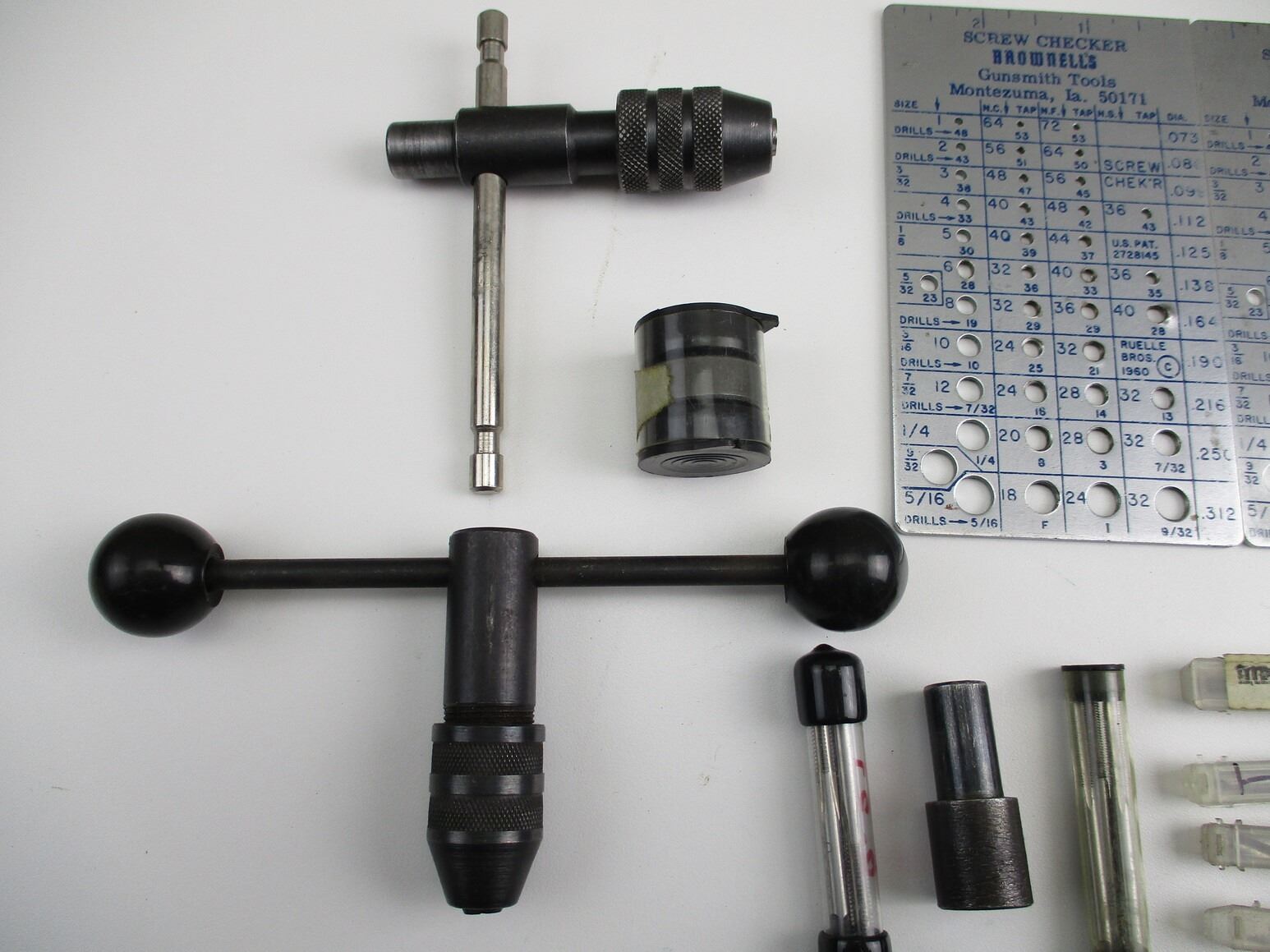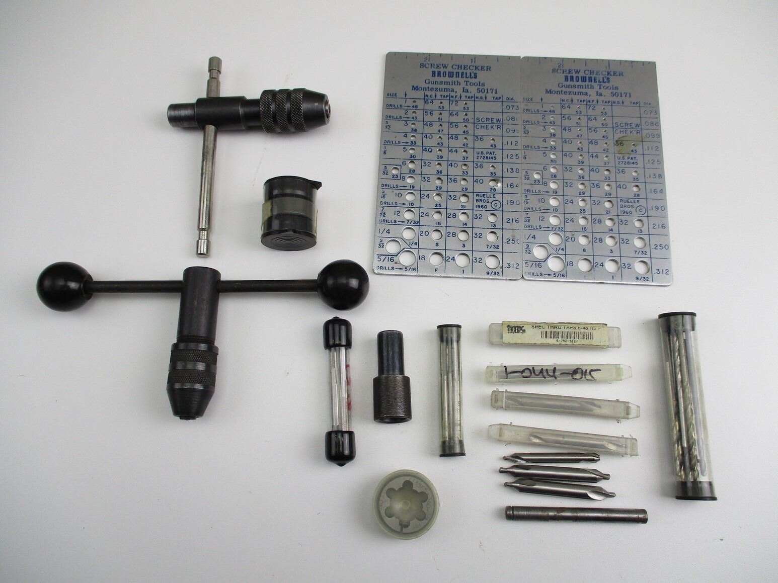 GUNSMITH TAPS, TOOL + GAUGE LOT, INCLUDES: 8-32 BOTTOM + STARTER, 6-48 BOTTOM + STARTER, VARIOUS CENTER DRILL, (SOME HAVE ONLY 1 END)VARIOUS DRILL BITS, 2 X 0, 540 X 36 DIES, (2) TAP HANDLES, (2) BROWNELLS SCREW CHECKERS.