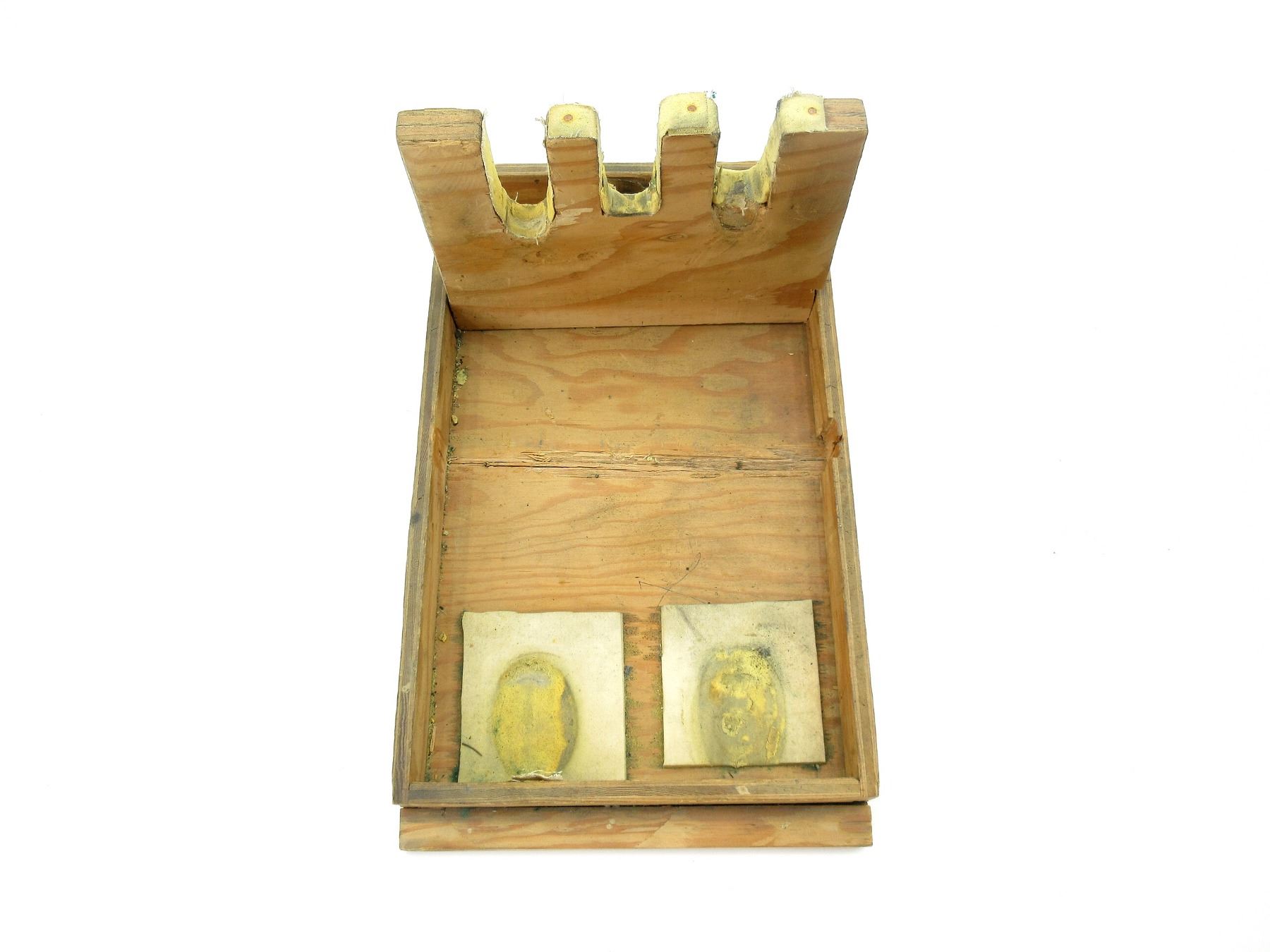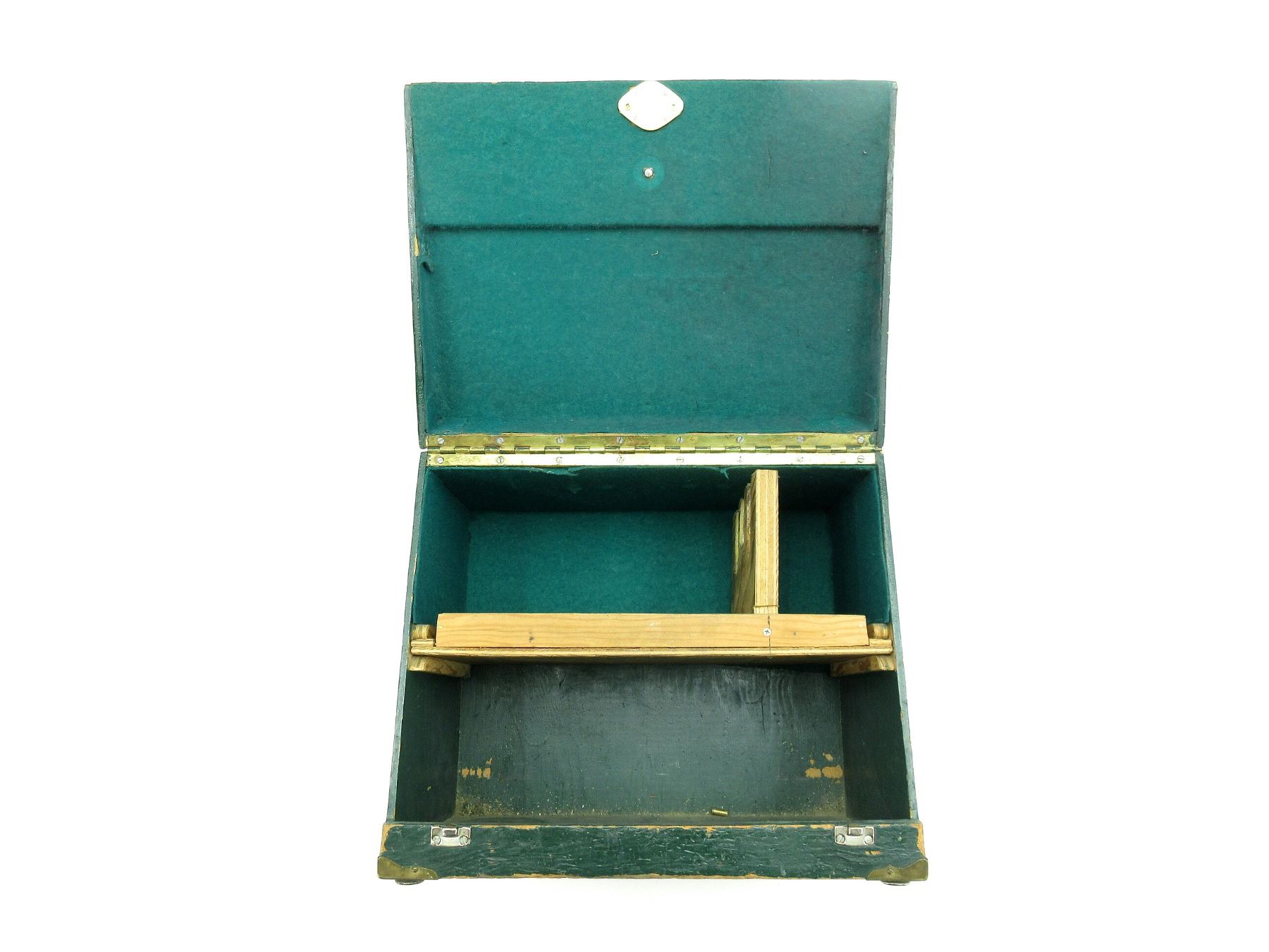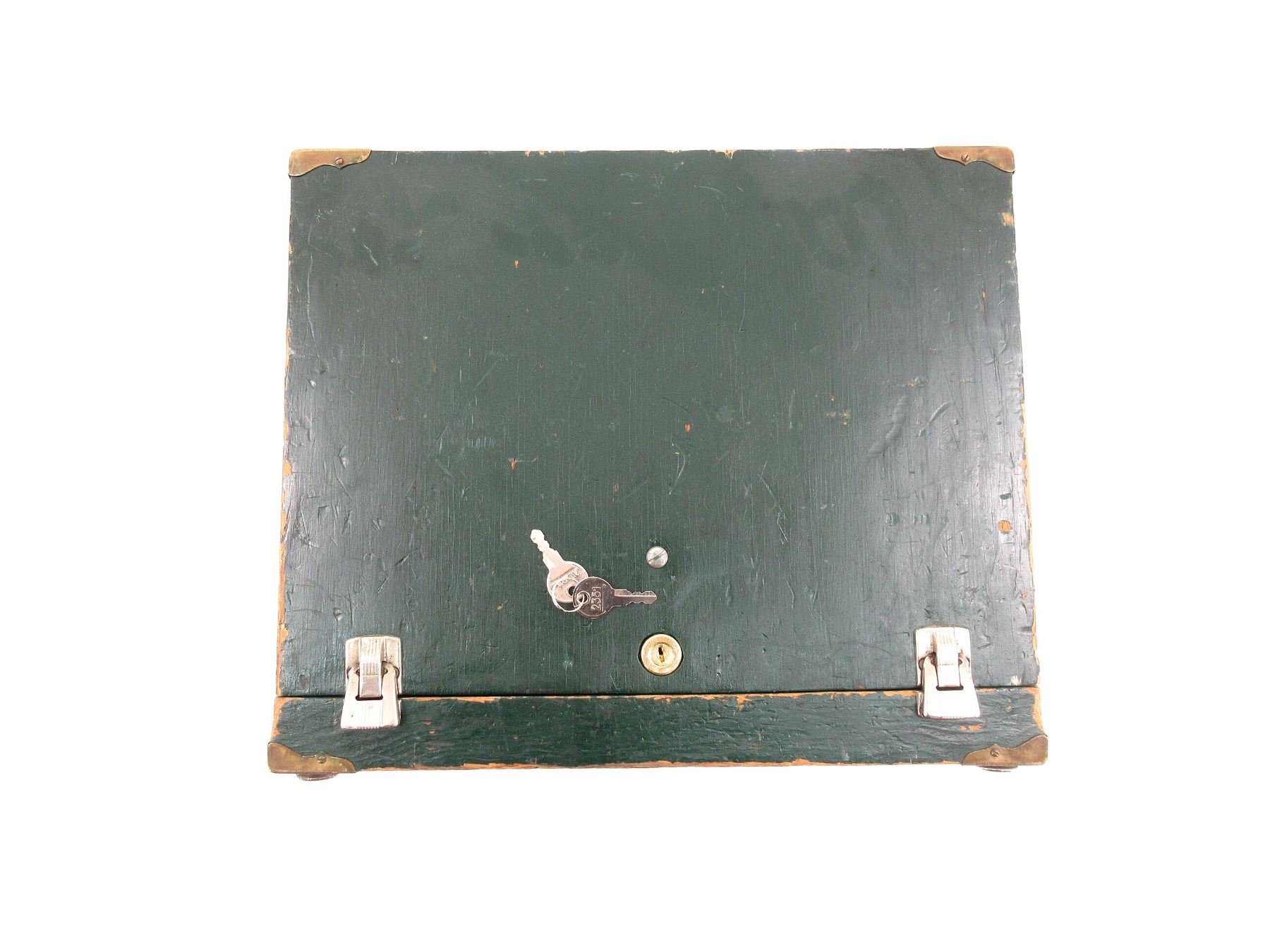 (1) RANGE / CLEANING BOX, VERTICAL, HOLDS 3 HANDGUNS, WITH PULL OUT DRAWER, LOCKABLE WITH KEYS, GREEN PAINTED WOOD CONSTRUCTION, WITH CARRY HANDLE, APPROX. 15.5" X 10" X 13". SEE PHOTOS.