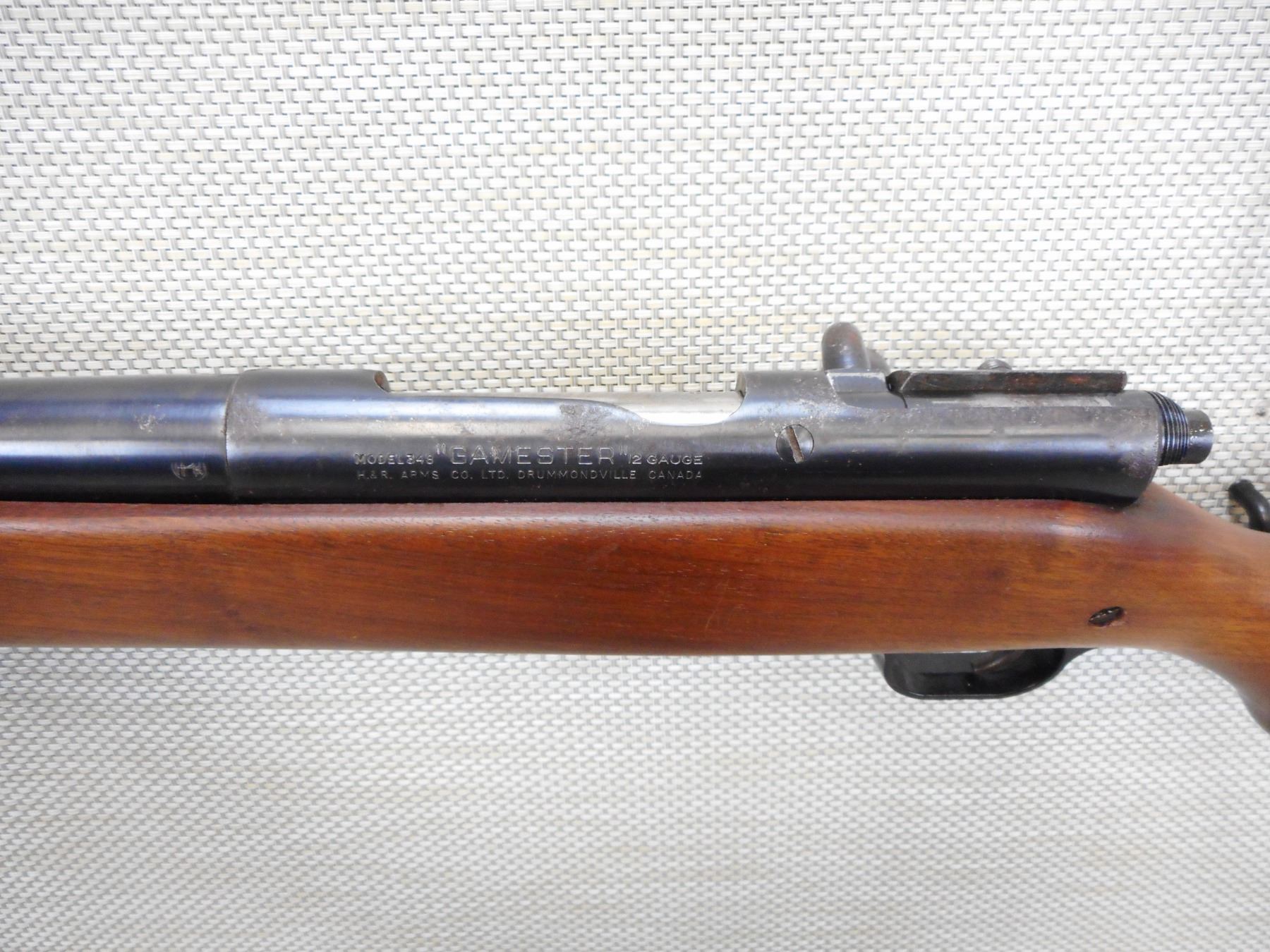 HARRINGTON & RICHARDSON , MODEL: 348 GAMEMASTER , CALIBER: 12GA X 2 3/4" , FIXED MODIFIED CHOKE, BORE IS GOOD, PLUNGER TO ASSIST THE BOLT IS BROKEN OR MISSING, BEAD FRONT SIGHT, ONE PIECE HARDWOOD STOCK WITH PLASTIC BUTT PLATE, STOCK IS CRACKED IN FRONT OF THE TRIGGER GUARD, SOME LIGHT SURFACE PITTING AND RUST ON THE BARREL AND ACTION, SHOWS SOME HANDLING MARKS , STOCK # 9989 , SERIAL # N/A , ACTION: BOLT ACTION SHOTGUN , BARREL LENGTH: 28" , CONDITION: 4/10 , CLASS: CLASS: CANADIAN NON RESTRICTED CLASS
