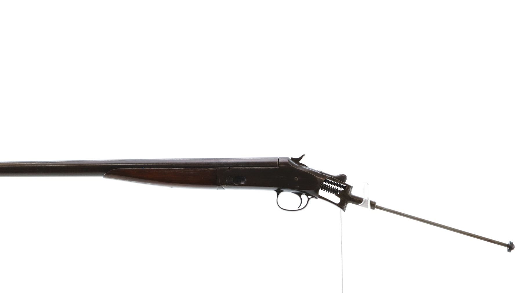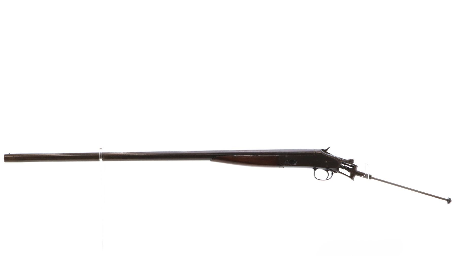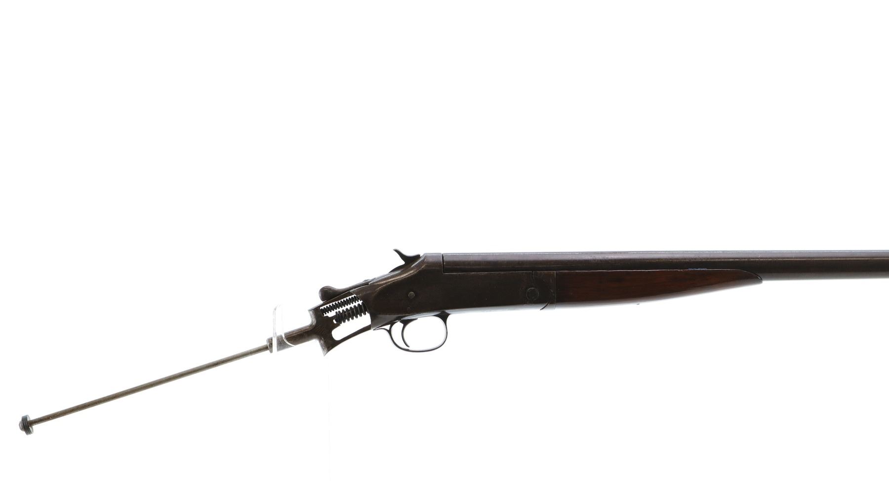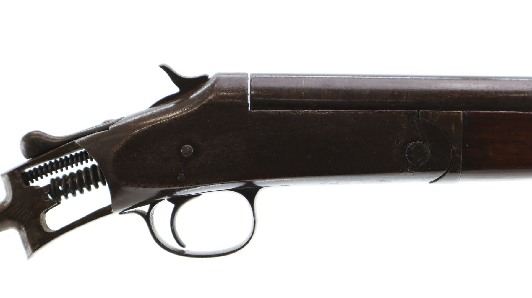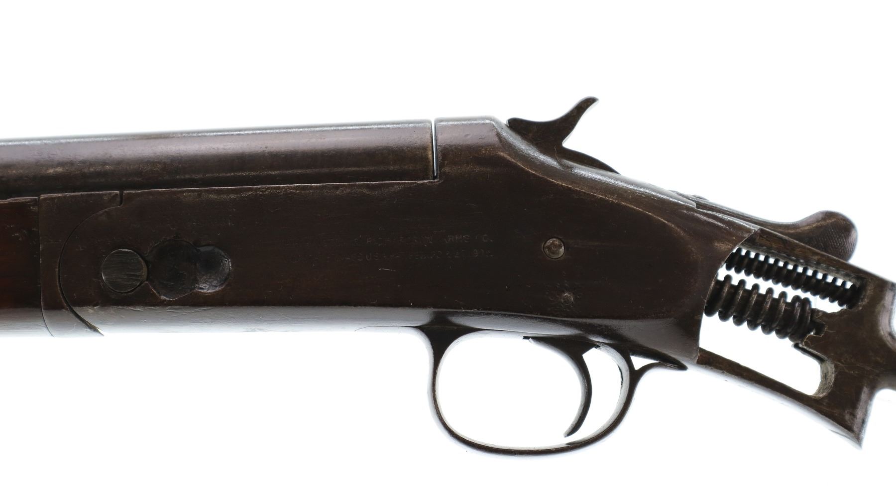 Main Description: Copper Bead, barrel bulged at muzzle, checkered spur hammer, ejector, hinged pin broken and replaced. One piece wood forearm, missing complete butt stock. Has the stock bolt.