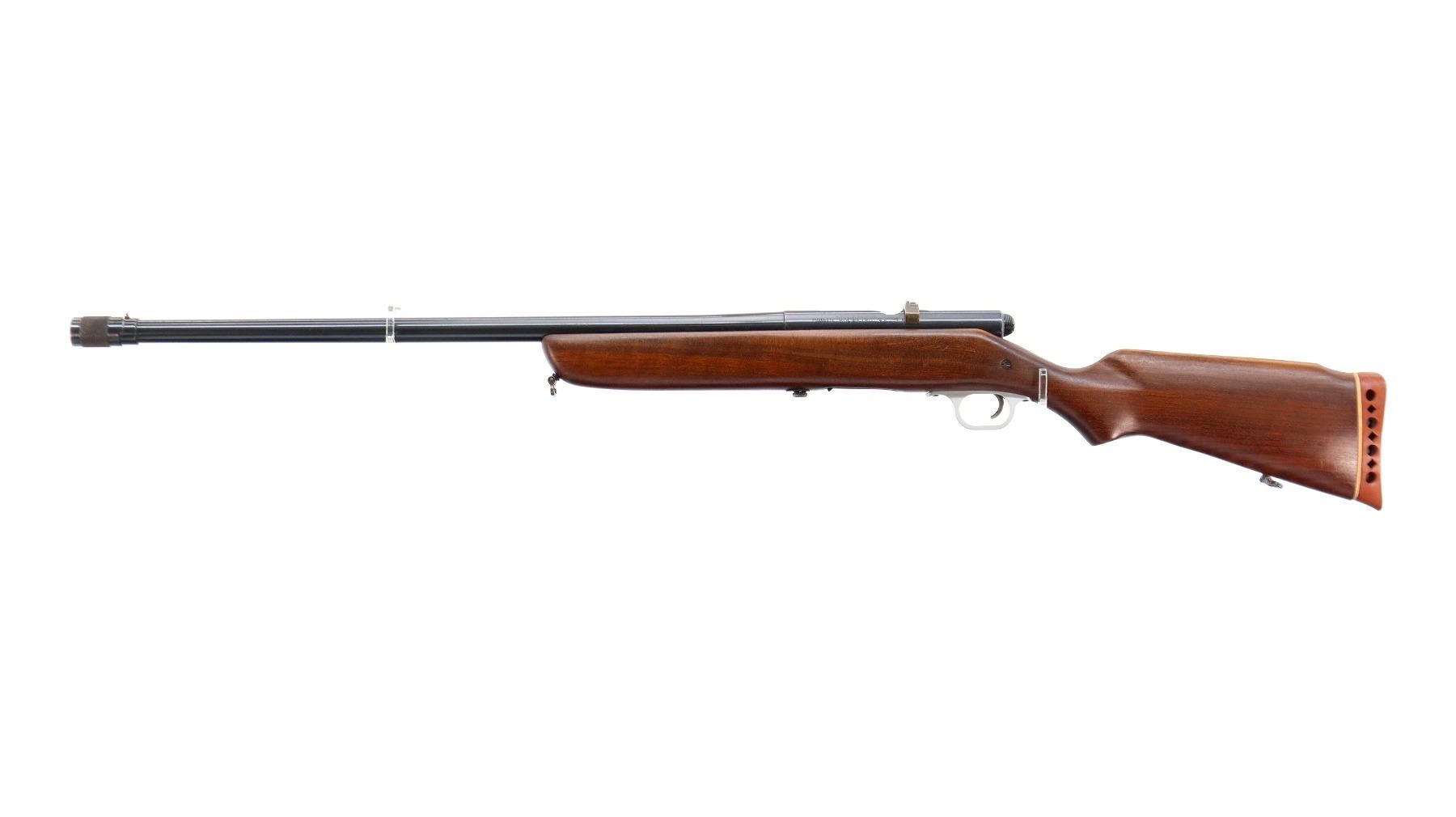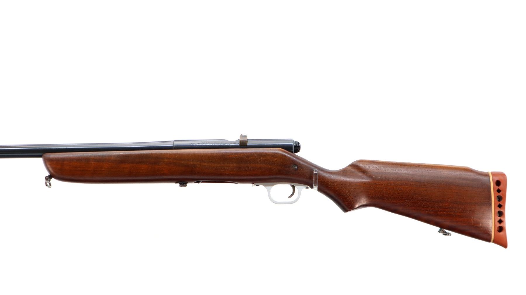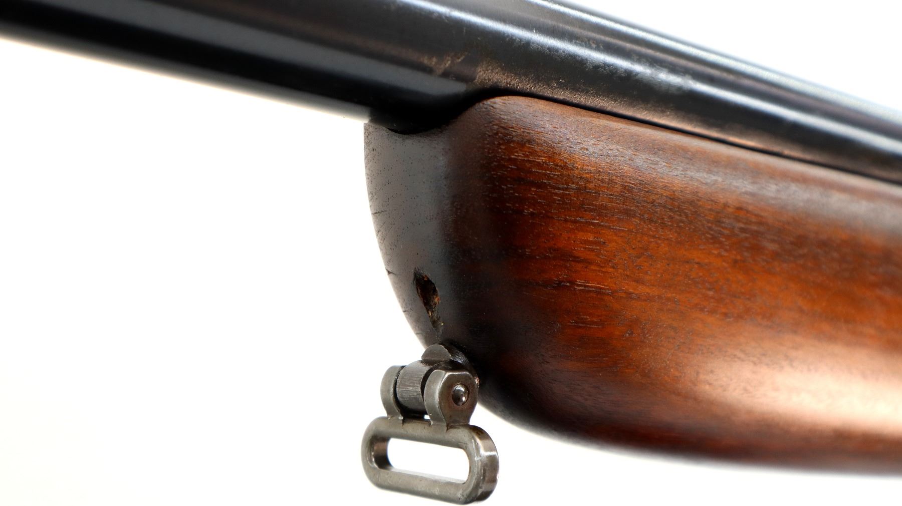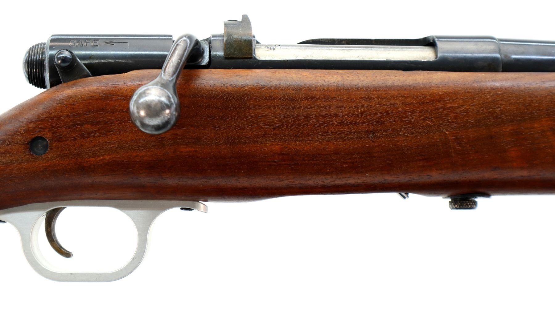 Main Description: Brass bead, custom u notched rear sight, blued finish, round barrel. One piece wood stock, forend tip has an extra hole, pistol grip, red vented rubber recoil pad, silver alloy trigger guard, sling swivels.