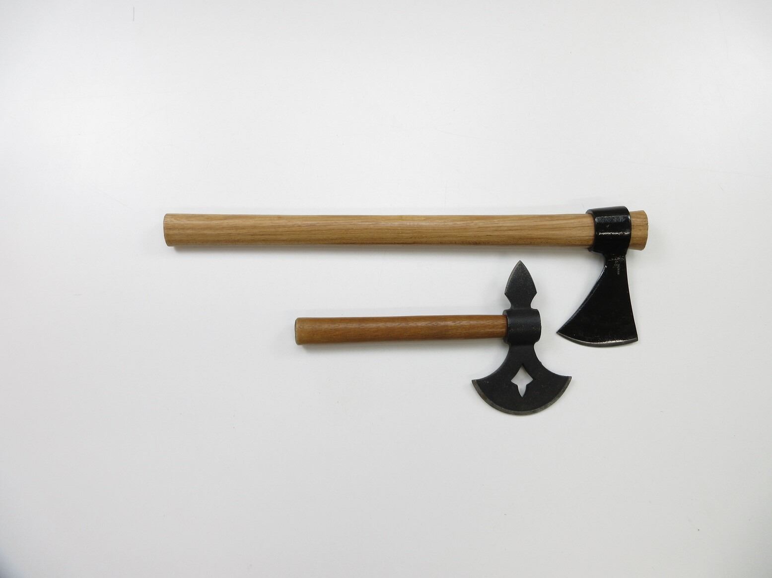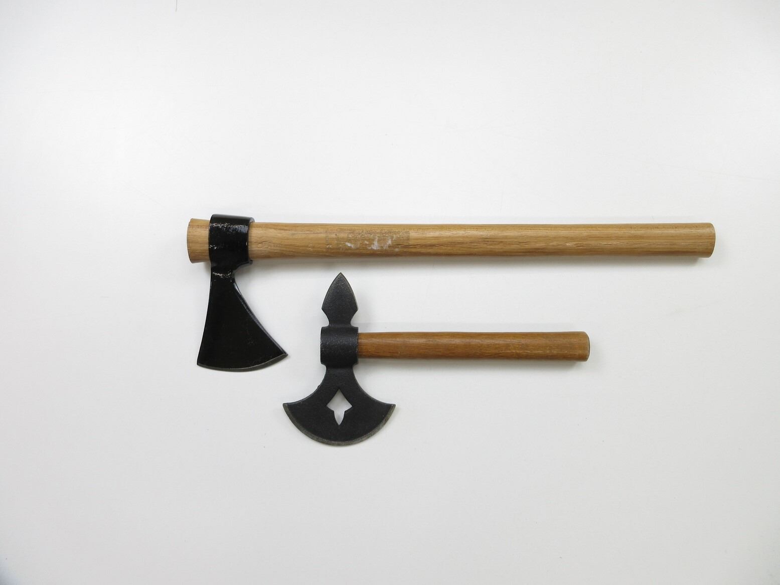 HATCHET LOT. (2) WOODEN HANDLE HATCHETS, (1) BLACK STEEL, WOOD HANDLE, APPROX. BLADE 3.25", OAL APPROX. 19", (1) METAL, WOOD HANDLE, APPROX. BLADE 4", OAL APPROX. 9.5". SEE PHOTOS.