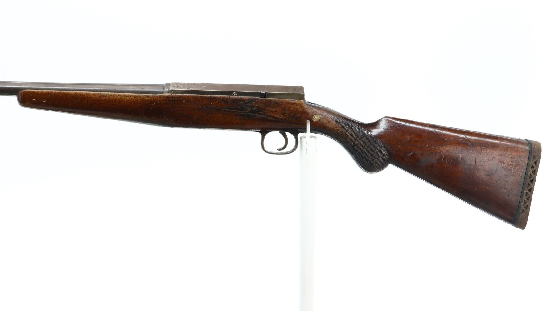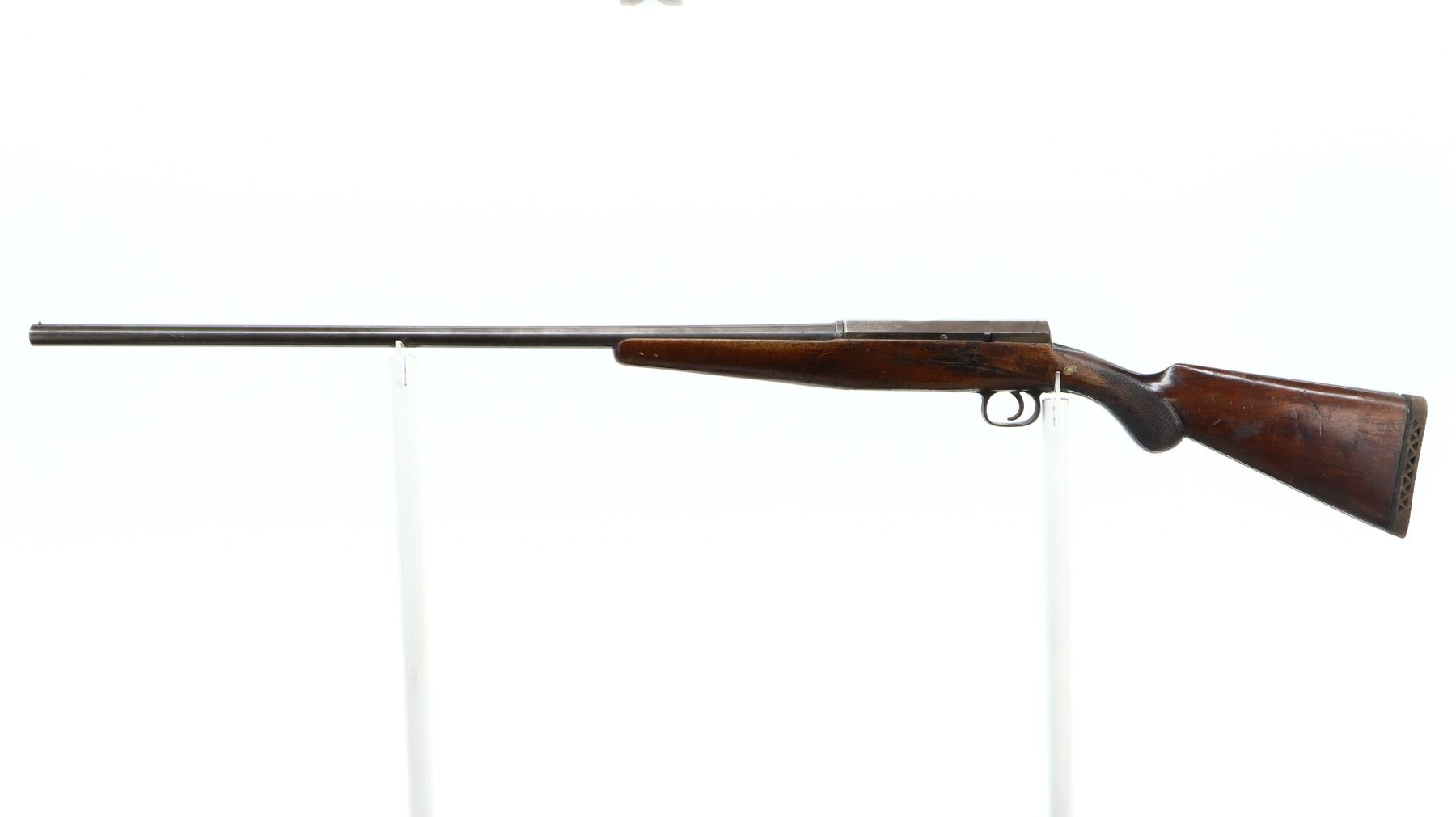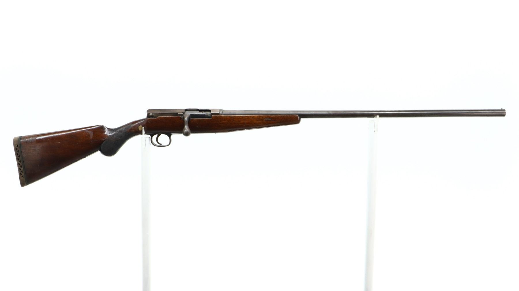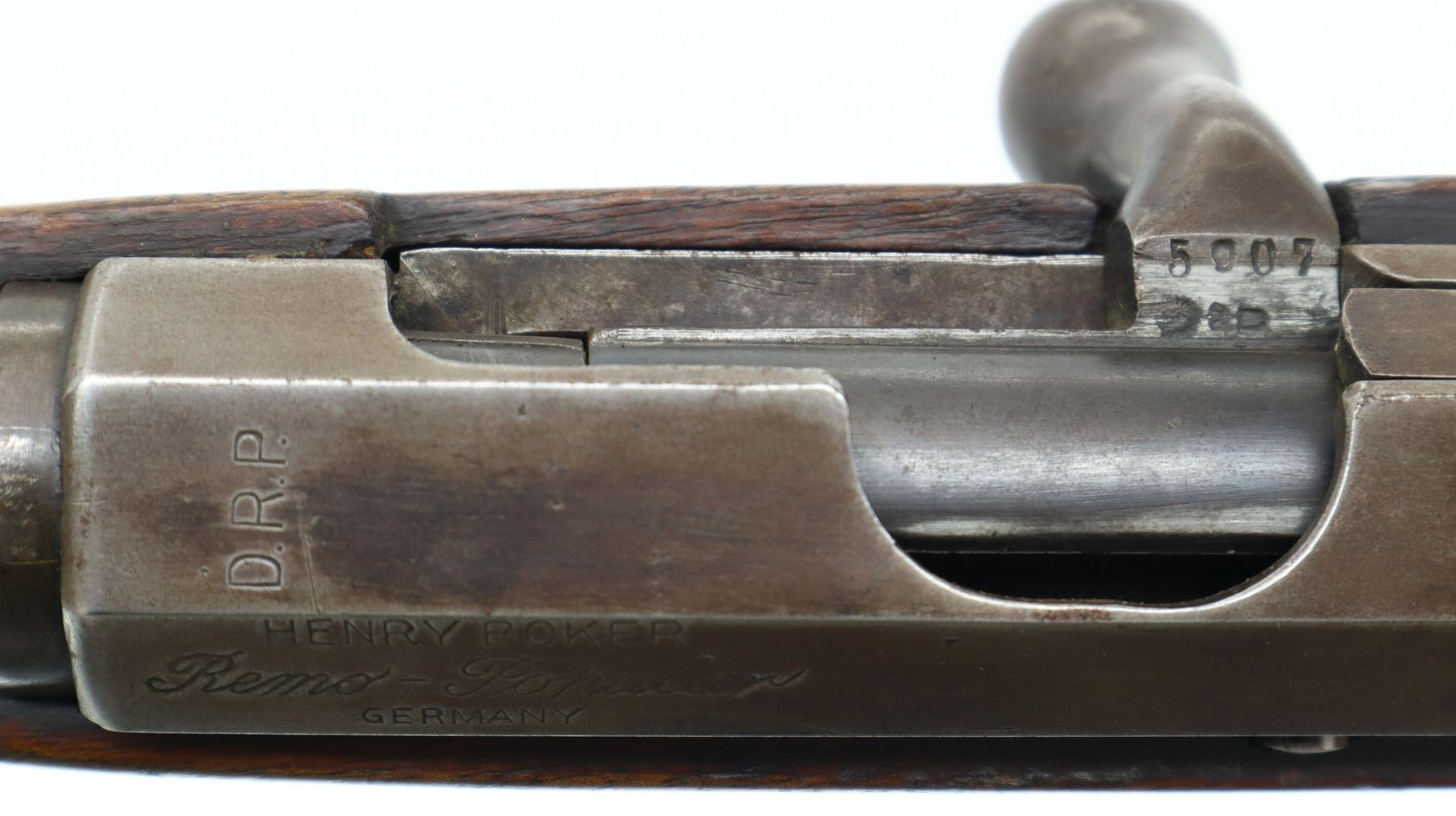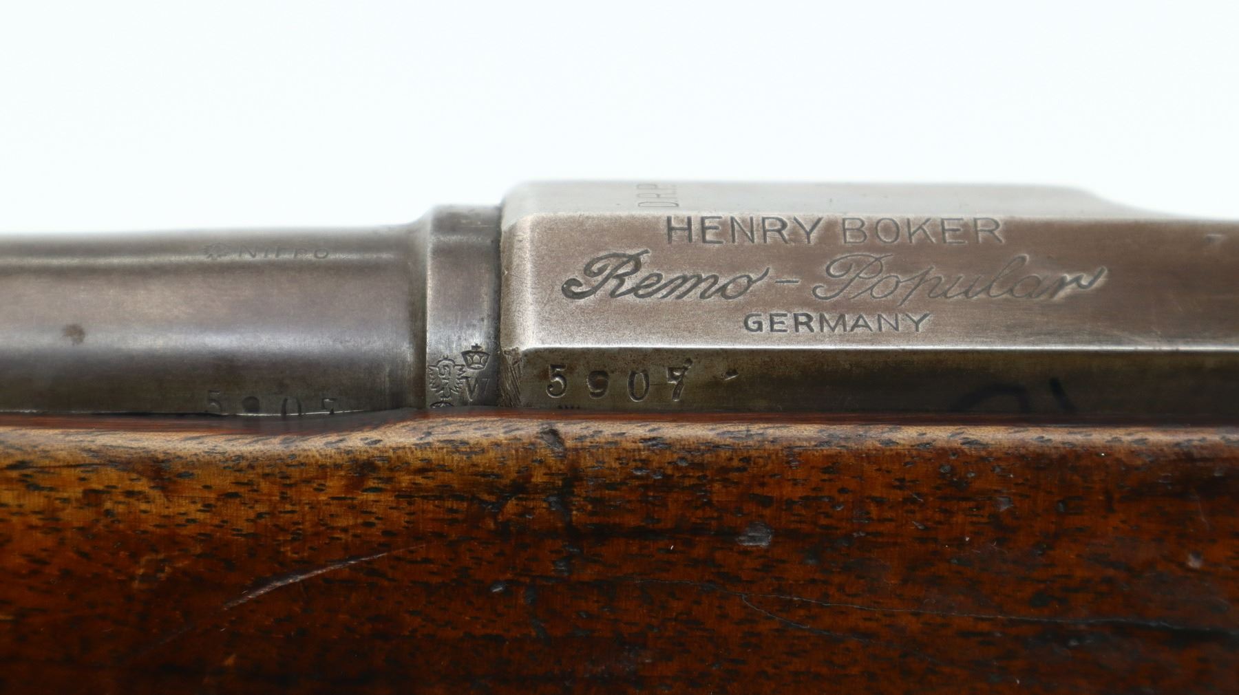 3/10 , HENRY BOKER , MODEL: REMO POPULAR , CALIBER: 12 GA X 2 3/4" , BORE IS FAIR, PITTED. FIXED FULL CHOKE. SILVER  BEAD, ROUND BARREL, HEX RECEIVER. ONE PIECE WOOD STOCK, CHECKERED PISTOL GRIP CRACKED AND REPAIRED BEHIND RECEIVER, BROWN VENTED RUBBER RECOIL PAD. METAL FINISH TURNED SILVER GREY WITH SCRATCHES, HANDLING MARKS AND WEAR. STOCK SHOWS DINGS, SCRATCHES AND FINISH WEAR.. ACTION: BOLT ACTION SHOTGUN. BARREL LENGTH: 30". CONDITION: 3/10. SERIAL # 5907. CLASS: CANADIAN NON RESTRICTED CLASS