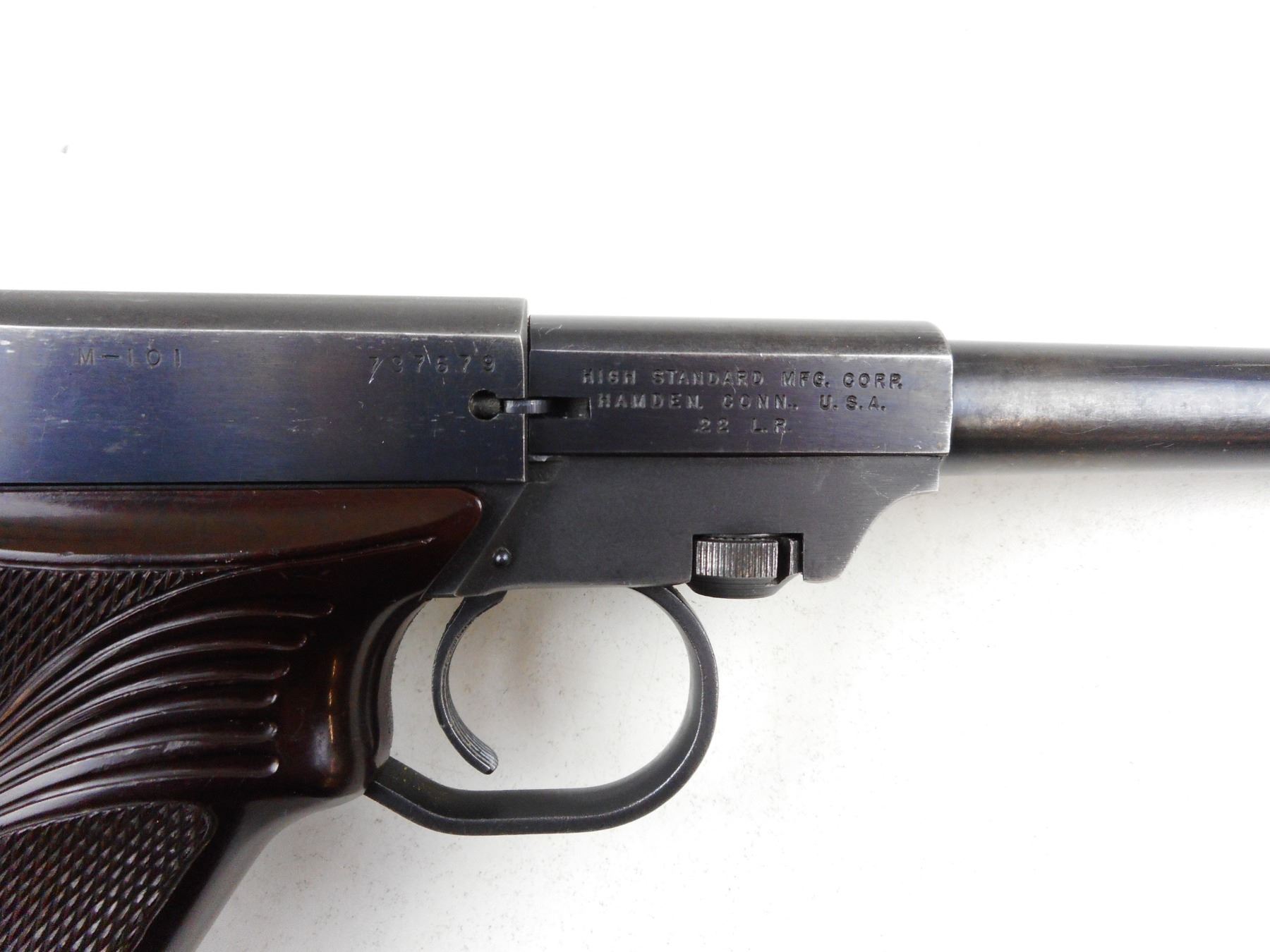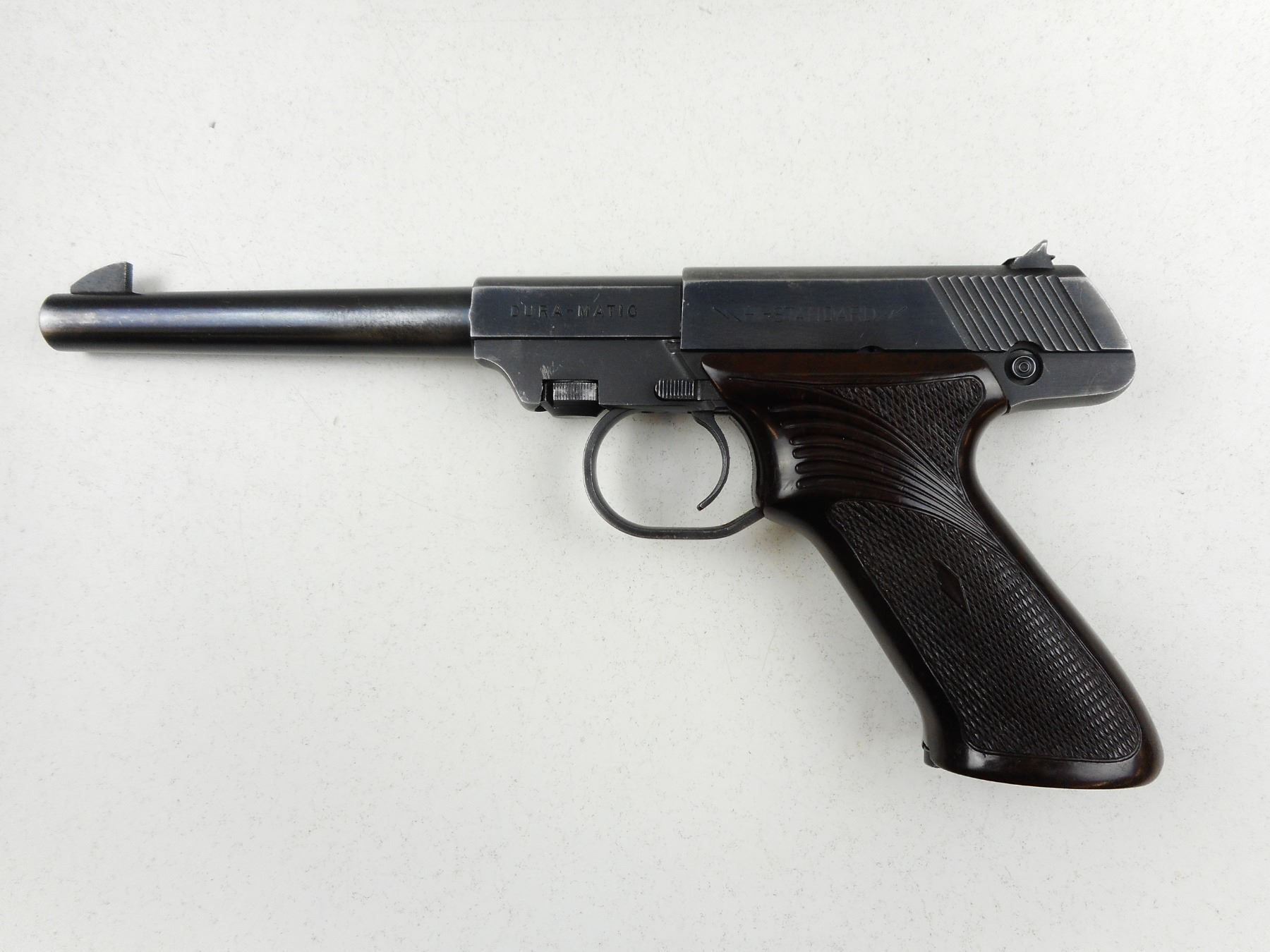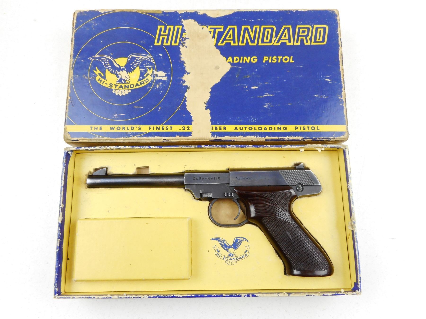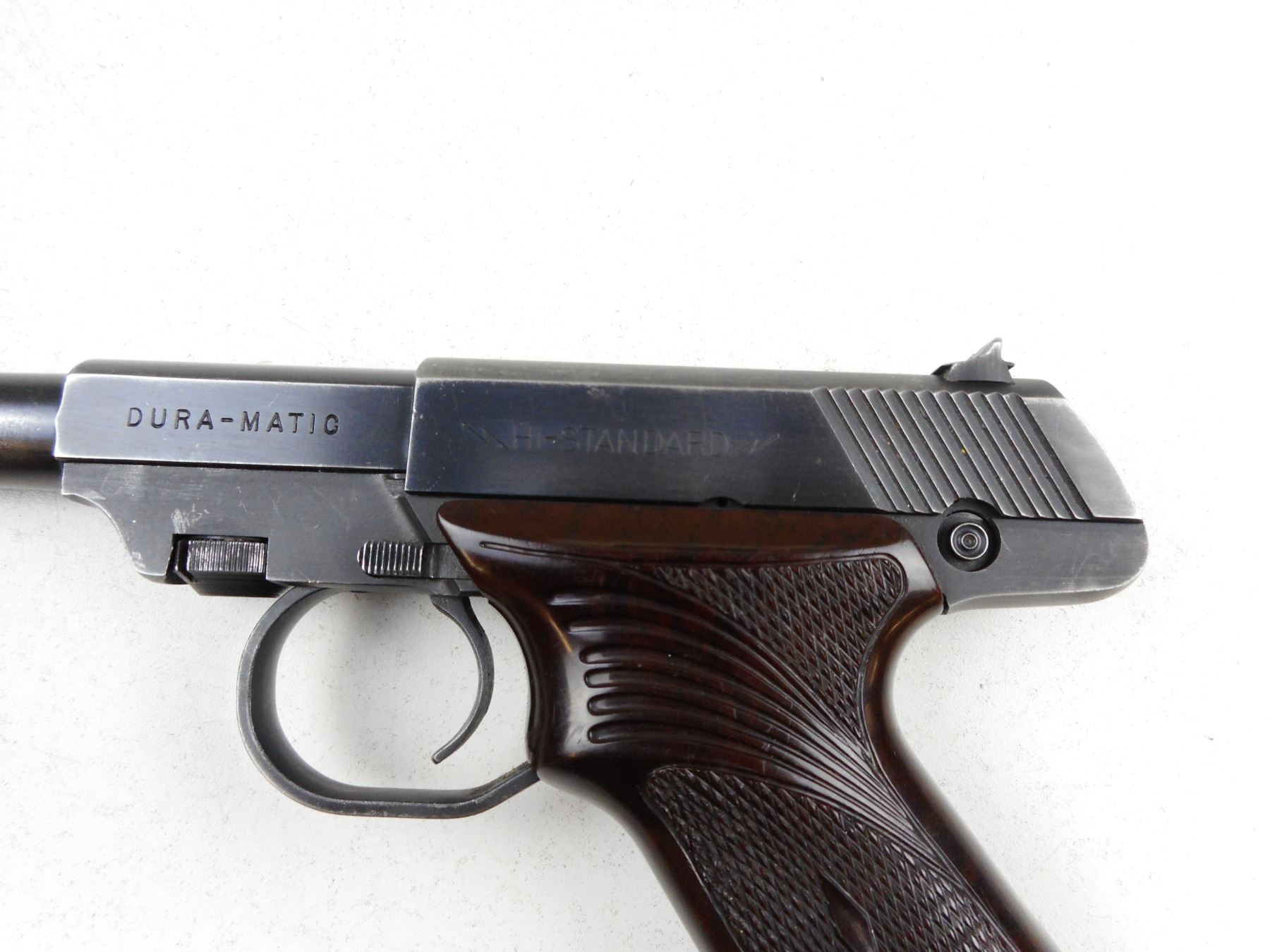 HIGH STANDARD , MODEL: DURA MATIC , CALIBER: 22LR , COMES WITH BOX AND MAGAZINE, BLUE FINISH SHOWING HOLSTER WEAR, NOTCH & BLADE SIGHTS, WRAP AROUND PLASTIC CHECKERED GRIPS, EXCELLENT BORE , ACTION: SEMI-AUTOMATIC , BARREL LENGTH: 165MM , CONDITION: 7/10 , STOCK # R2970 , SERIAL # 737679 , CLASS: CANADIAN RESTRICTED CLASS