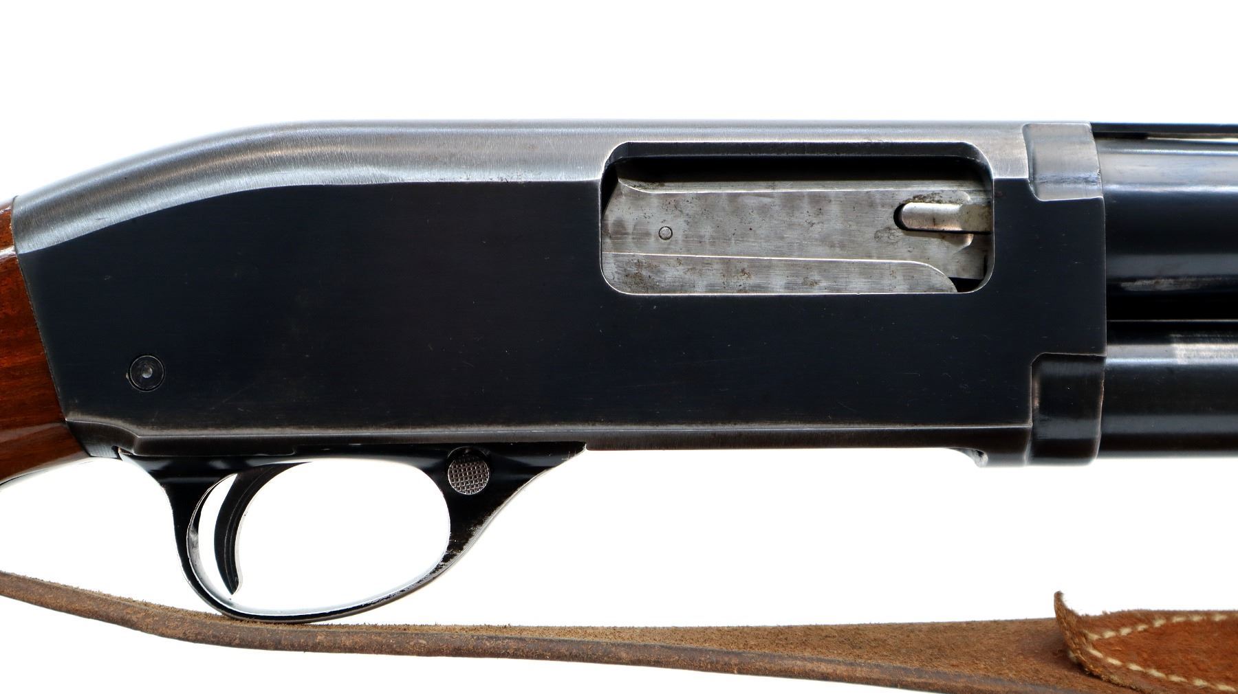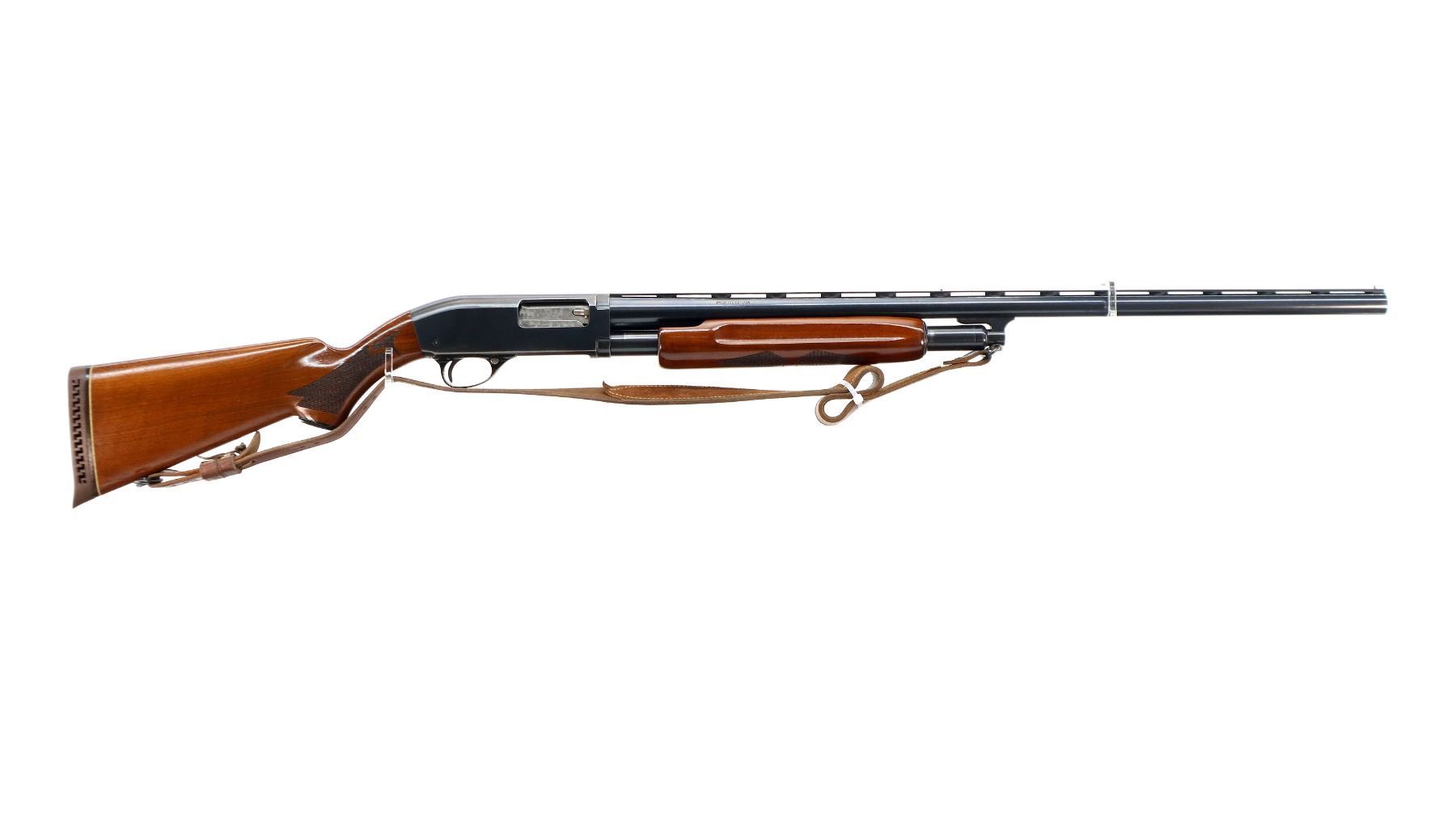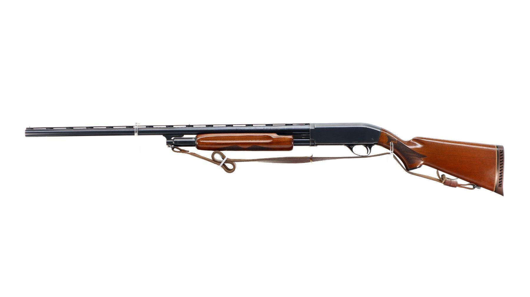 Main Description: Brass front and mid rib beads, polish blued finish vent rib, jewelled bolt. Two piece wood stocks, finger grooved checkered forearm and pistol grip, brown vented rubber recoil pad, 14.5" LOP, grip cap, sling swivels with brown leather sling.