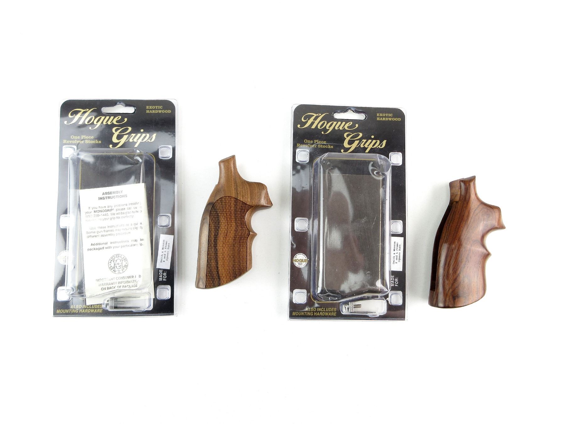 LOT INCLUDES; (2) PAIRS OF HOGUE S&W REVOLVER GRIPS, FITS K & L FRAME REVOLVERS, SQUARE BUTT, WOOD CONSTRUCTION, WITH MOUNTING HARDWARE, ORIGINAL PACKAGING. SEE PHOTOS.