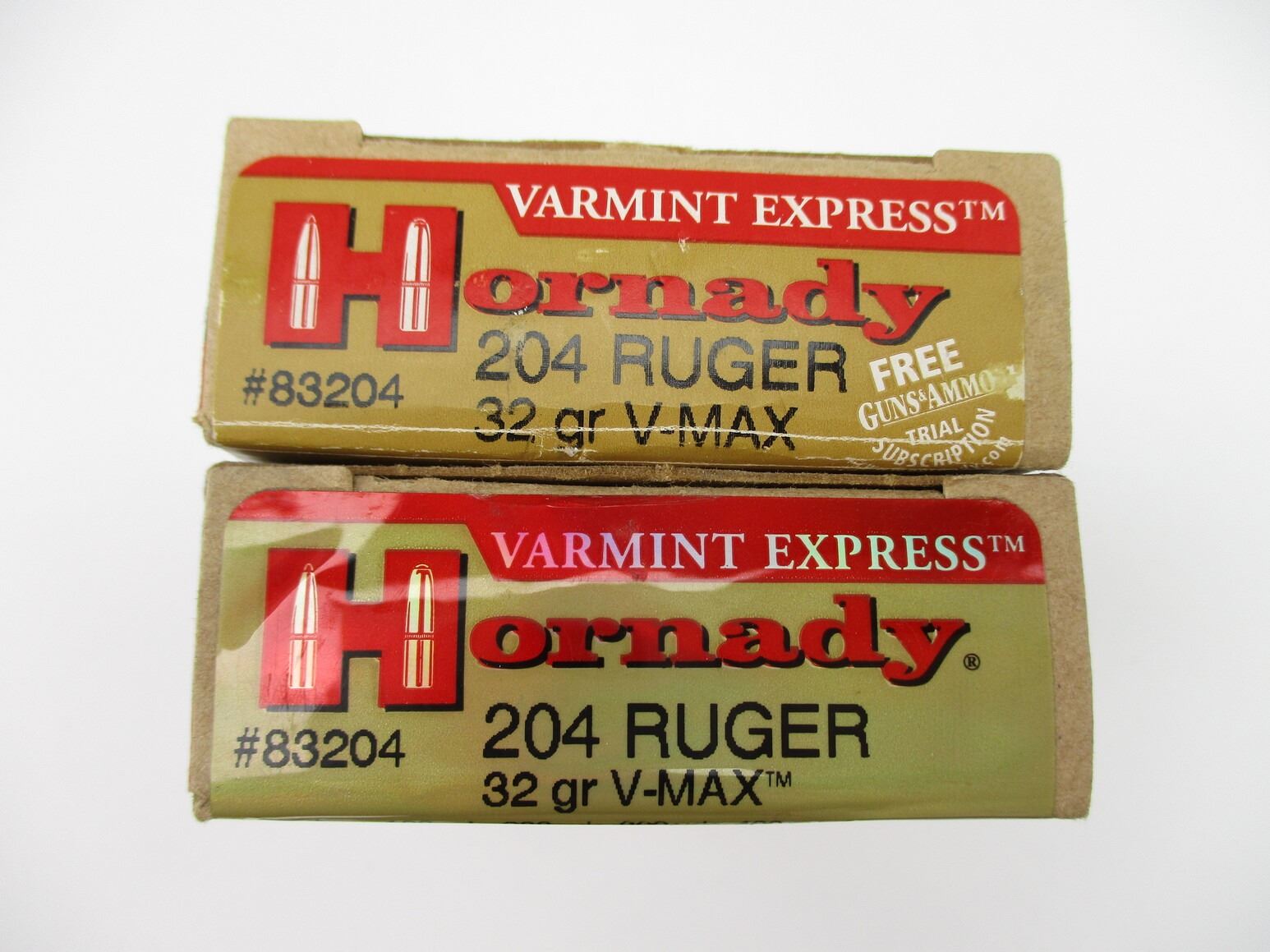HORNADY .204 RUGER AMMO LOT , 40 RNDS, V-MAX. , THERE ARE NEW SHIPPING RESTRICTIONS, PLEASE MAKE SURE YOU HAVE READ AND CONFIRMED WE CAN SHIP TO YOU BEFORE BIDDING ON THIS LOT. PLEASE SEE LOT 0 IN THIS SESSION. NO REFUNDS WILL BE ISSUED, OR BIDS RETRACTED.