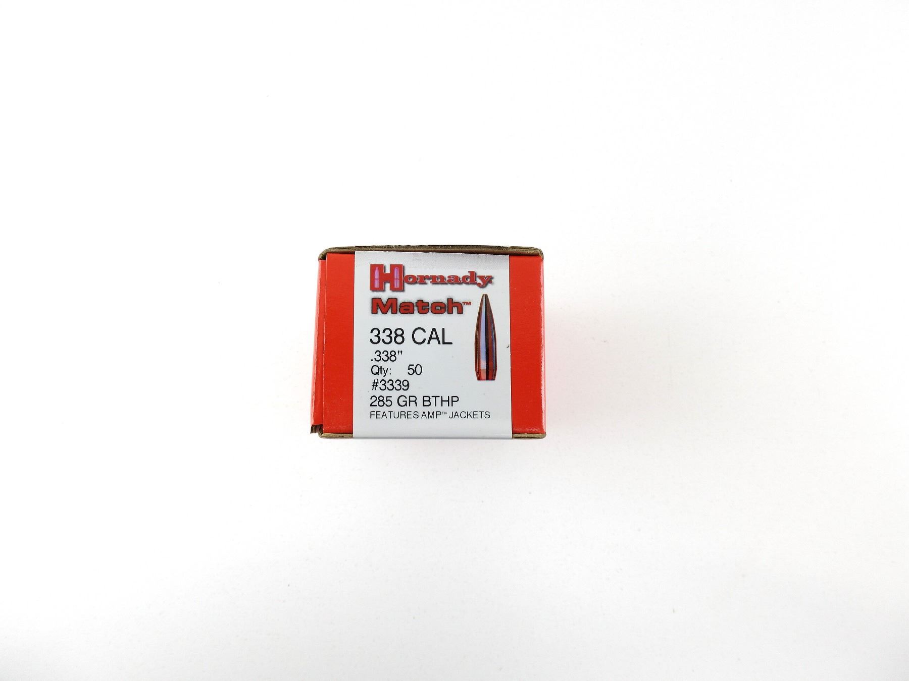 LOT INCLUDES; APPROX. (50) BULLETS, APPROX. DIA .338", 285 GRNS (STATED ON BOX NOT CONFIRMED), BTHP, UNOPENED.