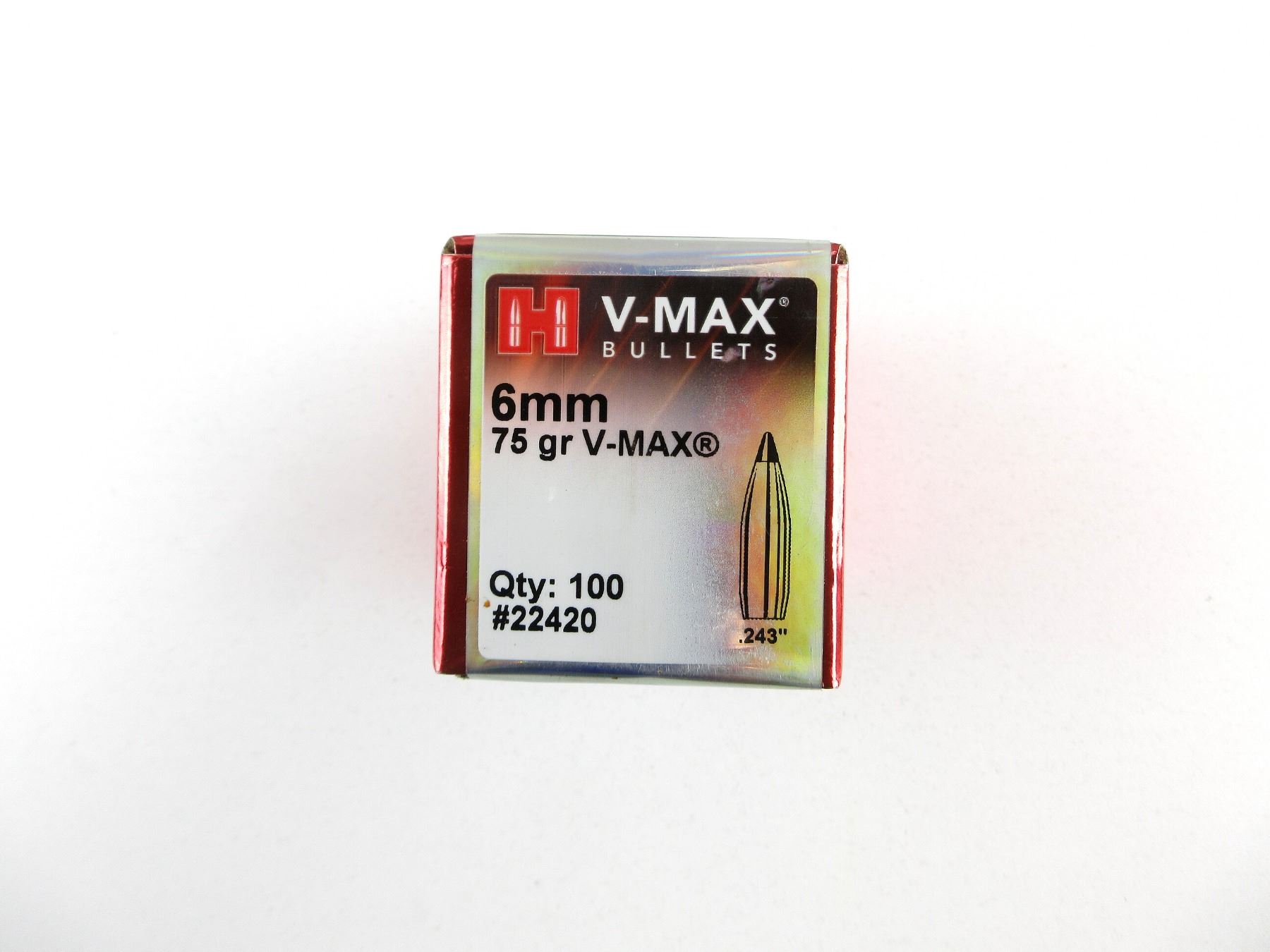 LOT INCLUDES; APPROX. (100) BULLETS, APPROX. DIA .243", 75 GRNS (STATED ON BOX NOT CONFIRMED), V-MAX, UNOPENED.