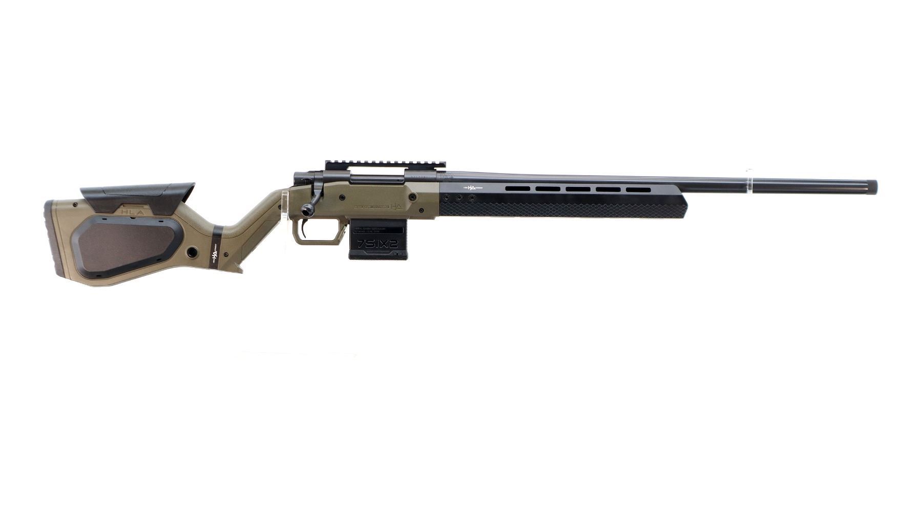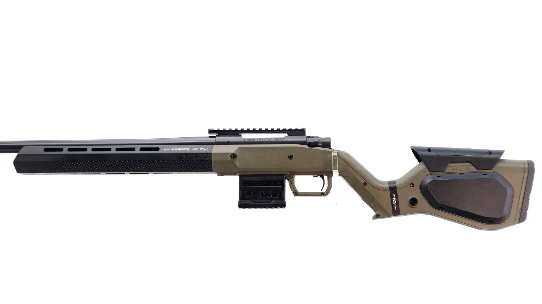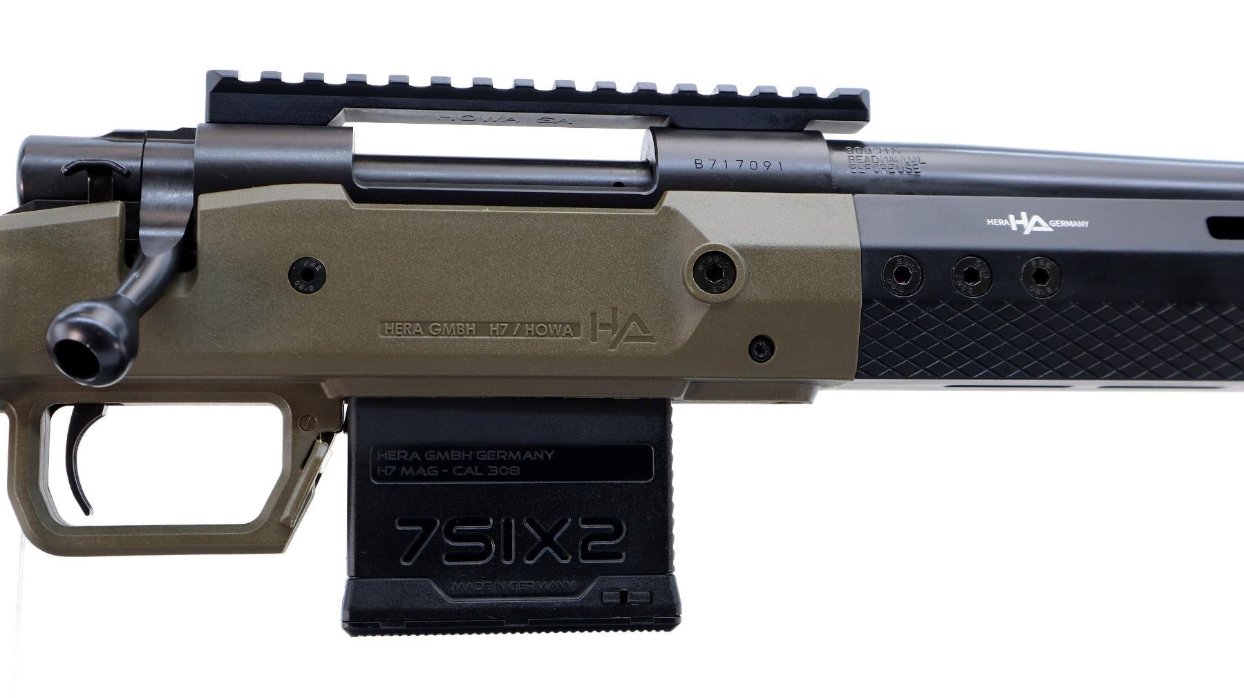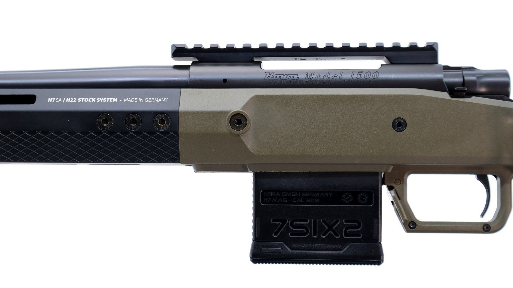 Main Description: No sights, Parkerized metal finish, heavy barrel threaded at muzzle with cap, receiver drilled and tapped with one piece scope base installed, smooth bolt knob. One piece Hera H7 SA/H22 black/ODG stock system, checkered ventilated black alloy forearm, textured pistol grip, raised cheek rest, stock has removable black polymer panels, grooved black rubber recoil pad, ambi mag release, rear QD swivel studs.