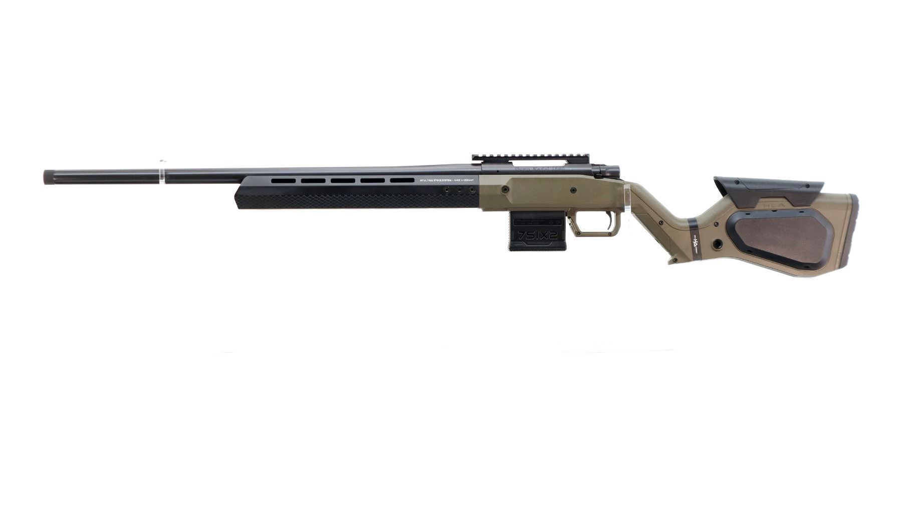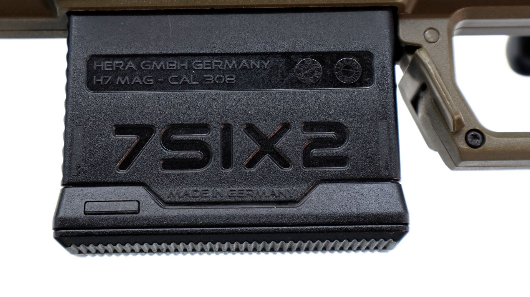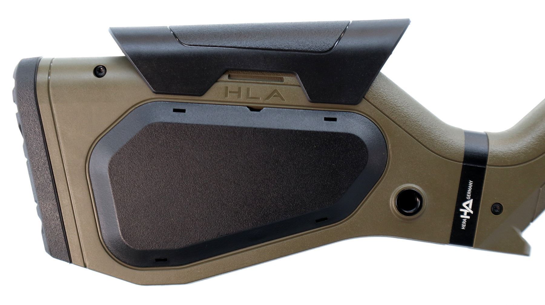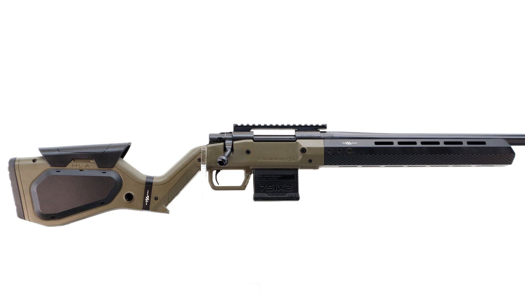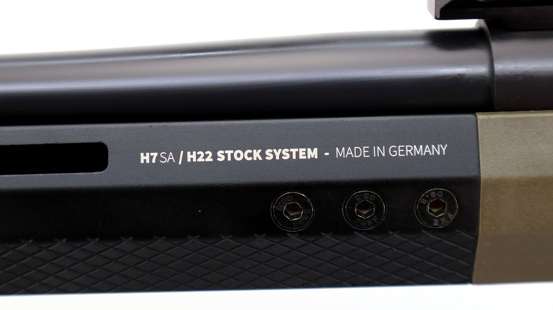Main Description: No sights, Parkerized metal finish, heavy barrel threaded at muzzle with cap, receiver drilled and tapped with one piece scope base installed, smooth bolt knob. One piece Hera H7 SA/H22 black/ODG stock system, checkered ventilated black alloy forearm, textured pistol grip, raised cheek rest, stock has removable black polymer panels, grooved black rubber recoil pad, ambi mag release, rear QD swivel studs.