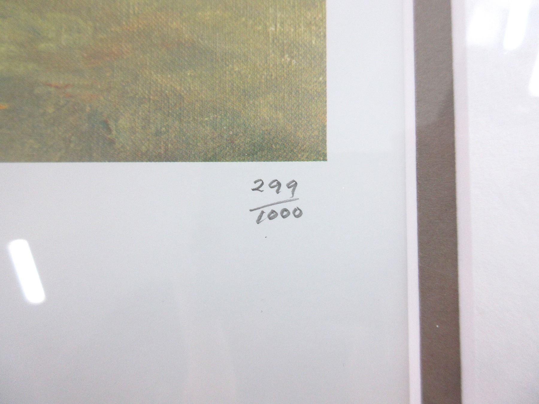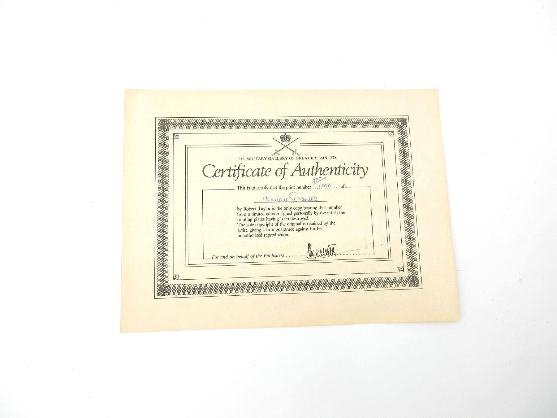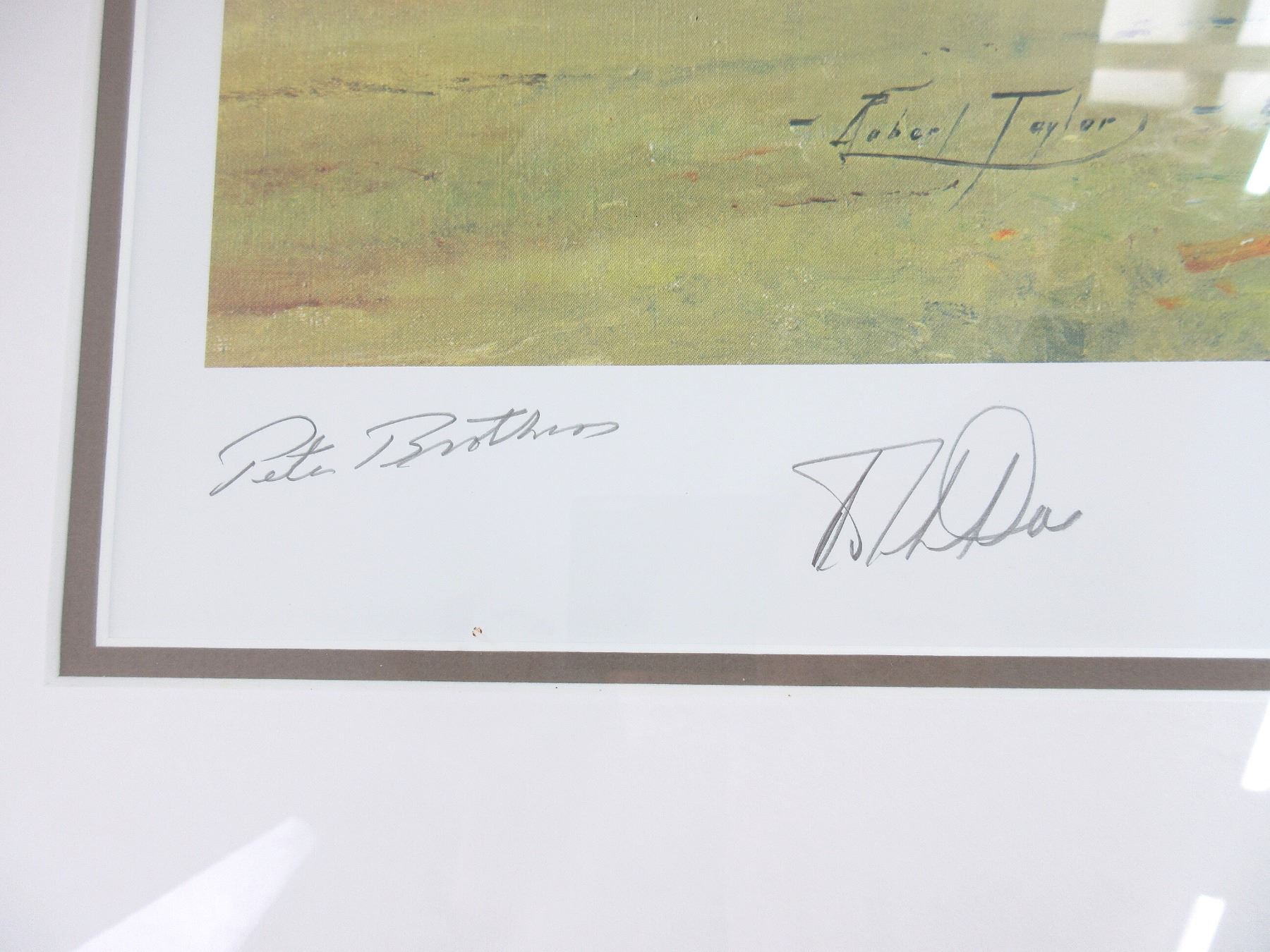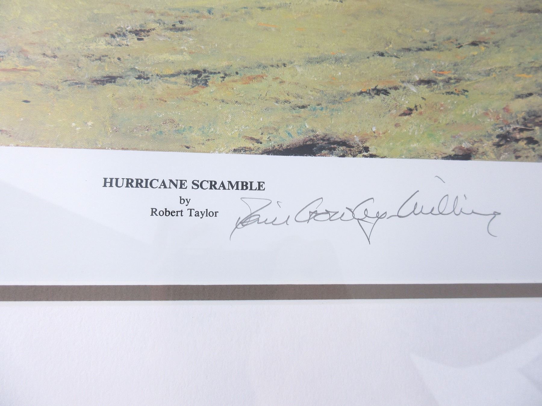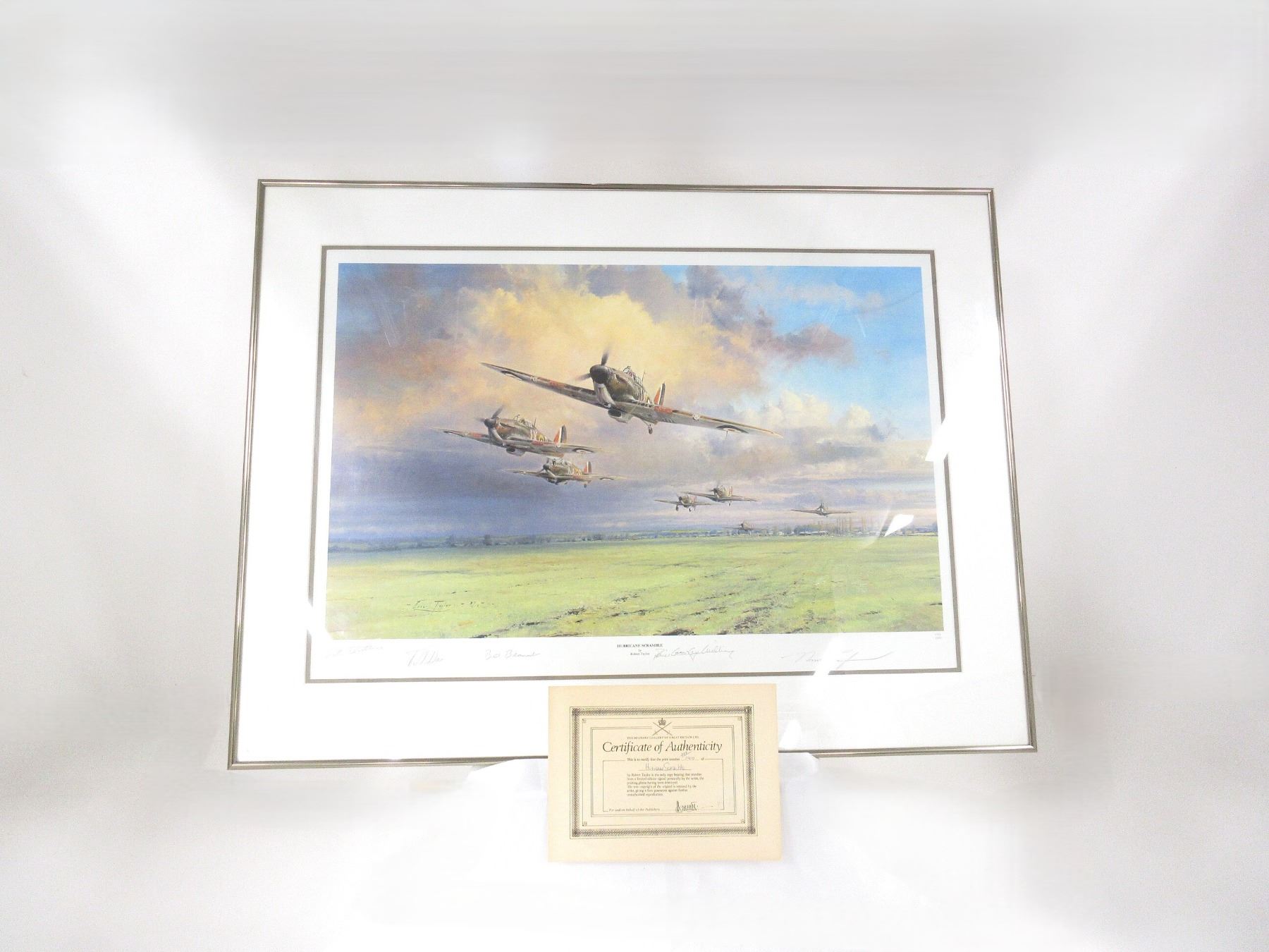 (1) PRINT BY ROBERT TAYLOR, VARIOUS SIGNATURES, PRINT NO. 299 / 1000, WITH CERTIFICATE OF AUTHENTICITY, PUBLISHED BY THE MILITARY GALLERY, BATH, ENGLAND, UNDER GLASS, METAL FRAME, FRAME APPROX. 37.75" X 28 5/8". SEE PHOTOS. *NO GUARANTEE ON GLASS FOR SHIPPING*