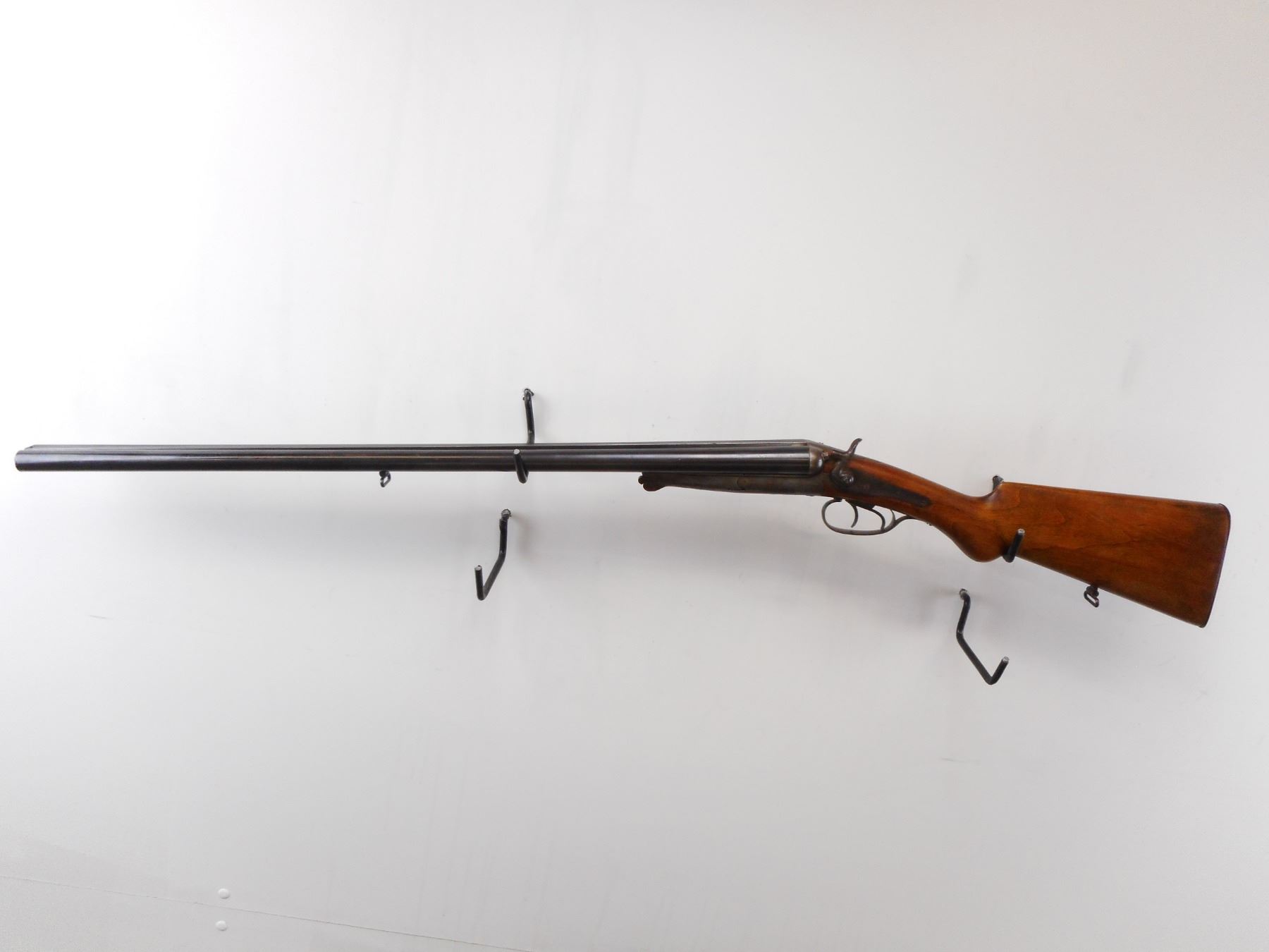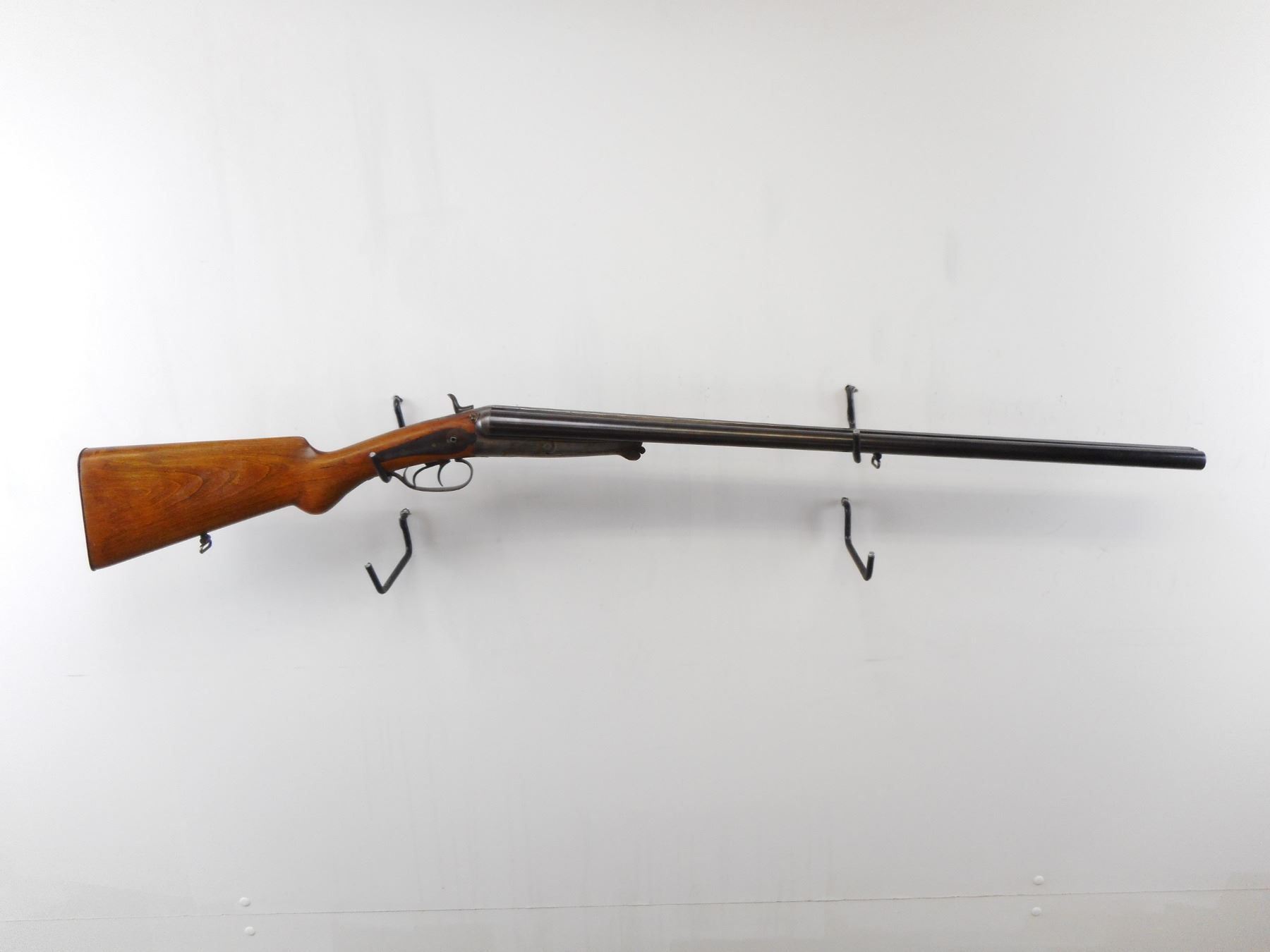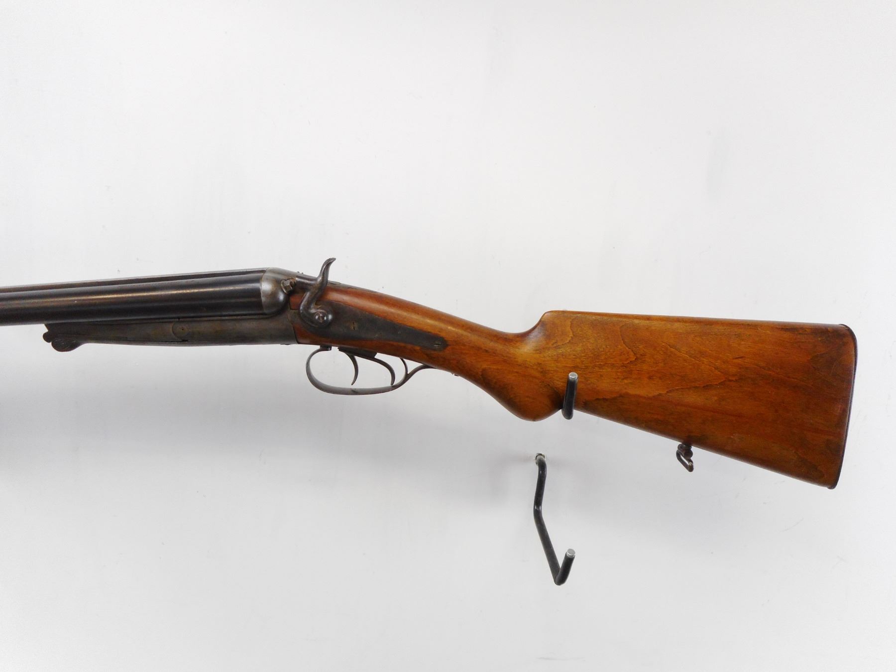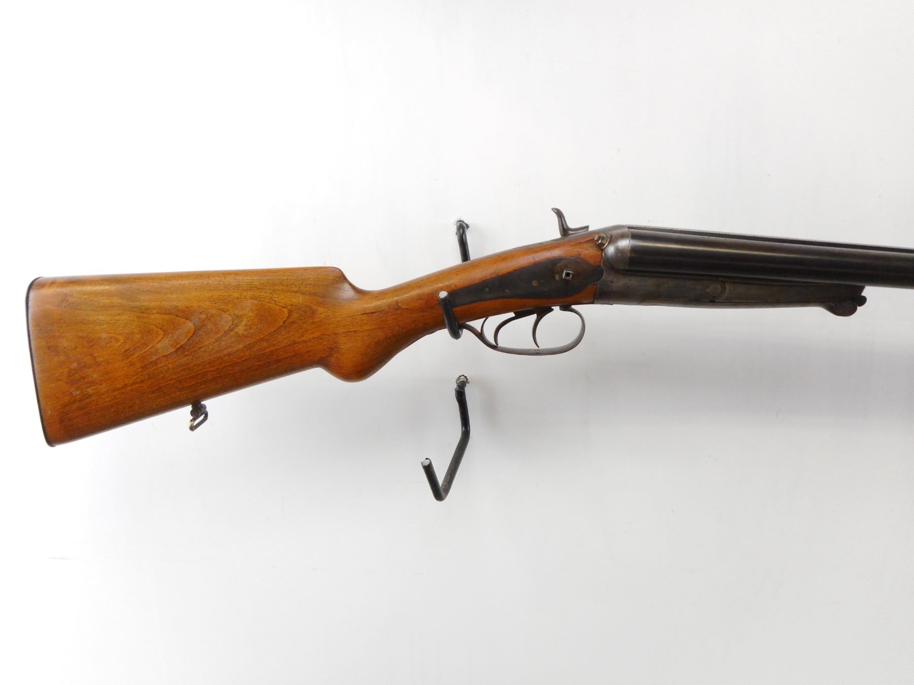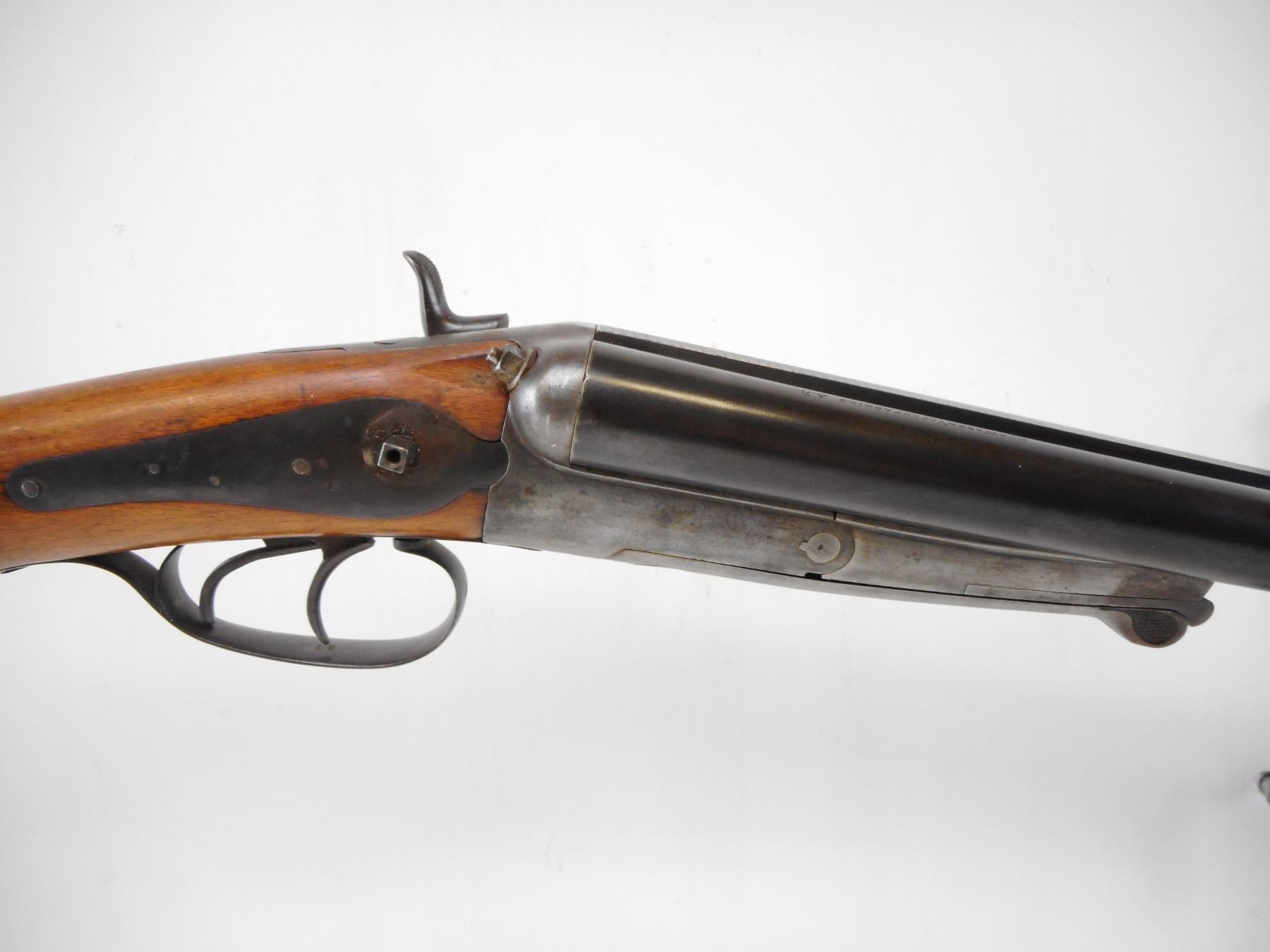 HUSQVARNA, MODEL: SIDE BY SIDE HAMMERGUN, CALIBER: 12 GA 2 5/8", BORES ARE GOOD. FIXED FULL CHOKES, BRASS BEAD, STEEL BARRELS, BACK ACTION LOCKS MISSING RIGHT SIDE HAMMER, EXTRACTOR, DOUBLE TRIGGERS. ONE PIECE SMOOTH PISTOL GRIP STOCK, SMOOTH STEEL BUTT PLATE, SWIVELS. METAL FINISH TURNING BROWN WITH HANDLING MARKS AND WEAR, STOCK WITH DINGS, SCRATCHES AND WEAR, ACTION: HINGE UNDERLEVER SHOTGUN, BARREL LENGTH: 29 1/2", CONDITION: 4/10, SERIAL # 190876, CLASS: CANADIAN NON RESTRICTED CLASS