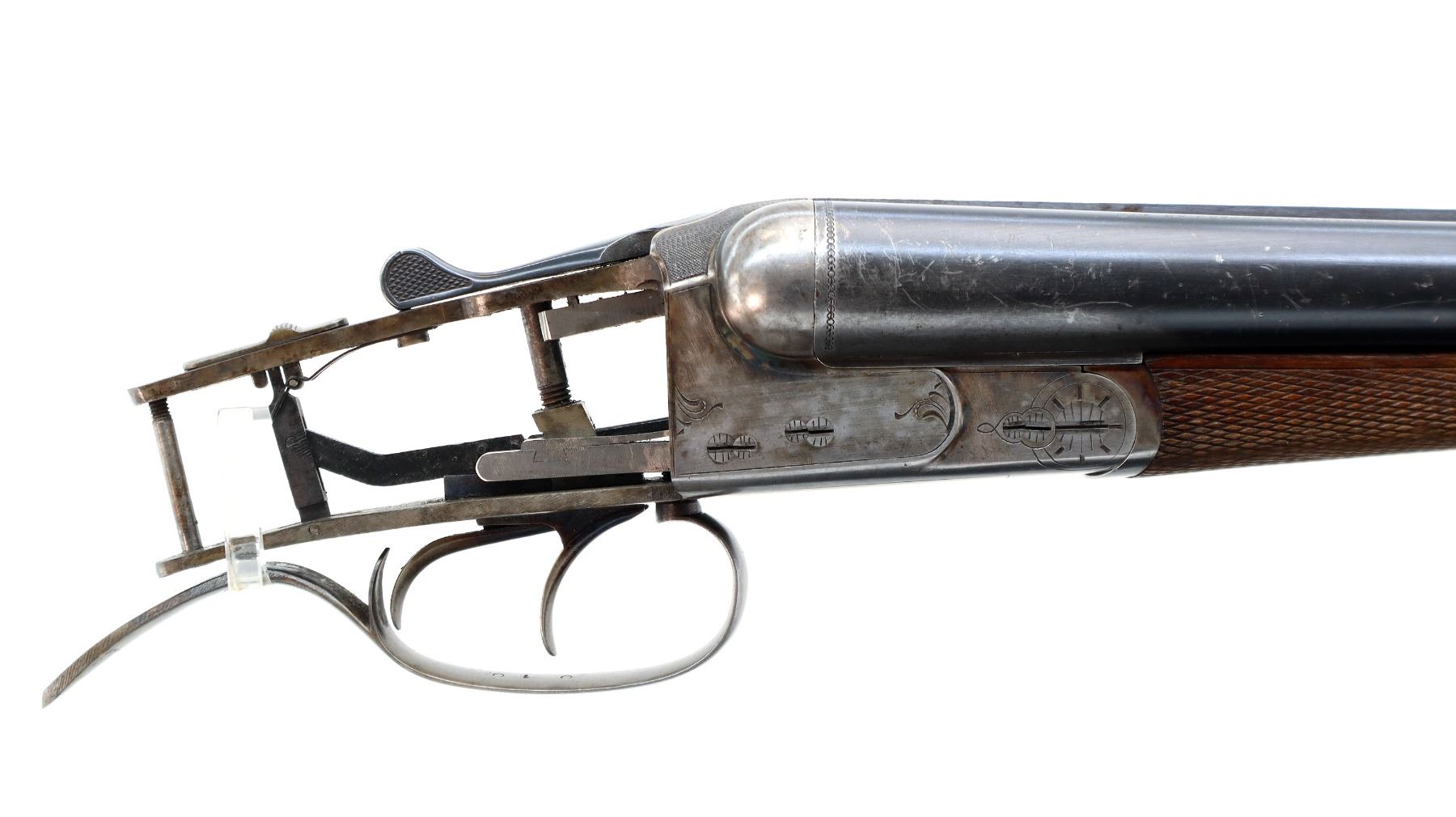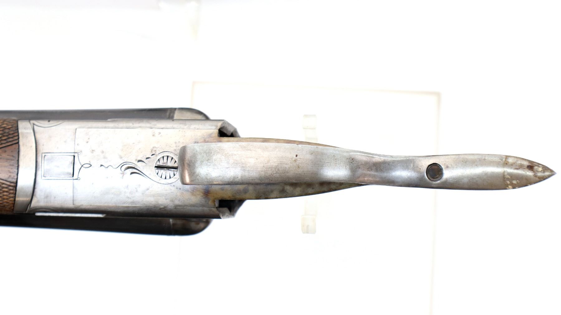 Main Description: Brass bead, blued barrels with solid rib painted white, also drilled and tapped with no plug screws. Colour case hardened receiver, includes opening lever, safety, hammers, sears, triggers, trigger guard. Action Does not function requires adjustment parts and repair. Has a one piece checkered wood forearm and front sling swivel. No other parts or stocks are included.