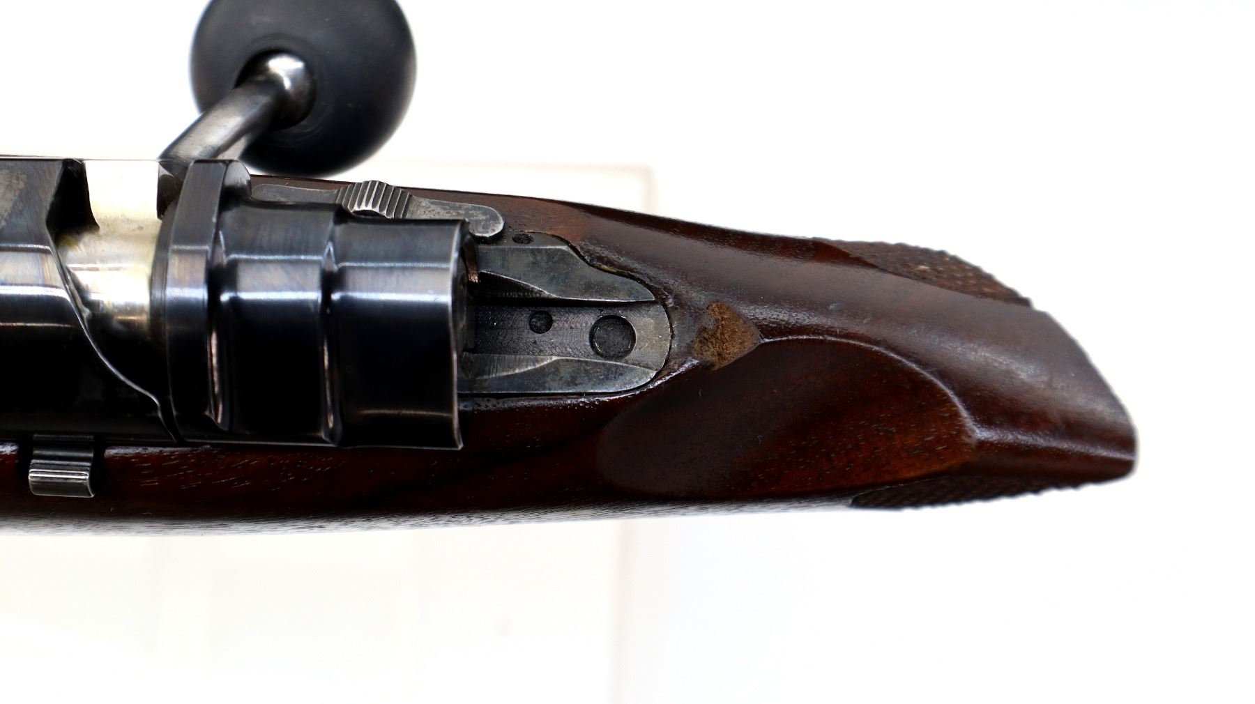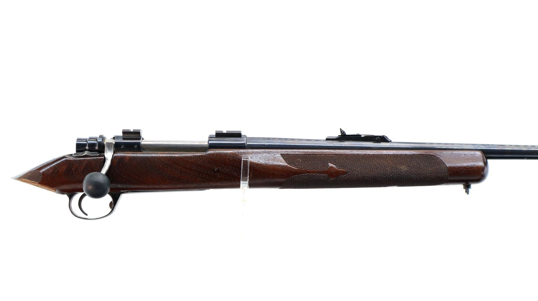 Main Description: Blade front sight with ramp, adjustable u notched rear sight, blued finish, receiver drilled and tapped with two piece scope bases installed, large black rubber bolt knob. One piece wood stock, checkered forearm. Includes broken butt stock with grip cap and cheek rest, missing butt plate and screws, hinged floor plate, missing front screw. Front sling swivel only.