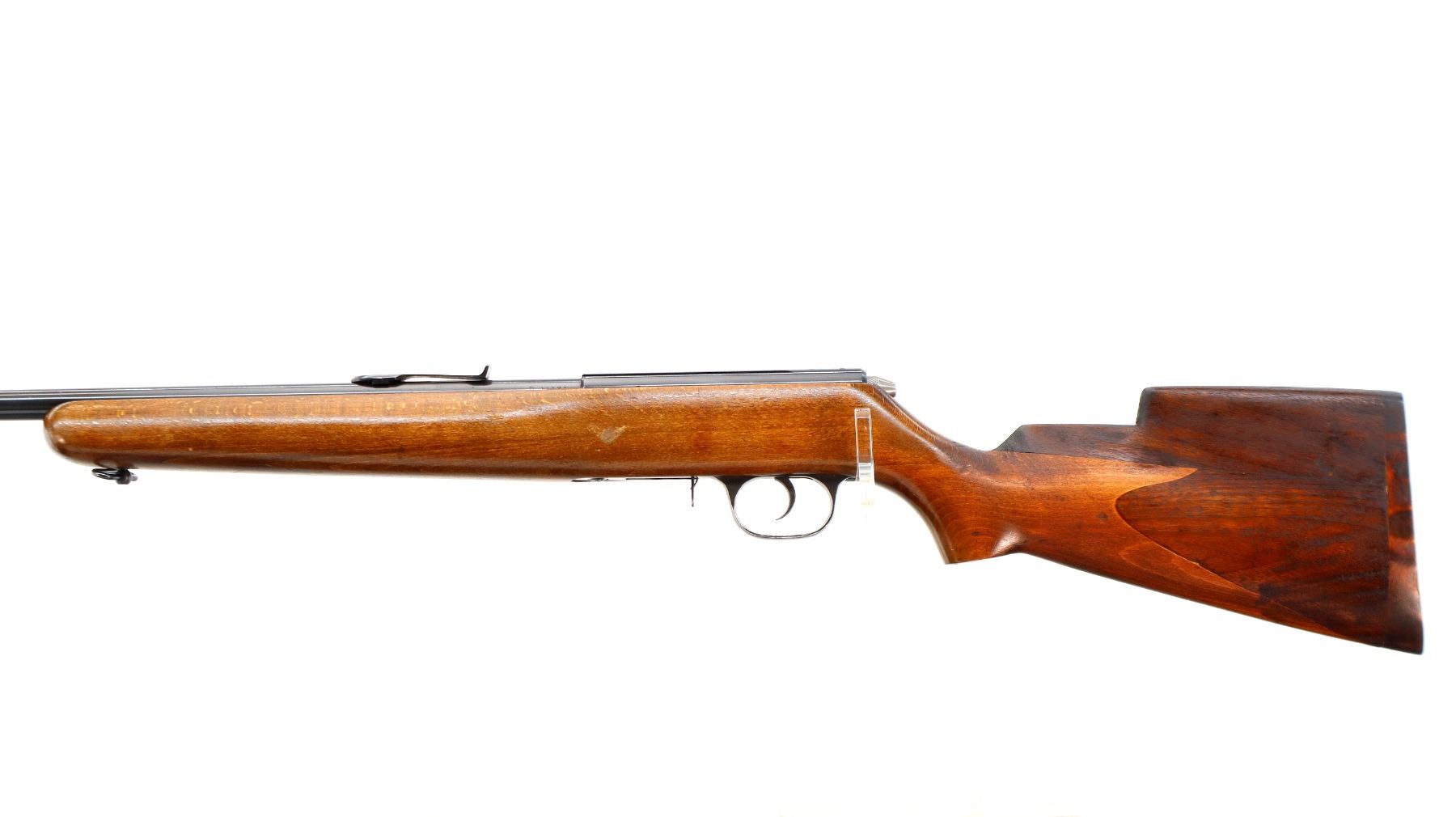 Main Description: Blade front sight, u notched rear sight missing elevator, blued finish, barrel is loose requires adjustment or repair, grooved receiver. One piece custom wood stock, pistol grip, custom modified raised comb, smooth butt plate with wood plugs, 13.5" LOP, front sling swivel only.