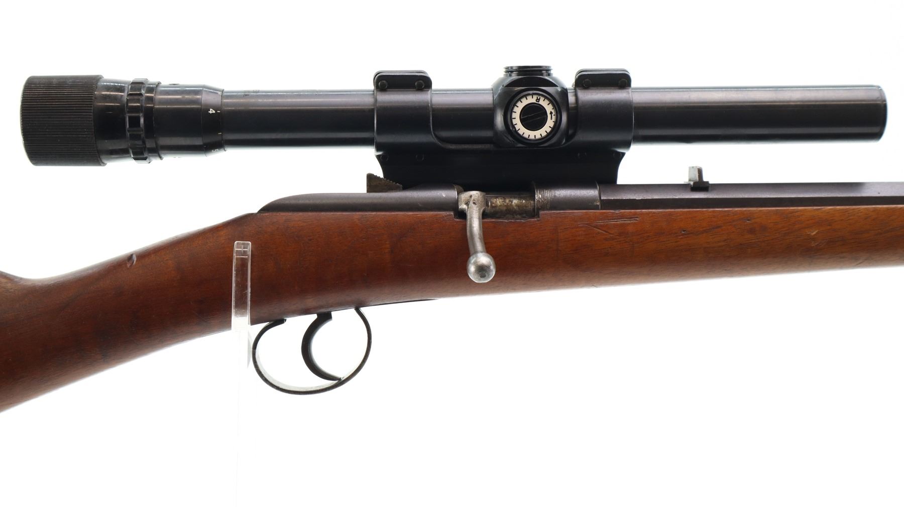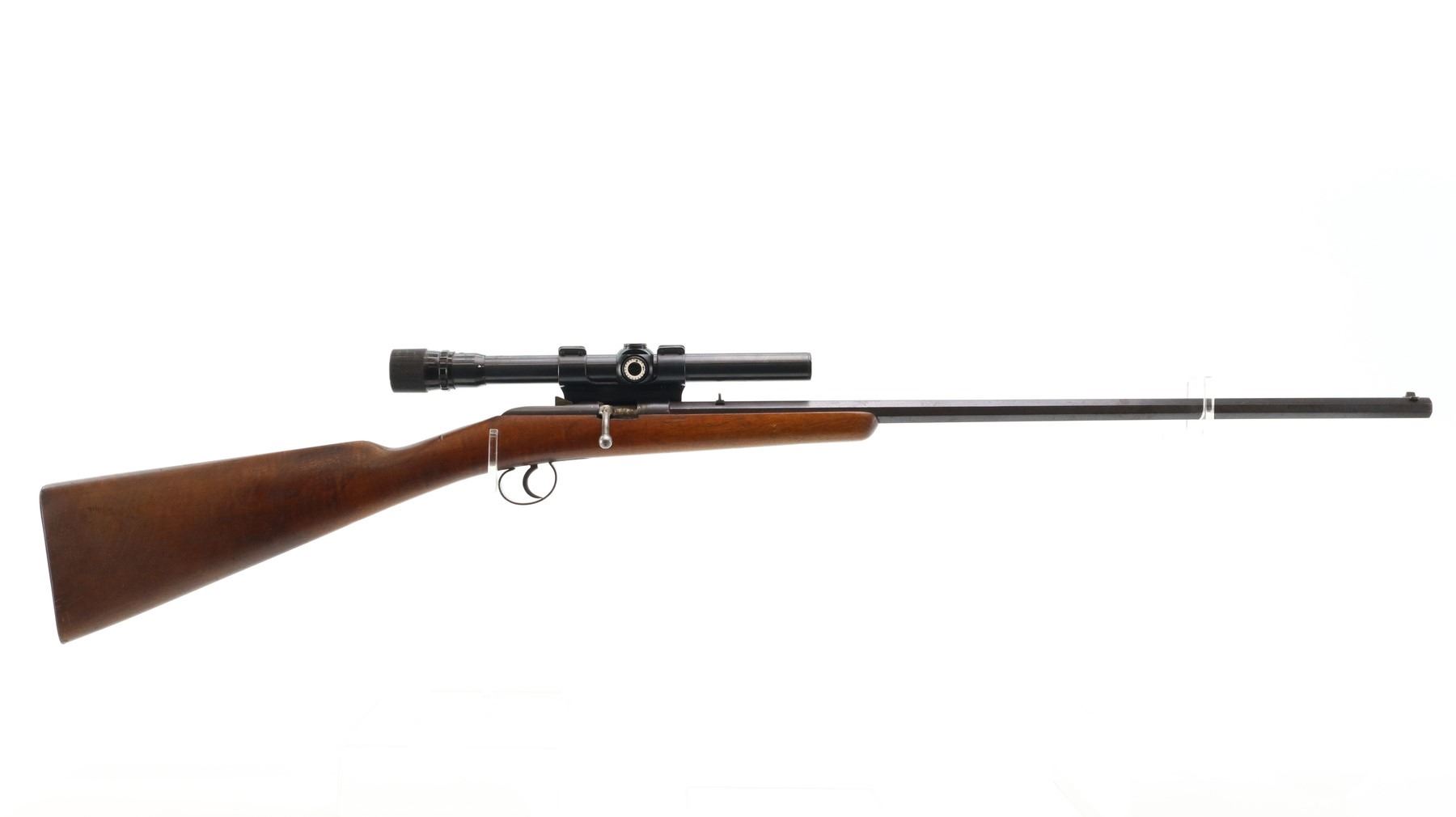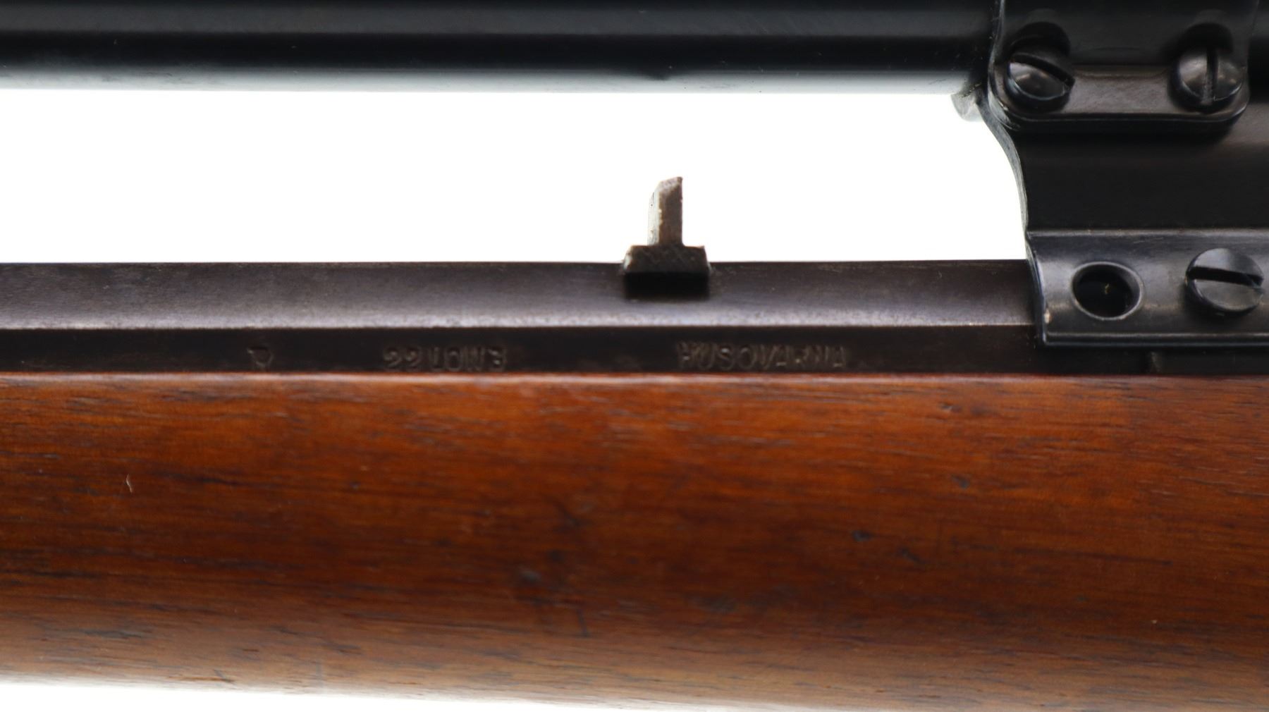 Main Description: Blade front sight, u notched rear sight, octagon barrel, receiver drilled and tapped with a weaver V22-a 3-6 scope, hazy optics with fine crosshair, smooth bolt knob. One piece smooth wood stock, straight grip, smooth steel butt plate.