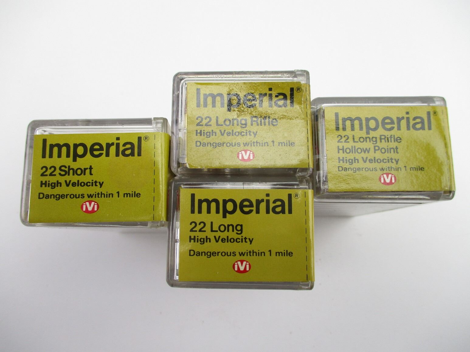 IMPERIAL ASSORTED .22 AMMO, 200 RNDS, INCLUDES: (100) LONG RIFLE HIGH VELOCITY, (50) LONG RIFLE HOLLOW POINT, & (50) SHORT HIGH VELOCITY. ALL BOXES ARE SEALED, THERE ARE NEW SHIPPING RESTRICTIONS, PLEASE MAKE SURE YOU HAVE READ AND CONFIRMED WE CAN SHIP TO YOU BEFORE BIDDING ON THIS LOT. PLEASE SEE LOT 0 IN THIS SESSION. NO REFUNDS WILL BE ISSUED, OR BIDS RETRACTED