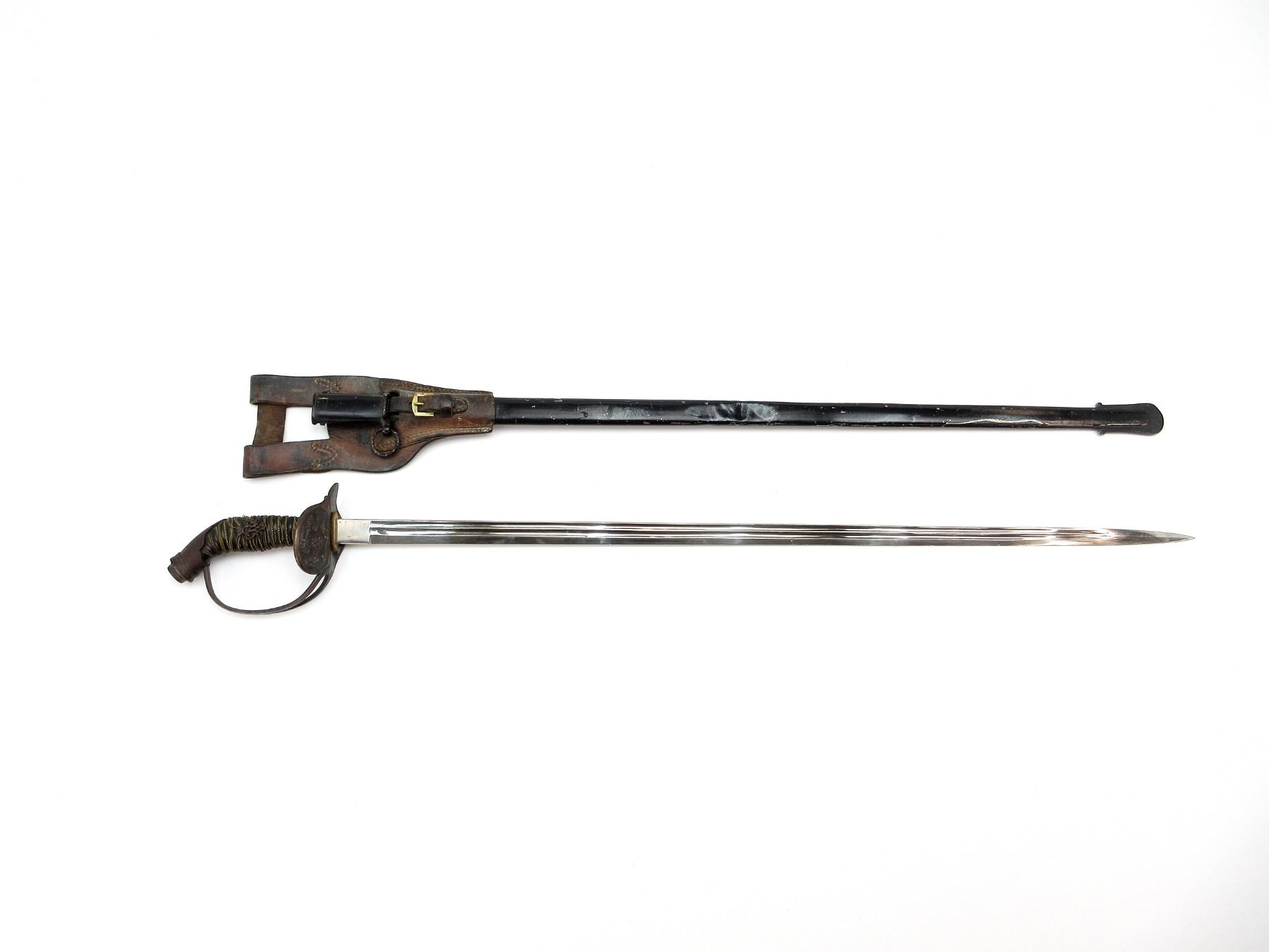 (1) DOUBLE-FULLERED PLATED BLADE, RICASSO MARKED: TWO SEATED SQUIRRELS BACK TO BACK OVER "C.E." (CARL EICKHORN), DARK FINISH FOLDING HAND-GUARD WITH PRUSSIAN EAGLE, WRII CYPHER ON HAND-GUARD, BRASS TRIPLE WIRE WRAPPED GRIP, WIRE SLIGHTLY LOOSE IN SPOTS, WRII CYPHER ON GRIP, DARK FINISH METAL POMMEL, NO VISIBLE MARKINGS, BLACK PAINTED SCABBARD WITH BROWN LEATHER FROG, NO VISIBLE MARKINGS, BLADE APPROX.31" & OAL APPROX. 37". SEE PHOTOS.