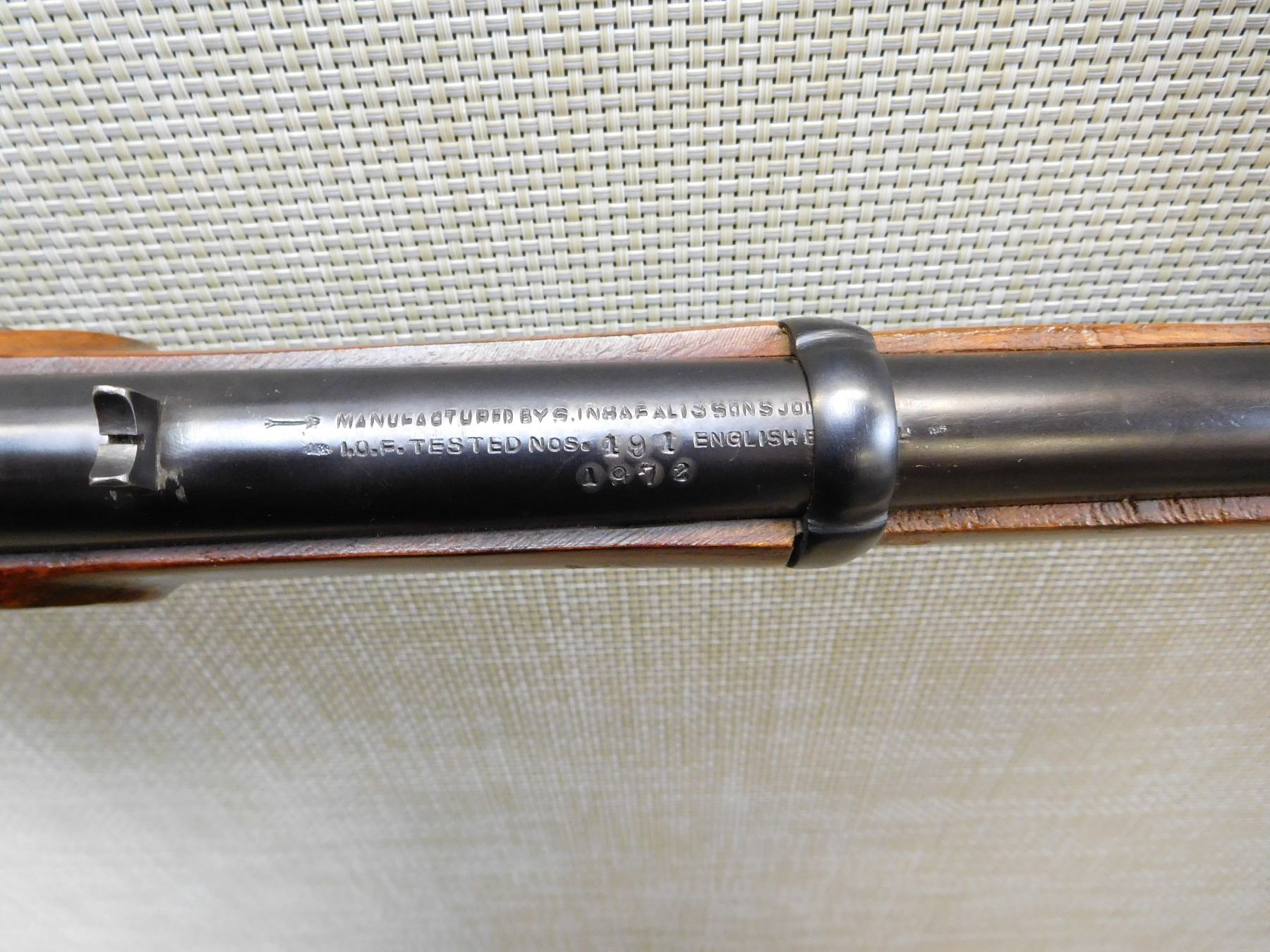 MADE IN 1972 IN INDIA, DOVETAIL FRONT AND FIXED REAR SIGHT, FIXED FULL CHOKE, BASED ON THE YOMANRY SADDLE RING CARBINE, RELACED RAM ROD, BRASS FURNITURE, SLING SWIVELS , ACTION: SINGLE SHOT , BARREL LENGTH: 21" , STOCK # 7318 , SERIAL # 191 , CONDITION: 6/10 , CLASS: CANADIAN NON RESTRICTED CLASS