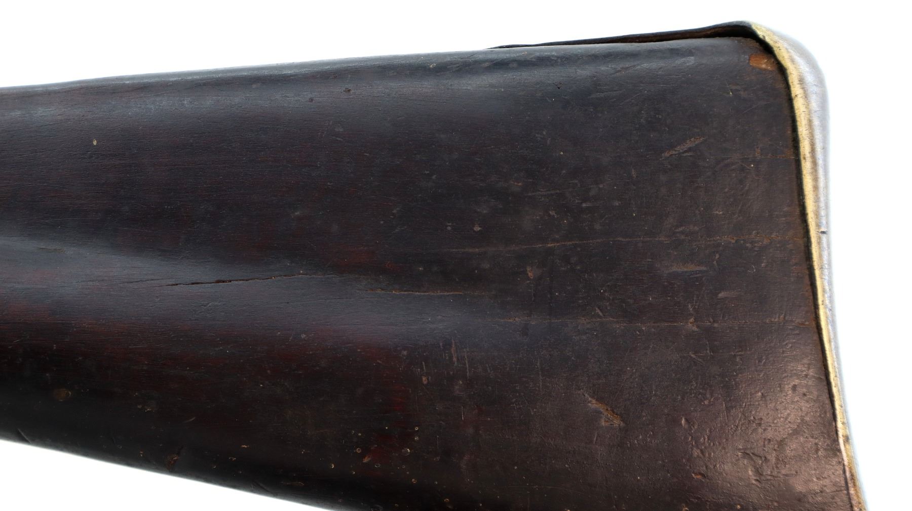 Main Description: Block front sight, black painted tapered round barrel, smooth lock with faint markings, hammer functions, frizzen is loose with no spring tension. One piece black painted full military wood stock, chipped and cracked in various spots, straight grip, smooth brass butt plate, tacks on right side, stock has some age cracks, brass trigger guard, steel ramrod, missing nose cap.